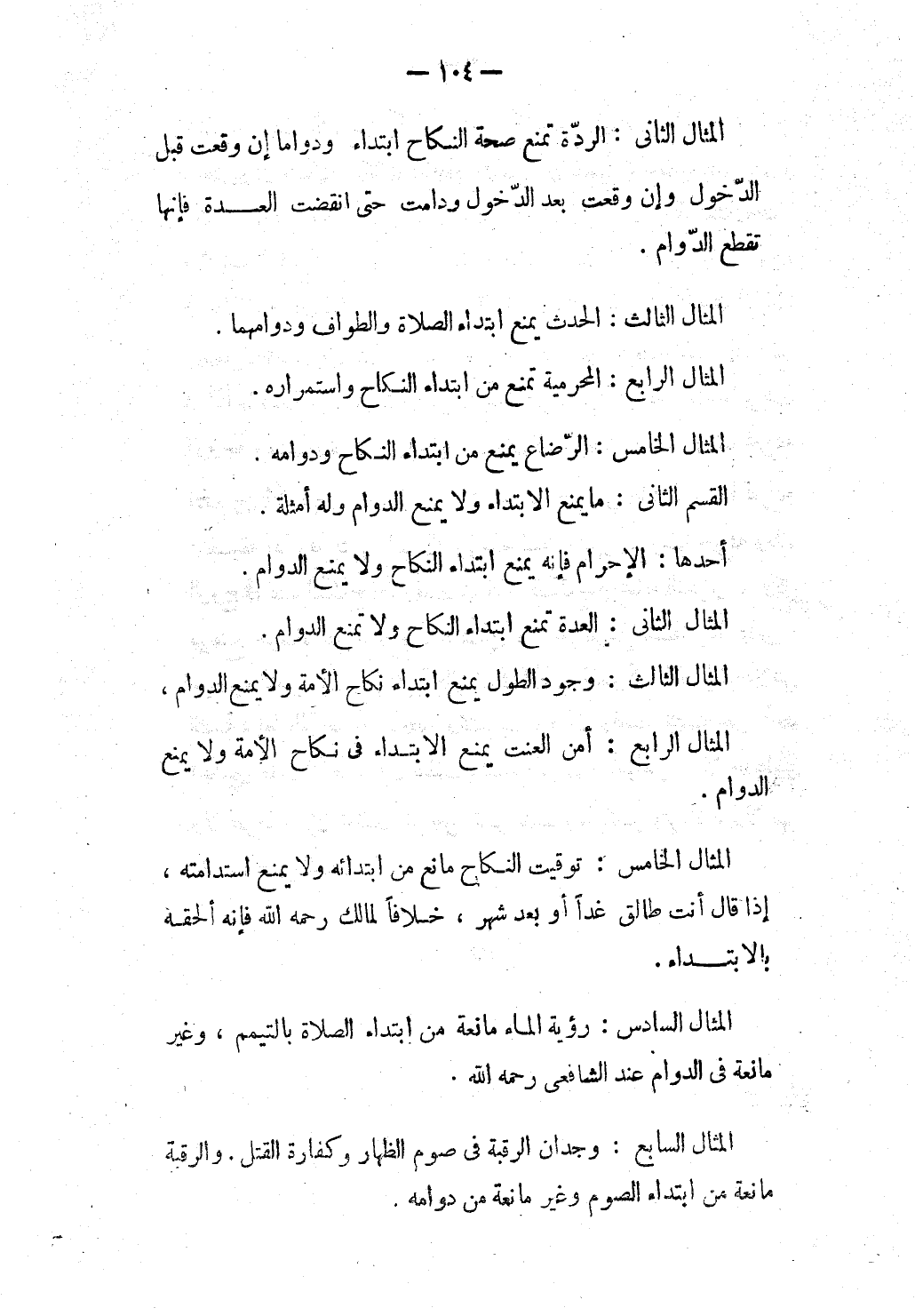 الْمِثَالُ الثَّالِثُ: وُجُودُ الطُّولِ يَمْنَعُ ابْتِدَاءَ نِكَاحِ الْأَمَةِ وَلَا يَمْنَعُ الدَّوَامَ، الْمِثَالُ الرَّابِعُ: أَمْنُ الْعَنَتِ يَمْنَعُ الِابْتِدَاءَ فِي نِكَاحِ الْأَمَةِ وَلَا يَمْنَعُ الدَّوَامَ.