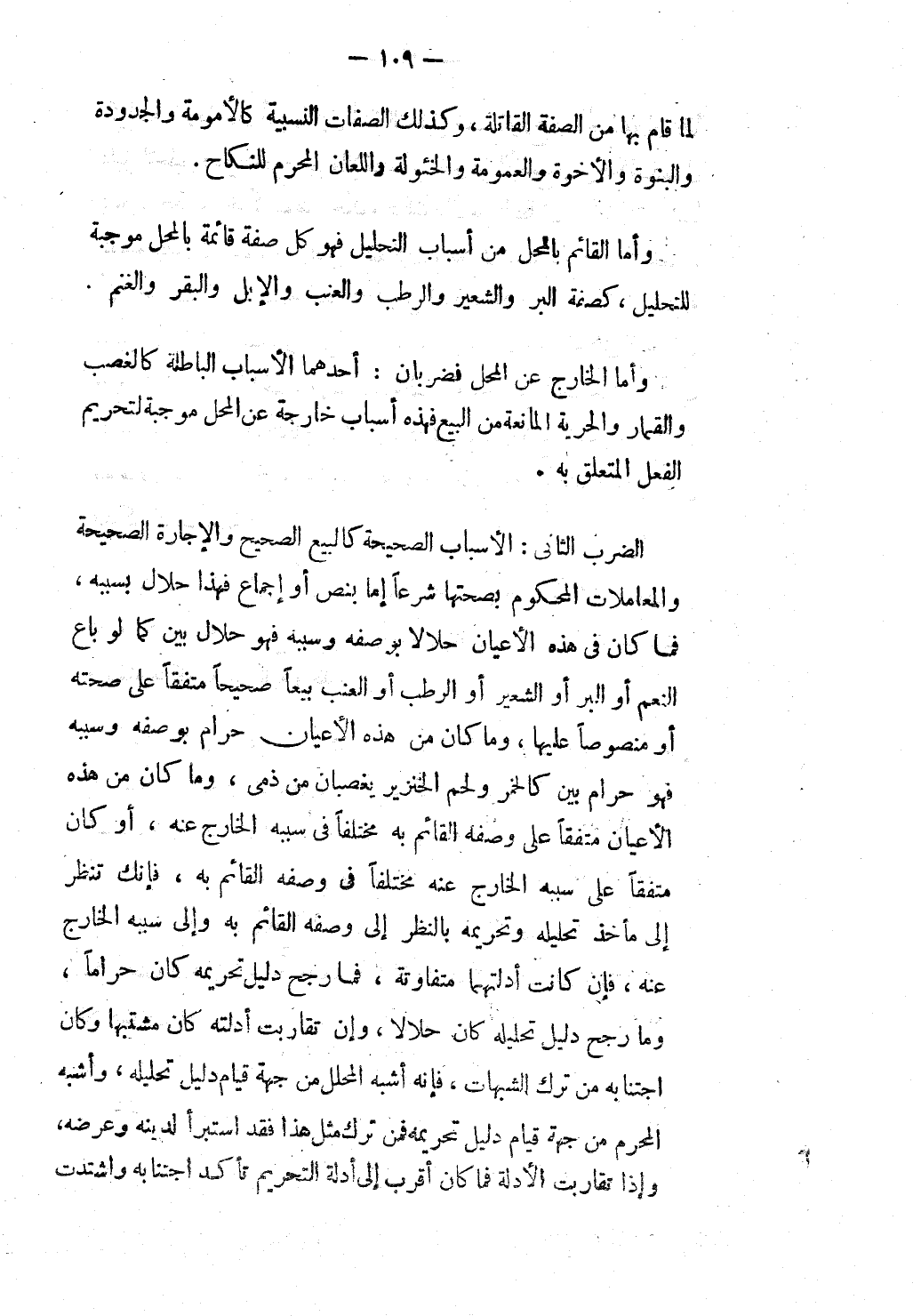 الضَّرْبُ الثَّانِي: الْأَسْبَابُ الصَّحِيحَةُ كَالْبَيْعِ الصَّحِيحِ وَالْإِجَارَةِ الصَّحِيحَةِ وَالْمُعَامَلَاتِ الْمَحْكُومِ بِصِحَّتِهَا شَرْعًا إمَّا بِنَصٍّ أَوْ إجْمَاعٍ فَهَذَا حَلَالٌ بِسَبَبِهِ، فَمَا كَانَ فِي هَذِهِ الْأَعْيَانِ حَلَالًا بِوَصْفِهِ وَسَبَبِهِ فَهُوَ حَلَالٌ بَيِّنٌ كَمَا لَوْ بَاعَ النَّعَمَ أَوْ الْبُرَّ أَوْ الشَّعِيرَ أَوْ الرُّطَبَ أَوْ الْعِنَبَ بَيْعًا صَحِيحًا مُتَّفَقًا عَلَى صِحَّتِهِ أَوْ مَنْصُوصًا عَلَيْهَا، وَمَا كَانَ مِنْ هَذِهِ الْأَعْيَانِ حَرَامٌ بِوَصْفِهِ وَسَبَبِهِ فَهُوَ حَرَامٌ بَيِّنٌ كَالْخَمْرِ وَلَحْمِ الْخِنْزِيرِ يُغْصَبَانِ مِنْ ذِمِّيٍّ، وَمَا كَانَ مِنْ هَذِهِ الْأَعْيَانِ مُتَّفَقًا عَلَى وَصْفِهِ الْقَائِمِ بِهِ مُخْتَلَفًا فِي سَبَبِهِ الْخَارِجِ عَنْهُ، أَوْ كَانَ مُتَّفَقًا عَلَى سَبَبِهِ الْخَارِجِ عَنْهُ مُخْتَلَفًا فِي وَصْفِهِ الْقَائِمِ بِهِ، فَإِنَّك تَنْظُرُ إلَى مَأْخَذِ تَحْلِيلِهِ وَتَحْرِيمِهِ بِالنَّظَرِ إلَى وَصْفِهِ الْقَائِمِ بِهِ وَإِلَى سَبَبِهِ الْخَارِجِ عَنْهُ، فَإِنْ كَانَتْ أَدِلَّتُهُمَا مُتَفَاوِتَةٌ، فَمَا رَجَحَ دَلِيلُ تَحْرِيمِهِ كَانَ حَرَامًا، وَمَا رَجَحَ دَلِيلُ تَحْلِيلِهِ كَانَ حَلَالًا، وَإِنْ تَقَارَبَتْ أَدِلَّتُهُ كَانَ مُشْتَبَهًا وَكَانَ اجْتِنَابُهُ مِنْ تَرْكِ الشُّبُهَاتِ، فَإِنَّهُ أَشْبَهُ الْمُحَلِّلِ مِنْ جِهَةِ قِيَامِ دَلِيلِ تَحْلِيلِهِ، وَأَشْبَهَ الْمُحَرَّمَ مِنْ جِهَةِ قِيَامِ دَلِيلِ تَحْرِيمِهِ فَمَنْ تَرَكَ مِثْلَ هَذَا فَقَدْ اسْتَبْرَأَ لِدِينِهِ وَعِرْضِهِ، وَإِذَا تَقَارَبَتْ الْأَدِلَّةُ فَمَا كَانَ أَقْرَبُ إلَى أَدِلَّةِ التَّحْرِيمِ تَأَكَّدَ اجْتِنَابُهُ وَاشْتَدَّتْ