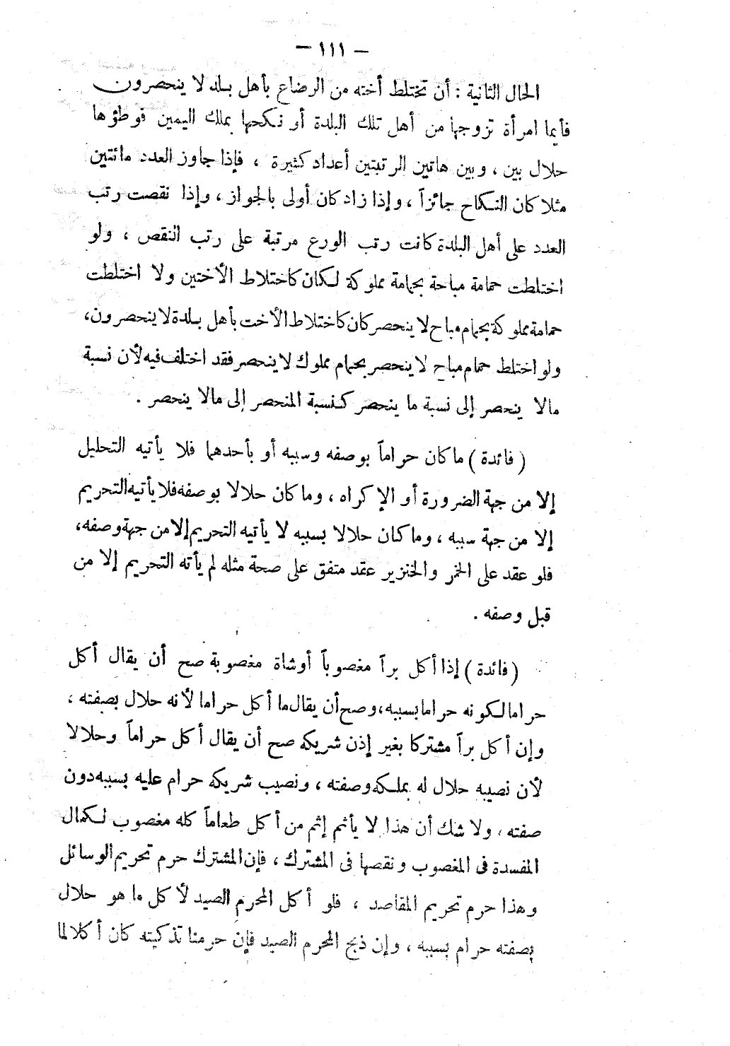 الْحَالُ الثَّانِيَةُ: أَنَّ تَخْتَلِطَ أُخْتُهُ مِنْ الرَّضَاعِ بِأَهْلِ بَلَدٍ لَا يَنْحَصِرُونَ فَأَيُّمَا امْرَأَةٍ تَزَوَّجَهَا مِنْ أَهْلِ تِلْكَ الْبَلْدَةِ أَوْ نَكَحَهَا بِمِلْكِ الْيَمِينِ فَوَطْؤُهَا حَلَالٌ بَيِّنٌ، وَبَيْنَ هَاتَيْنِ الرُّتْبَتَيْنِ أَعْدَادٌ كَثِيرَةٌ، فَإِذَا جَاوَزَ الْعَدَدَ مِائَتَيْنِ مَثَلًا كَانَ النِّكَاحُ جَائِزًا، وَإِذَا زَادَ كَانَ أَوْلَى بِالْجَوَازِ، وَإِذَا نَقَصَتْ رُتَبُ الْعَدَدِ عَلَى أَهْلِ الْبَلْدَةِ كَانَتْ رُتَبُ الْوَرَعِ مُرَتَّبَةً عَلَى رُتَبِ النَّقْصِ، وَلَوْ اخْتَلَطَتْ حَمَامَةٌ مُبَاحَةٌ بِحَمَامَةٍ مَمْلُوكَةٍ لَكَانَ كَاخْتِلَاطِ الْأُخْتَيْنِ وَلَا اخْتَلَطَتْ حَمَامَةٌ مَمْلُوكَةٌ بِحَمَامٍ مُبَاحٍ لَا يَنْحَصِرُ كَانَ كَاخْتِلَاطِ الْأُخْتِ بِأَهْلِ بَلْدَةٍ لَا يَنْحَصِرُونَ، وَلَوْ اخْتَلَطَ حَمَامٌ مُبَاحٍ لَا يَنْحَصِرُ بِحَمَامٍ مَمْلُوكٍ لَا يَنْحَصِرُ فَقَدْ اُخْتُلِفَ فِيهِ لِأَنَّ نِسْبَةَ مَا لَا يَنْحَصِرُ إلَى نِسْبَةِ مَا يَنْحَصِرُ كَنِسْبَةِ الْمُنْحَصِرِ إلَى مَا لَا يَنْحَصِرُ.