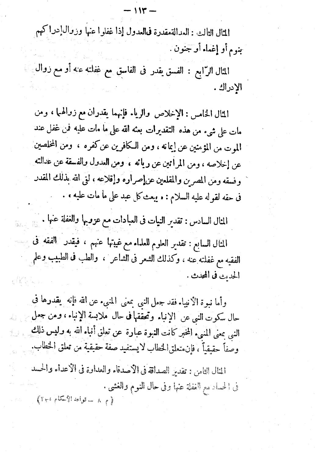 الْمِثَالُ الْخَامِسُ: الْإِخْلَاصُ وَالرِّيَاءُ فَإِنَّهُمَا يُقَدَّرَانِ مَعَ زَوَالِهِمَا، وَمَنْ مَاتَ عَلَى شَيْءٍ مِنْ هَذِهِ التَّقْدِيرَاتِ بَعَثَهُ اللَّهُ عَلَى مَا مَاتَ عَلَيْهِ فَمَنْ غَفَلَ عِنْدَ الْمَوْتِ مِنْ الْمُؤْمِنِينَ عَنْ إيمَانِهِ، وَمِنْ الْكَافِرِينَ عَنْ كُفْرِهِ، وَمِنْ الْمُخْلِصِينَ عَنْ إخْلَاصِهِ، وَمِنْ الْمُرَائِينَ عَنْ رِيَائِهِ، وَمِنْ الْعُدُولِ وَالْفَسَقَةِ عَنْ عَدَالَتِهِ وَفِسْقِهِ وَمِنْ الْمُصِرِّينَ وَالْمُقْلِعِينَ عَنْ إصْرَارِهِ وَإِقْلَاعِهِ، لَقِيَ اللَّهَ بِذَلِكَ الْمُقَدَّرِ فِي حَقِّهِ لِقَوْلِهِ - عَلَيْهِ السَّلَامُ -: «يُبْعَثُ كُلُّ عَبْدٍ عَلَى مَا مَاتَ عَلَيْهِ»