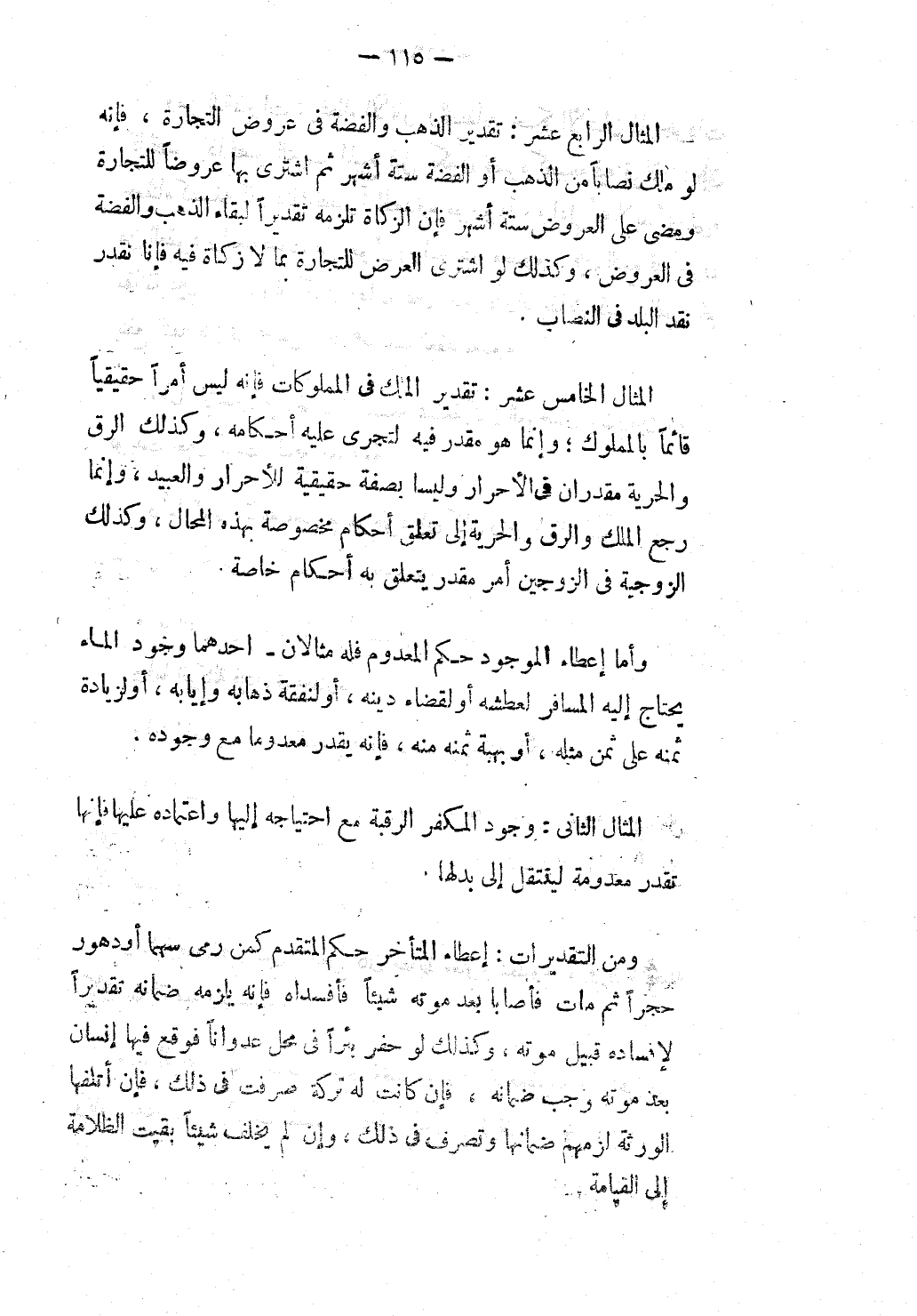الْمِثَالُ الْخَامِسَ عَشَرَ: تَقْدِيرُ الْمِلْكِ فِي الْمَمْلُوكَاتِ فَإِنَّهُ لَيْسَ أَمْرًا حَقِيقِيًّا قَائِمًا بِالْمَمْلُوكِ؛ وَإِنَّمَا هُوَ مُقَدَّرٌ فِيهِ لِتُجْرَى عَلَيْهِ أَحْكَامُهُ، وَكَذَلِكَ الرِّقُّ وَالْحُرِّيَّةُ مُقَدَّرَانِ فِي الْأَحْرَارِ وَلَيْسَا بِصِفَةٍ حَقِيقِيَّةٍ لِلْأَحْرَارِ وَالْعَبِيدِ، وَإِنَّمَا رَجَعَ الْمِلْكُ وَالرِّقُّ وَالْحُرِّيَّةُ إلَى تَعَلُّقِ أَحْكَامٍ مَخْصُوصَةٍ بِهَذِهِ الْمُحَالِ، وَكَذَلِكَ الزَّوْجِيَّةُ فِي الزَّوْجَيْنِ أَمْرٌ مُقَدَّرٌ يَتَعَلَّقُ بِهِ أَحْكَامٌ خَاصَّةٌ.