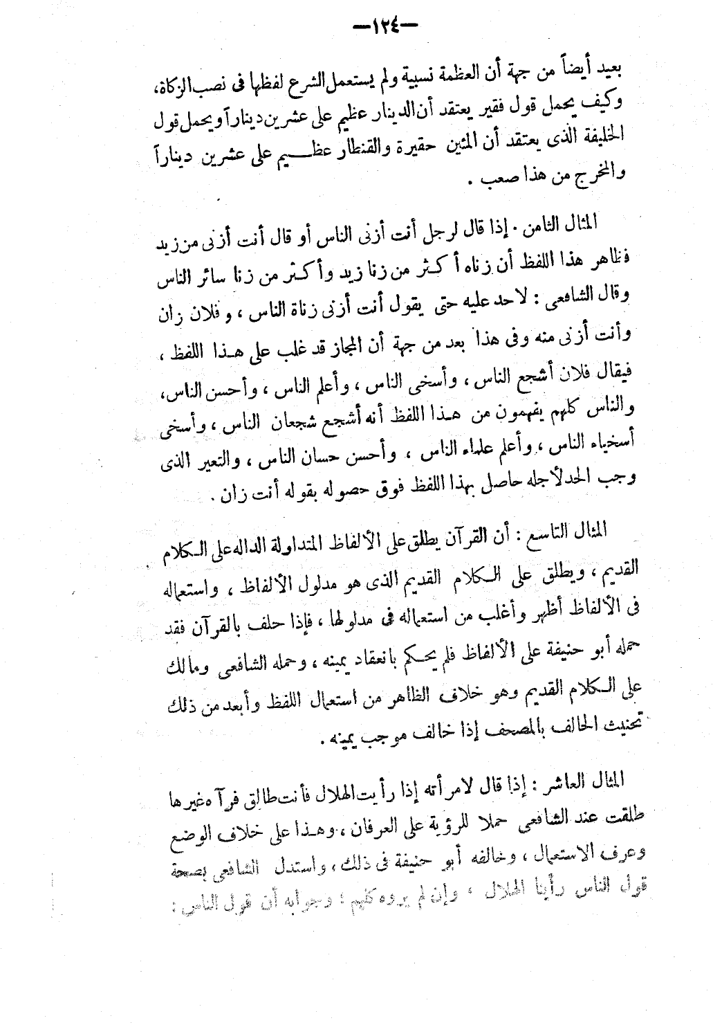 الْمِثَالُ التَّاسِعُ: أَنَّ الْقُرْآنَ يُطْلَقُ عَلَى الْأَلْفَاظِ الْمُتَدَاوَلَةِ الدَّالَّةِ عَلَى الْكَلَامِ الْقَدِيمِ، وَيُطْلَقُ عَلَى الْكَلَامِ الْقَدِيمِ الَّذِي هُوَ مَدْلُولُ الْأَلْفَاظِ، وَاسْتِعْمَالُهُ فِي الْأَلْفَاظِ أَظْهَرُ وَأَغْلَبُ مِنْ اسْتِعْمَالِهِ فِي مَدْلُولِهَا، فَإِذَا حَلَفَ بِالْقُرْآنِ فَقَدْ حَمَلَهُ أَبُو حَنِيفَةَ عَلَى الْأَلْفَاظِ فَلَمْ يَحْكُمْ بِانْعِقَادِ يَمِينِهِ، وَحَمَلَهُ الشَّافِعِيُّ وَمَالِكٌ عَلَى الْكَلَامِ الْقَدِيمِ وَهُوَ خِلَافُ الظَّاهِرِ مِنْ اسْتِعْمَالِ اللَّفْظِ وَأَبْعَدُ مِنْ ذَلِكَ تَحْنِيثُ الْحَالِفِ بِالْمُصْحَفِ إذَا خَالَفَ مُوجِبَ يَمِينِهِ.