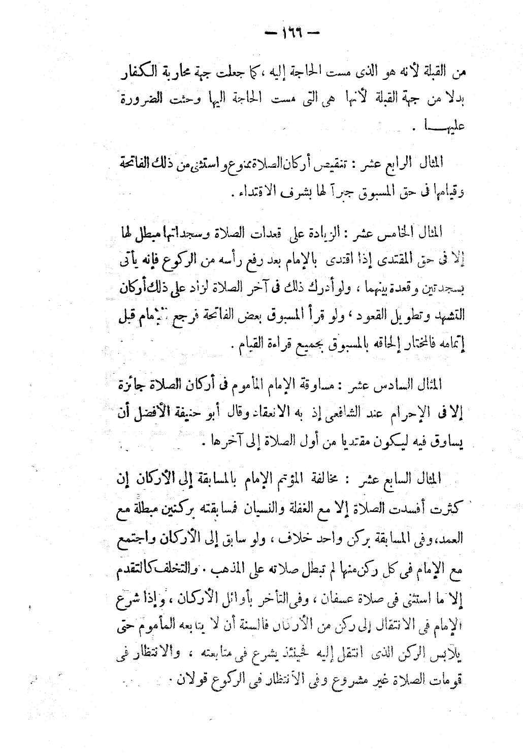 الْمِثَالُ السَّابِعَ عَشَرَ: مُخَالَفَةُ الْمُؤْتَمِّ الْإِمَامَ بِالْمُسَابَقَةِ إلَى الْأَرْكَانِ إنْ كَثُرَتْ أَفْسَدَتْ الصَّلَاةَ إلَّا مَعَ الْغَفْلَةِ وَالنِّسْيَانِ فَمُسَابَقَتُهُ بِرُكْنَيْنِ مُبْطِلَةٌ مَعَ الْعَمْدِ، وَفِي الْمُسَابَقَةِ بِرُكْنٍ وَاحِدٍ خِلَافٌ، وَلَوْ سَابَقَ إلَى الْأَرْكَانِ وَاجْتَمَعَ مَعَ الْإِمَامِ فِي كُلِّ رُكْنٍ مِنْهَا لَمْ تَبْطُلْ صَلَاتُهُ عَلَى الْمَذْهَبِ. وَالتَّخَلُّفُ كَالتَّقَدُّمِ إلَّا مَا اُسْتُثْنِيَ فِي صَلَاةِ عُسْفَانَ.