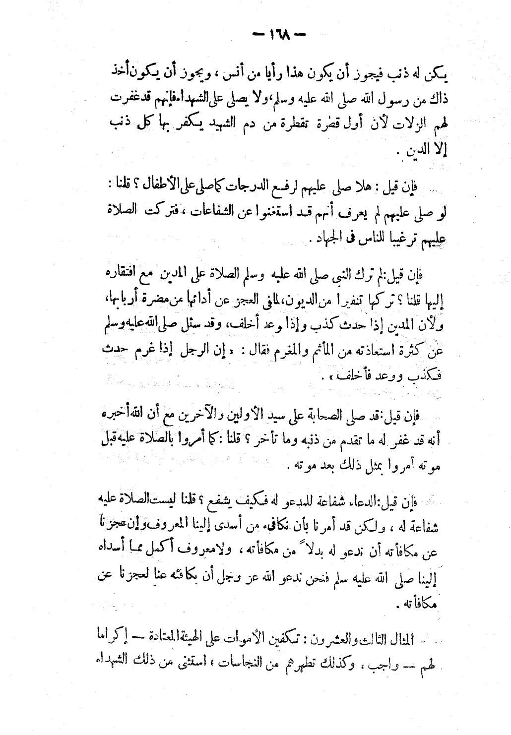 فَإِنْ قِيلَ: هَلَّا صُلِّيَ عَلَيْهِمْ لِرَفْعِ الدَّرَجَاتِ كَمَا صُلِّيَ عَلَى الْأَطْفَالِ؟ قُلْنَا: لَوْ صُلِّيَ عَلَيْهِمْ لَمْ يُعْرَفْ أَنَّهُمْ قَدْ اسْتَغْنَوْا عَنْ الشَّفَاعَاتِ، فَتُرِكَتْ الصَّلَاةُ عَلَيْهِمْ تَرْغِيبًا لِلنَّاسِ فِي الْجِهَادِ.