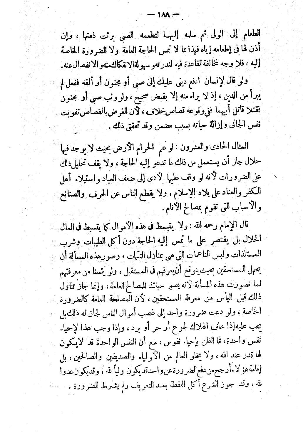 الْمِثَالُ الْحَادِي وَالْعِشْرُونَ: لَوْ عَمَّ الْحَرَامُ الْأَرْضَ بِحَيْثُ لَا يُوجَدُ فِيهَا حَلَالٌ جَازَ أَنْ يُسْتَعْمَلَ مِنْ ذَلِكَ مَا تَدْعُو إلَيْهِ الْحَاجَةُ، وَلَا يَقِفُ تَحْلِيلُ ذَلِكَ عَلَى الضَّرُورَاتِ لِأَنَّهُ لَوْ وَقَفَ عَلَيْهَا لَأَدَّى إلَى ضَعْفِ الْعِبَادِ وَاسْتِيلَاءِ أَهْلِ الْكُفْرِ وَالْعِنَادِ عَلَى بِلَادِ الْإِسْلَامِ، وَلَا يَقْطَعُ النَّاسُ عَنْ الْحِرَفِ وَالصَّنَائِعِ وَالْأَسْبَابِ الَّتِي تَقُومُ بِمَصَالِحِ الْأَنَامِ.