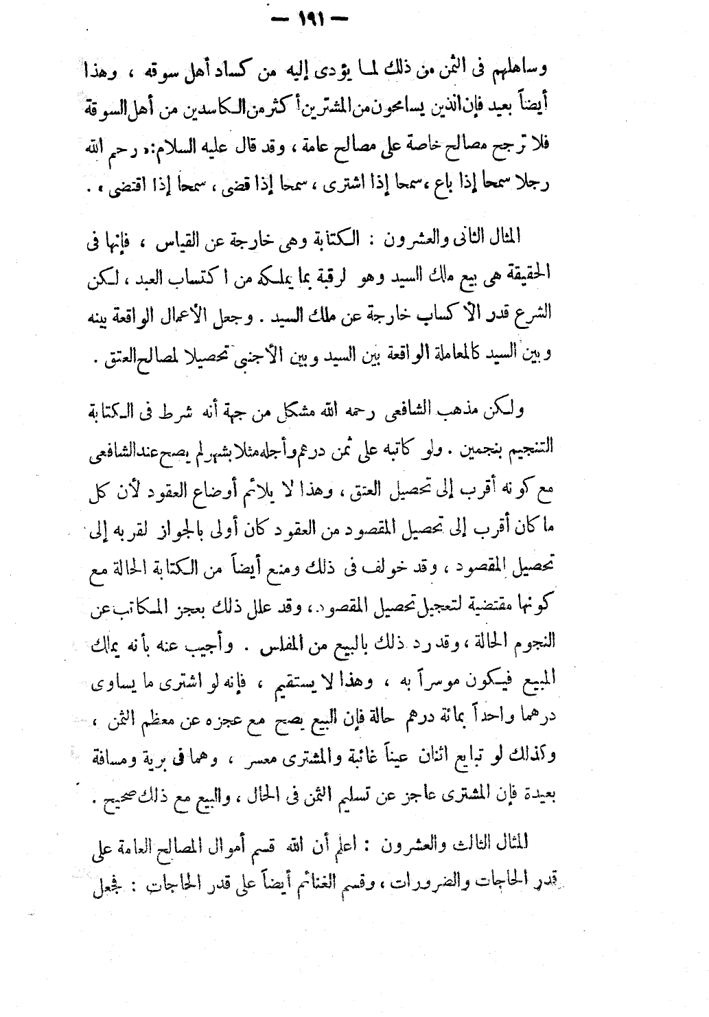 الْمِثَالُ الثَّانِي وَالْعِشْرُونَ: الْكِتَابَةُ وَهِيَ خَارِجَةٌ عَنْ الْقِيَاسِ، فَإِنَّهَا فِي الْحَقِيقَةِ هِيَ بَيْعُ مِلْكِ السَّيِّدِ وَهُوَ الرَّقَبَةُ بِمَا يَمْلِكُهُ مِنْ اكْتِسَابِ الْعَبْدِ، لَكِنَّ الشَّرْعَ قَدَّرَ الْأَكْسَابَ خَارِجَةً عَنْ مِلْكِ السَّيِّدِ. وَجَعَلَ الْأَعْمَالَ الْوَاقِعَةَ بَيْنَهُ وَبَيْنَ السَّيِّدِ كَالْمُعَامَلَةِ الْوَاقِعَةِ بَيْنَ السَّيِّدِ وَبَيْنَ الْأَجْنَبِيِّ تَحْصِيلًا لِمَصَالِحِ الْعِتْقِ.