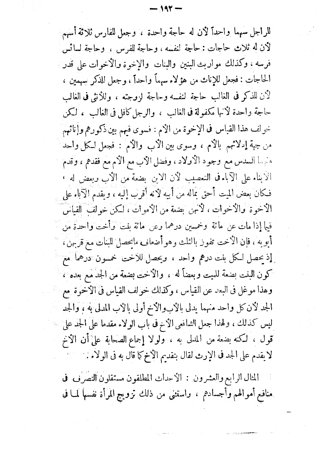 وَكَذَلِكَ مَوَارِيثُ الْبَنِينَ وَالْبَنَاتِ وَالْإِخْوَةِ وَالْأَخَوَاتِ عَلَى قَدْرِ الْحَاجَاتِ: فَجَعَلَ لِلْإِنَاثِ مِنْ هَؤُلَاءِ سَهْمًا وَاحِدًا، وَجَعَلَ لِلذَّكَرِ سَهْمَيْنِ، لِأَنَّ لِلذَّكَرِ فِي الْغَالِبِ حَاجَةً لِنَفْسِهِ وَحَاجَةً لِزَوْجَتِهِ، وَلِلْأُنْثَى فِي الْغَالِبِ حَاجَةً وَاحِدَةً لِأَنَّهَا مَكْفُولَةٌ فِي الْغَالِبِ، وَالرَّجُلُ كَافِلٌ فِي الْغَالِبِ، لَكِنْ خُولِفَ هَذَا الْقِيَاسُ فِي الْإِخْوَةِ مِنْ الْأُمِّ: فَسَوَّى فِيهِمْ بَيْنَ ذُكُورِهِمْ وَإِنَاثِهِمْ مِنْ جِهَةِ إدْلَائِهِمْ بِالْأُمِّ، وَسَوَّى بَيْنَ الْأَبِ وَالْأُمِّ: فَجَعَلَ لِكُلِّ وَاحِدٍ مِنْهُمَا السُّدُسَ مَعَ وُجُودِ الْأَوْلَادِ، وَفَضْلِ الْأَبِ مَعَ الْأُمِّ مَعَ فَقْدِهِمْ، وَقَدَّمَ الْأَبْنَاءَ عَلَى الْآبَاءِ فِي التَّعْصِيبِ لِأَنَّ الِابْنَ بِضْعَةٌ مِنْ الْأَبِ وَبَعْضٌ لَهُ، فَكَانَ بَعْضُ الْمَيِّتِ أَحَقَّ بِمَالِهِ مِنْ أَبِيهِ لِأَنَّهُ أَقْرَبُ إلَيْهِ، وَيُقَدَّمُ الْآبَاءُ عَلَى الْإِخْوَةِ وَالْأَخَوَاتِ، لِأَنَّهُنَّ بِضْعَةٌ مِنْ الْأَمْوَاتِ، لَكِنْ خُولِفَ الْقِيَاسُ فِيمَا إذَا مَاتَ عَنْ مِائَةٍ وَخَمْسِينَ دِرْهَمًا وَعَنْ مِائَةِ بِنْتٍ وَأُخْتٍ وَاحِدَةٍ مِنْ أَبَوَيْهِ، فَإِنَّ الْأُخْتَ تَفُوزُ بِالثُّلُثِ وَهُوَ أَضْعَافُ مَا يَحْصُلُ لِلْبَنَاتِ مَعَ قُرْبِهِنَّ، إذْ يَحْصُلُ لِكُلِّ بِنْتٍ دِرْهَمٌ وَاحِدٌ، وَيَحْصُلُ لِلْأُخْتِ خَمْسُونَ دِرْهَمًا مَعَ كَوْنِ الْبِنْتِ بِضْعَةً لِلْمَيِّتِ وَبَعْضًا لَهُ، وَالْأُخْتِ بِضْعَةً مِنْ الْجَدِّ مَعَ بُعْدِهِ، وَهَذَا مُوغِلٌ فِي الْبُعْدِ عَنْ الْقِيَاسِ.