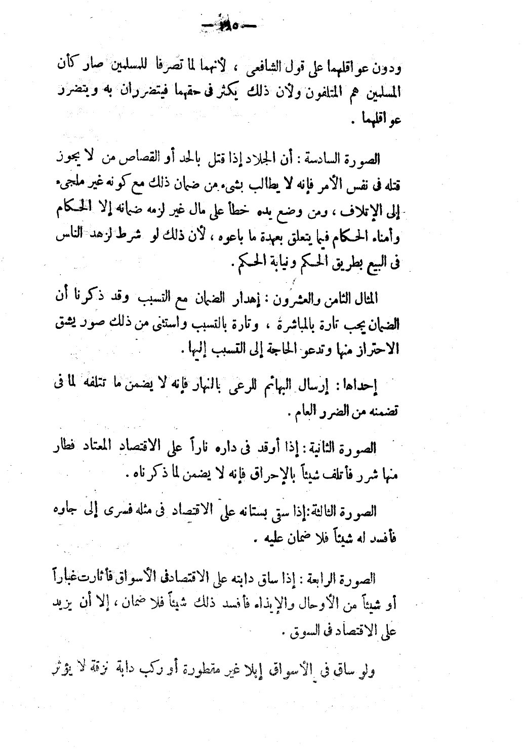 الصُّورَةُ الرَّابِعَةُ: إذَا سَاقَ دَابَّتَهُ عَلَى الِاقْتِصَادِ فِي الْأَسْوَاقِ فَأَثَارَتْ غُبَارًا أَوْ شَيْئًا مِنْ الْأَوْحَالِ وَالْإِيذَاءِ فَأَفْسَدَ ذَلِكَ شَيْئًا فَلَا ضَمَانَ، إلَّا أَنْ يَزِيدَ عَلَى الِاقْتِصَادِ فِي السُّوقِ.