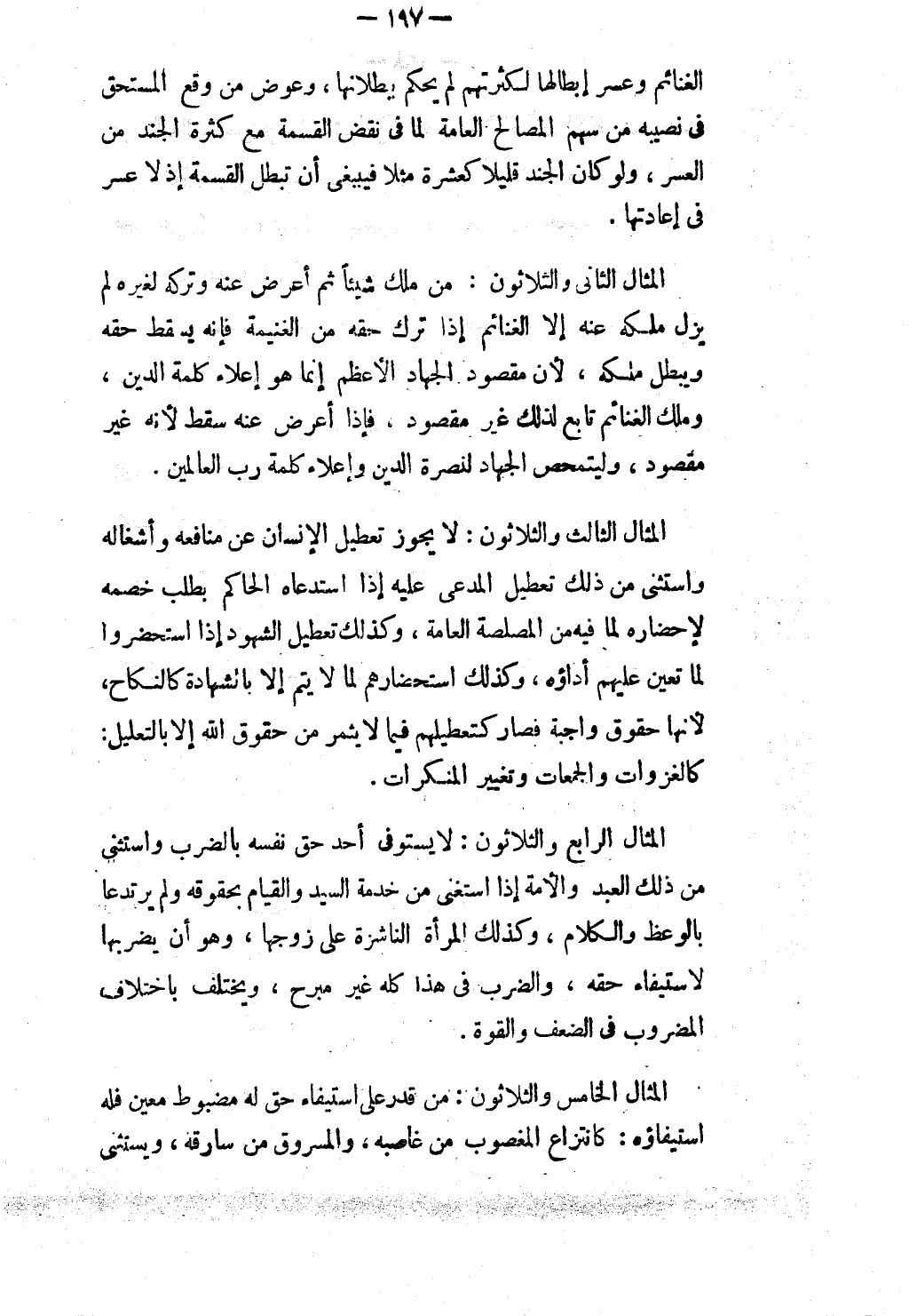 الْمِثَالُ الثَّانِي وَالثَّلَاثُونَ: مَنْ مَلَكَ شَيْئًا ثُمَّ أَعْرَضَ عَنْهُ وَتَرَكَهُ لِغَيْرِهِ لَمْ يَزُلْ مِلْكُهُ عَنْهُ إلَّا الْغَنَائِمَ إذَا تَرَكَ حَقَّهُ مِنْ الْغَنِيمَةِ فَإِنَّهُ يَسْقُطُ حَقُّهُ وَيَبْطُلُ مِلْكُهُ، لِأَنَّ مَقْصُودَ الْجِهَادِ الْأَعْظَمِ إنَّمَا هُوَ إعْلَاءُ كَلِمَةِ الدِّينِ، وَمِلْكُ الْغَنَائِمِ تَابِعٌ لِذَلِكَ غَيْرُ مَقْصُودٍ، فَإِذَا أَعْرَضَ عَنْهُ سَقَطَ لِأَنَّهُ غَيْرُ مَقْصُودٍ، وَلِيَتَمَحَّصَ الْجِهَادُ لِنُصْرَةِ الدِّينِ وَإِعْلَاءِ كَلِمَةِ رَبِّ الْعَالَمِينَ.