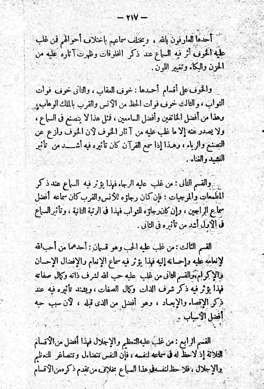 أَحَدُهَا الْعَارِفُونَ بِاَللَّهِ، وَيَخْتَلِفُ سَمَاعُهُمْ بِاخْتِلَافِ أَحْوَالِهِمْ فَمَنْ غَلَبَ، عَلَيْهِ الْخَوْفُ أَثَّرَ فِيهِ السَّمَاعُ عِنْدَ ذِكْرِ الْمَخْلُوقَاتِ وَظَهَرَتْ آثَارُهُ عَلَيْهِ مِنْ الْحُزْنِ وَالْبُكَاءِ وَتَغْيِيرِ اللَّوْنِ.