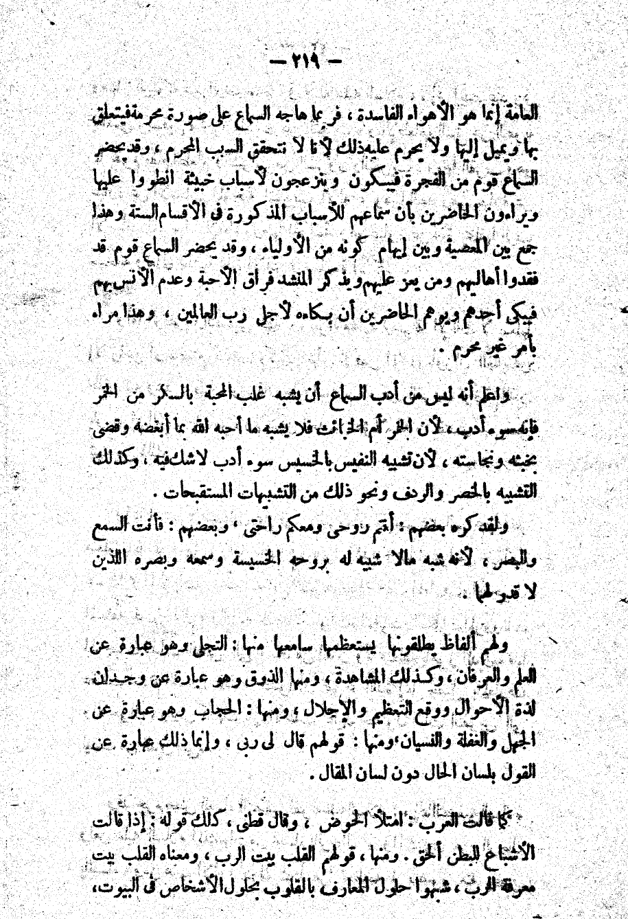 وَاعْلَمْ أَنَّهُ لَيْسَ مِنْ أَدَبِ السَّمَاعِ أَنْ يُشَبِّهَ غَلَبَ الْمَحَبَّةِ بِالسُّكْرِ مِنْ الْخَمْرِ فَإِنَّهُ سُوءُ أَدَبٍ، لِأَنَّ الْخَمْرَ أُمُّ الْخَبَائِثِ فَلَا يُشَبِّهُ مَا أَحَبَّهُ اللَّهُ بِمَا أَبْغَضَهُ وَقَضَى بِخُبْثِهِ وَنَجَاسَتِهِ، لِأَنَّ تَشْبِيهَ النَّفِيسِ بِالْخَسِيسِ سُوءُ أَدَبٍ لَا شَكَّ فِيهِ، وَكَذَلِكَ التَّشْبِيهُ بِالْخَصْرِ وَالرِّدْفِ وَنَحْوِ ذَلِكَ مِنْ التَّشْبِيهَاتِ الْمُسْتَقْبَحَاتِ.