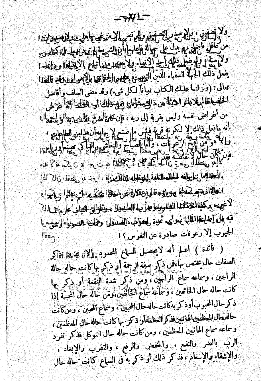 (فَائِدَةٌ) اعْلَمْ أَنَّهُ لَا يَحْصُلُ السَّمَاعُ الْمَحْمُودُ إلَّا عِنْدَ ذِكْرِ الصِّفَاتِ حَالَ يَخْتَصُّ بِهَا، فَمَنْ ذَكَرَ صِفَةَ الرَّحْمَةِ أَوْ ذُكِّرَ بِهَا كَانَتْ حَالُهُ حَالَةَ الرَّاجِينَ، وَسَمَاعُهُ سَمَاعَ الرَّاجِينَ، وَمَنْ ذَكَرَ شِدَّةَ النِّقْمَةِ أَوْ ذُكِّرَ بِهَا كَانَتْ حَالُهُ حَالَ الْخَائِفِينَ، وَسَمَاعُهُ سَمَاعَ الْخَائِفِينَ، وَمَنْ حَالُهُ حَالُ الْمَحَبَّةِ إذَا ذَكَرَ حَالَ الْمَحْبُوبِ أَوْ ذُكِّرَ بِهِ كَانَتْ حَالُهُ حَالَ الْمُحِبِّينَ، وَسَمَاعُهُ سَمَاعَ الْمُحِبِّينَ، وَمَنْ كَانَتْ حَالُهُ حَالَ الْمُعَظِّمِينَ الْهَائِبِينَ فَذَكَرَ الْعَظَمَةَ أَوْ ذُكِّرَ بِهَا كَانَتْ حَالُهُ حَالَ الْمُعَظِّمِينَ، وَسَمَاعُهُ سَمَاعَ الْهَائِبِينَ الْمُعَظِّمِينَ، وَمَنْ كَانَتْ حَالُهُ حَالَ التَّوَكُّلِ فَذَكَرَ تَفَرُّدَ الرَّبِّ بِالضُّرِّ وَالنَّفْعِ، وَالْخَفْضِ وَالرَّفْعِ، وَالتَّقَرُّبِ وَالْإِبْعَادِ، وَالْإِشْقَاءِ وَالْإِسْعَادِ، فَذَكَرَ ذَلِكَ أَوْ ذُكِّرَ بِهِ فِي السَّمَاعِ كَانَتْ حَالُهُ حَالَ