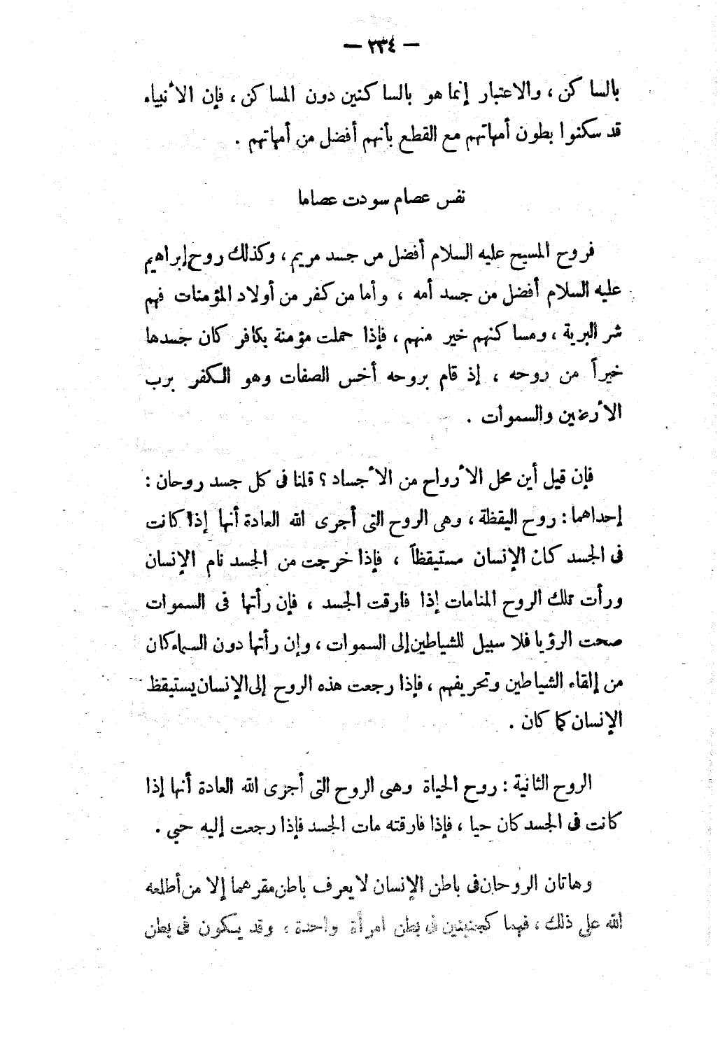 فَإِنْ قِيلَ أَيْنَ مَحَلُّ الْأَرْوَاحِ مِنْ الْأَجْسَادِ؟ قُلْنَا فِي كُلِّ جَسَدٍ رُوحَانِ: إحْدَاهُمَا: رُوحُ الْيَقَظَةِ، وَهِيَ الرُّوحُ الَّتِي أَجْرَى اللَّهُ الْعَادَةَ أَنَّهَا إذَا كَانَتْ فِي الْجَسَدِ كَانَ الْإِنْسَانُ مُسْتَيْقِظًا، فَإِذَا خَرَجَتْ مِنْ الْجَسَدِ نَامَ الْإِنْسَانُ وَرَأَتْ تِلْكَ الرُّوحُ الْمَنَامَاتِ إذَا فَارَقَتْ الْجَسَدَ، فَإِنْ رَأَتْهَا فِي السَّمَوَاتِ صَحَّتْ الرُّؤْيَا فَلَا سَبِيلَ لِلشَّيَاطِينِ إلَى السَّمَوَاتِ، وَإِنْ رَأَتْهَا دُونَ السَّمَاءِ كَانَ مِنْ إلْقَاءِ الشَّيَاطِينِ وَتَحْرِيفِهِمْ، فَإِذَا رَجَعَتْ هَذِهِ الرُّوحُ إلَى الْإِنْسَانِ يَسْتَيْقِظُ الْإِنْسَانُ كَمَا كَانَ.