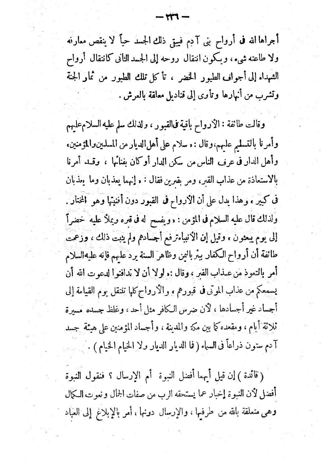 وَقَالَتْ طَائِفَةٌ: الْأَرْوَاحُ بَاقِيَةٌ فِي الْقُبُورِ، وَلِذَلِكَ سَلَّمَ - عَلَيْهِ السَّلَامُ - عَلَيْهِمْ وَأَمَرَنَا بِالتَّسْلِيمِ عَلَيْهِمْ، وَقَالَ: «سَلَامٌ عَلَى أَهْلِ الدِّيَارِ مِنْ الْمُسْلِمِينَ وَالْمُؤْمِنِينَ» وَأَهْلُ الدَّارِ فِي عُرْفِ النَّاسِ مَنْ سَكَنَ الدَّارَ أَوْ كَانَ بِفِنَائِهَا، وَقَدْ أَمَرَنَا بِالِاسْتِعَاذَةِ مِنْ عَذَابِ الْقَبْرِ، وَمَرَّ بِقَبْرَيْنِ فَقَالَ: «إنَّهُمَا يُعَذَّبَانِ وَمَا يُعَذَّبَانِ فِي كَبِيرٍ» وَهَذَا يَدُلُّ عَلَى أَنَّ الْأَرْوَاحَ فِي الْقُبُورِ دُونَ أَفْنِيَتِهَا وَهُوَ الْمُخْتَارُ.