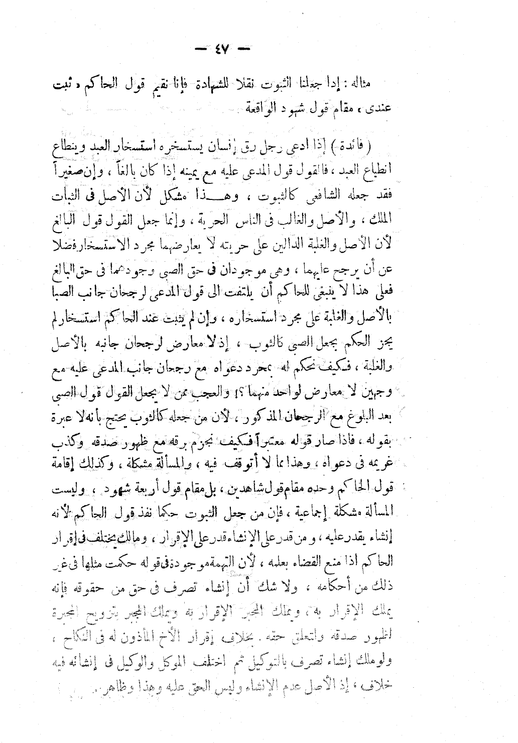 وَالْعَجَبُ مِمَّنْ لَا يَجْعَلُ الْقَوْلَ قَوْلَ الصَّبِيِّ بَعْدَ الْبُلُوغِ مَعَ الرُّجْحَانِ الْمَذْكُورِ؛ لِأَنَّ مَنْ جَعَلَهُ كَالثَّوْبِ يَحْتَجُّ بِأَنَّهُ لَا عِبْرَةَ بِقَوْلِهِ، فَإِذَا صَارَ قَوْلُهُ مُعْتَبَرًا فَكَيْفَ نَجْزِمُ بِرِقِّهِ مَعَ ظُهُورِ صِدْقِهِ وَكَذِبِ غَرِيمِهِ فِي دَعْوَاهُ، وَهَذَا مِمَّا لَا أَتَوَقَّفُ فِيهِ، وَالْمَسْأَلَةُ مُشْكِلَةٌ، وَكَذَلِكَ إقَامَةُ قَوْلِ الْحَاكِمِ وَحْدَهُ مَقَامَ قَوْلِ شَاهِدَيْنِ، بَلْ مَقَامَ قَوْلِ أَرْبَعَةِ شُهُودٍ، وَلَيْسَتْ الْمَسْأَلَةُ مُشْكِلَةً إجْمَاعِيَّةً، فَإِنَّ مَنْ جَعَلَ الثُّبُوتَ حُكْمًا نَفَّذَ قَوْلَ الْحَاكِمِ؛ لِأَنَّهُ إنْشَاءٌ يَقْدِرُ عَلَيْهِ، وَمَنْ قَدَرَ عَلَى الْإِنْشَاءِ قَدَرَ عَلَى الْإِقْرَارِ وَمَالِكٌ يَخْتَلِفُ فِي إقْرَارِ الْحَاكِمِ إذَا مَنَعَ الْقَضَاءَ بِعِلْمِهِ؛ لِأَنَّ التُّهْمَةَ مَوْجُودَةٌ فِي قَوْلِهِ حَكَمْتُ مِثْلَهَا فِي غَيْرِ ذَلِكَ مِنْ أَحْكَامِهِ، وَلَا شَكَّ أَنَّ إنْشَاءَ تَصَرُّفٍ فِي حَقٍّ مِنْ حُقُوقِهِ فَإِنَّهُ يَمْلِكُ الْإِقْرَارَ بِهِ، وَيَمْلِكُ الْمُجْبَرُ الْإِقْرَارَ بِهِ وَيَمْلِكُ الْمُجْبَرُ بِتَزْوِيجِ الْمُجْبَرَةِ لِظُهُورِ صِدْقِهِ وَلِتَعَلُّقِ حَقِّهِ؛ بِخِلَافِ إقْرَارِ الْأَخِ الْمَأْذُونِ لَهُ فِي النِّكَاحِ.