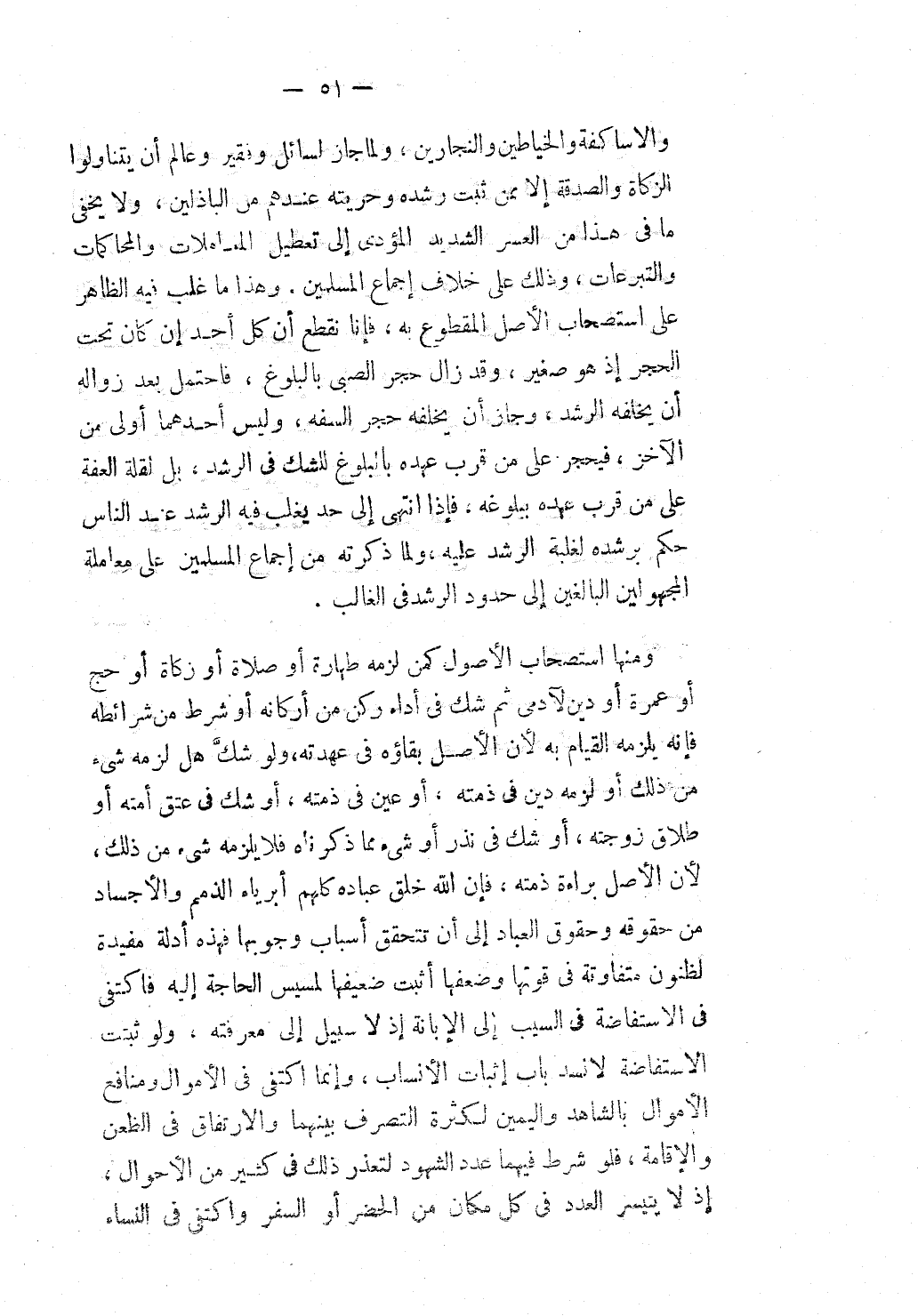 وَمِنْهَا اسْتِصْحَابُ الْأُصُولِ كَمَنْ لَزِمَهُ طَهَارَةٌ أَوْ صَلَاةٌ أَوْ زَكَاةٌ أَوْ حَجٌّ أَوْ عُمْرَةٌ أَوْ دَيْنٌ لِآدَمِيٍّ ثُمَّ شَكَّ فِي أَدَاءِ رُكْنٍ مِنْ أَرْكَانِهِ أَوْ شَرْطٍ مِنْ شَرَائِطِهِ فَإِنَّهُ يَلْزَمُهُ الْقِيَامُ بِهِ؛ لِأَنَّ الْأَصْلَ بَقَاؤُهُ فِي عُهْدَتِهِ، وَلَوْ شَكَّ هَلْ لَزِمَهُ شَيْءٌ مِنْ ذَلِكَ أَوْ لَزِمَهُ دَيْنٌ فِي ذِمَّتِهِ، أَوْ عَيْنٌ فِي ذِمَّتِهِ، أَوْ شَكَّ فِي عِتْقِ أَمَتِهِ أَوْ طَلَاقِ زَوْجَتِهِ، أَوْ شَكَّ فِي نَذْرٍ أَوْ شَيْءٍ مِمَّا ذَكَرْنَاهُ فَلَا يَلْزَمُهُ شَيْءٌ مِنْ ذَلِكَ؛ لِأَنَّ الْأَصْلَ بَرَاءَةُ ذِمَّتِهِ، فَإِنَّ اللَّهَ خَلَقَ عِبَادَهُ كُلَّهُمْ أَبْرِيَاءَ الذِّمَمِ وَالْأَجْسَادِ مِنْ حُقُوقِهِ وَحُقُوقِ الْعِبَادِ إلَى أَنْ تَتَحَقَّقَ أَسْبَابُ وُجُوبِهَا فَهَذِهِ أَدِلَّةٌ مُفِيدَةٌ لِظُنُونٍ مُتَفَاوِتَةٍ فِي قُوَّتِهَا وَضَعْفِهَا أُثْبِتَ ضَعِيفُهَا لِمَسِيسِ الْحَاجَةِ إلَيْهِ فَاكْتَفَى فِي الِاسْتِفَاضَةِ فِي السَّيِّبِ إلَى الْإِبَانَةِ إذْ لَا سَبِيلَ إلَى مَعْرِفَتِهِ، وَلَوْ ثَبَتَتْ الِاسْتِفَاضَةُ لَانْسَدَّ بَابُ إثْبَاتِ الْأَنْسَابِ، وَإِنَّمَا اكْتَفَى فِي الْأَمْوَالِ وَمَنَافِعِ الْأَمْوَالِ بِالشَّاهِدِ وَالْيَمِينِ؛ لِكَثْرَةِ التَّصَرُّفِ بَيْنَهُمَا وَالِارْتِفَاقِ فِي الظَّعْنِ وَالْإِقَامَةِ، فَلَوْ شَرَطَ فِيهِمَا عَدَدَ الشُّهُودِ لَتَعَذَّرَ ذَلِكَ فِي كَثِيرٍ مِنْ الْأَحْوَالِ، إذْ لَا يَتَيَسَّرُ الْعَدَدُ فِي كُلِّ مَكَان مِنْ الْحَضَرِ أَوْ السَّفَرِ وَاكْتَفَى فِي النِّسَاءِ