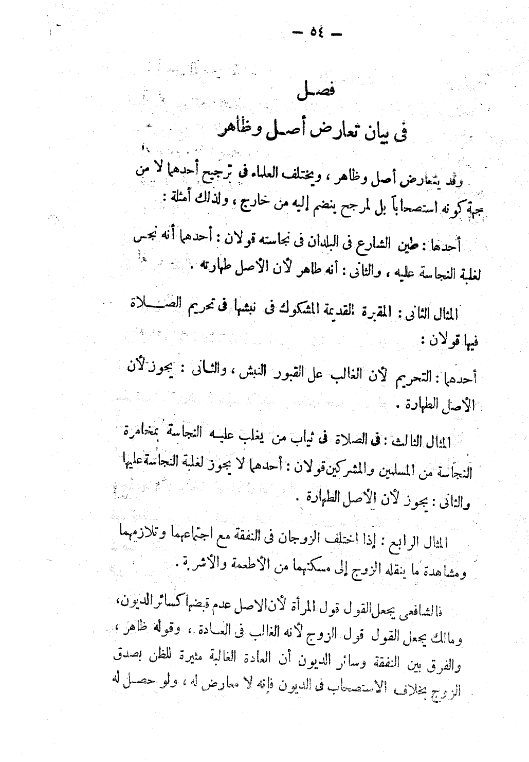 وَقَدْ يَتَعَارَضُ أَصْلٌ وَظَاهِرٌ، وَيَخْتَلِفُ الْعُلَمَاءُ فِي تَرْجِيحِ أَحَدِهِمَا لَا مِنْ جِهَةِ كَوْنِهِ اسْتِصْحَابًا بَلْ لِمُرَجِّحٍ يَنْضَمُّ إلَيْهِ مِنْ خَارِجٍ، وَلِذَلِكَ أَمْثِلَةٌ: أَحَدُهَا: طِينُ الشَّارِعِ فِي الْبُلْدَانِ فِي نَجَاسَتِهِ قَوْلَانِ: أَحَدُهُمَا أَنَّهُ نَجَسٌ لِغَلَبَةِ النَّجَاسَةِ عَلَيْهِ.