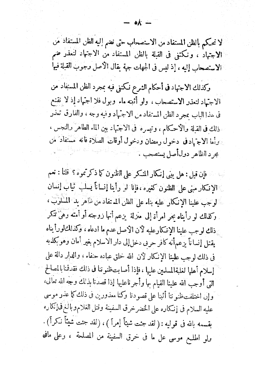 وَإِنْ اخْتَلَفَتْ ظُنُونُنَا أُثِبْنَا عَلَى قُصُودِنَا وَكُنَّا مَعْذُورِينَ فِي ذَلِكَ كَمَا عُذِرَ مُوسَى - عَلَيْهِ السَّلَامُ - فِي إنْكَارِهِ عَلَى الْخَضِرِ خَرْقَ السَّفِينَةِ وَقَتْلَ الْغُلَامِ وَبَالَغَ فِي إنْكَارِهِ بِقَسَمِهِ بِاَللَّهِ فِي قَوْلَيْهِ: {لَقَدْ جِئْتَ شَيْئًا إِمْرًا} [الكهف: 71] ، {لَقَدْ جِئْتَ شَيْئًا نُكْرًا} [الكهف: 74] .