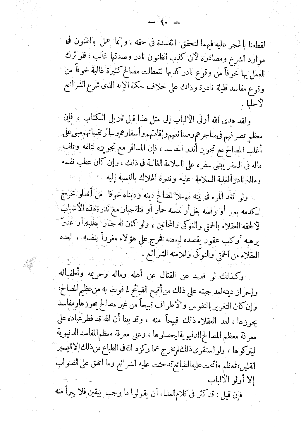 وَلَقَدْ هَدَى اللَّهُ أُولِي الْأَلْبَابِ إلَى مِثْلِ هَذَا قَبْلَ تَنْزِيلِ الْكِتَابِ، فَإِنَّ مُعْظَمَ تَصَرُّفِهِمْ فِي مَتَاجِرِهِمْ وَصَنَائِعِهِمْ، وَإِقَامَتِهِمْ وَأَسْفَارِهِمْ وَسَائِرِ تَقَلُّبَاتِهِمْ مَبْنِيٌّ عَلَى أَغْلَبِ الْمَصَالِحِ مَعَ تَجْوِيزِ أَنْدَرِ الْمَفَاسِدِ، فَإِنَّ الْمُسَافِرَ مَعَ تَجْوِيزِهِ لِتَلَفِهِ وَتَلَفِ مَالِهِ فِي السَّفَرِ يَبْتَنِي سَفَرُهُ عَلَى السَّلَامَةِ الْغَالِبَةِ فِي ذَلِكَ، وَإِنْ كَانَ عَطْبُ نَفْسِهِ وَمَالِهِ نَادِرًا لِغَلَبَةِ السَّلَامَةِ عَلَيْهِ وَنُدْرَةِ الْهَلَاكِ بِالنِّسْبَةِ إلَيْهِ، وَلَوْ قَعَدَ الْمَرْءُ فِي بَيْتِهِ مُهْمِلًا لِمَصَالِحِ دِينِهِ وَدِينَاهُ خَوْفًا مِنْ أَنَّهُ لَوْ خَرَجَ لَكَدَمَهُ بَعِيرٌ أَوْ رَفَسَهُ بَغْلٌ أَوْ نَدَسَهُ حِمَارٌ أَوْ قَتَلَهُ جَبَّارٌ مَعَ نُدْرَةِ هَذِهِ الْأَسْبَابِ لَأَلْحَقَهُ الْعُقَلَاءُ بِالْحَمْقَى وَالنَّوْكَى وَالْمَجَانِينِ، وَلَوْ كَانَ لَهُ جَبَّارٌ يَطْلُبُهُ أَوْ عَدُوٌّ يُرْهِبُهُ أَوْ كَلْبٌ عَقُورٌ يَقْصِدُهُ لِيَعَضَّهُ فَخَرَجَ عَلَى هَؤُلَاءِ مُغَرِّرًا بِنَفْسِهِ لَعَدَّهُ الْعُقَلَاءُ مِنْ الْحَمْقَى وَالنَّوْكَى وَلَلَامَتْهُ الشَّرَائِعُ.