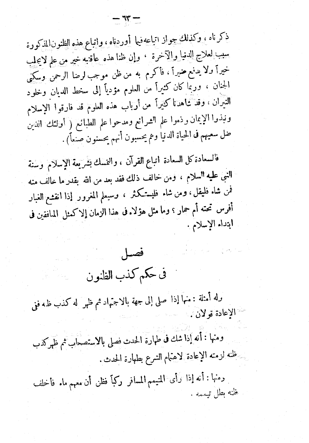 وَكَذَلِكَ جَوَازُ اتِّبَاعِهِ فِيمَا أَوْرَدْنَاهُ، وَاتِّبَاعُ هَذِهِ الظُّنُونِ الْمَذْكُورَةِ سَبَبٌ لِعِلَاجِ الدُّنْيَا وَالْآخِرَةِ، وَإِنَّ ظَنًّا هَذِهِ عَاقِبَتُهُ خَيْرٌ مِنْ عِلْمٍ لَا يَجْلِبُ خَيْرًا وَلَا يَدْفَعُ ضَيْرًا، فَأَكْرِمْ بِهِ مِنْ ظَنٍّ مُوجِبٍ لِرِضَا الرَّحْمَنِ وَسُكْنَى الْجِنَانِ، وَرُبَّمَا كَانَ كَثِيرًا مِنْ الْعُلُومِ مُؤَدِّيًا إلَى سَخَطِ الدَّيَّانِ وَخُلُودِ النِّيرَانِ، وَقَدْ شَاهَدْنَا كَثِيرًا مِنْ أَرْبَابِ هَذِهِ الْعُلُومِ قَدْ فَارَقُوا الْإِسْلَامَ وَنَبَذُوا الْإِيمَانَ وَذَمُّوا عِلْمَ الشَّرَائِعِ وَمَدَحُوا عِلْمَ الطَّبَائِعِ {الَّذِينَ ضَلَّ سَعْيُهُمْ فِي الْحَيَاةِ الدُّنْيَا وَهُمْ يَحْسَبُونَ أَنَّهُمْ يُحْسِنُونَ صُنْعًا} [الكهف: 104] .