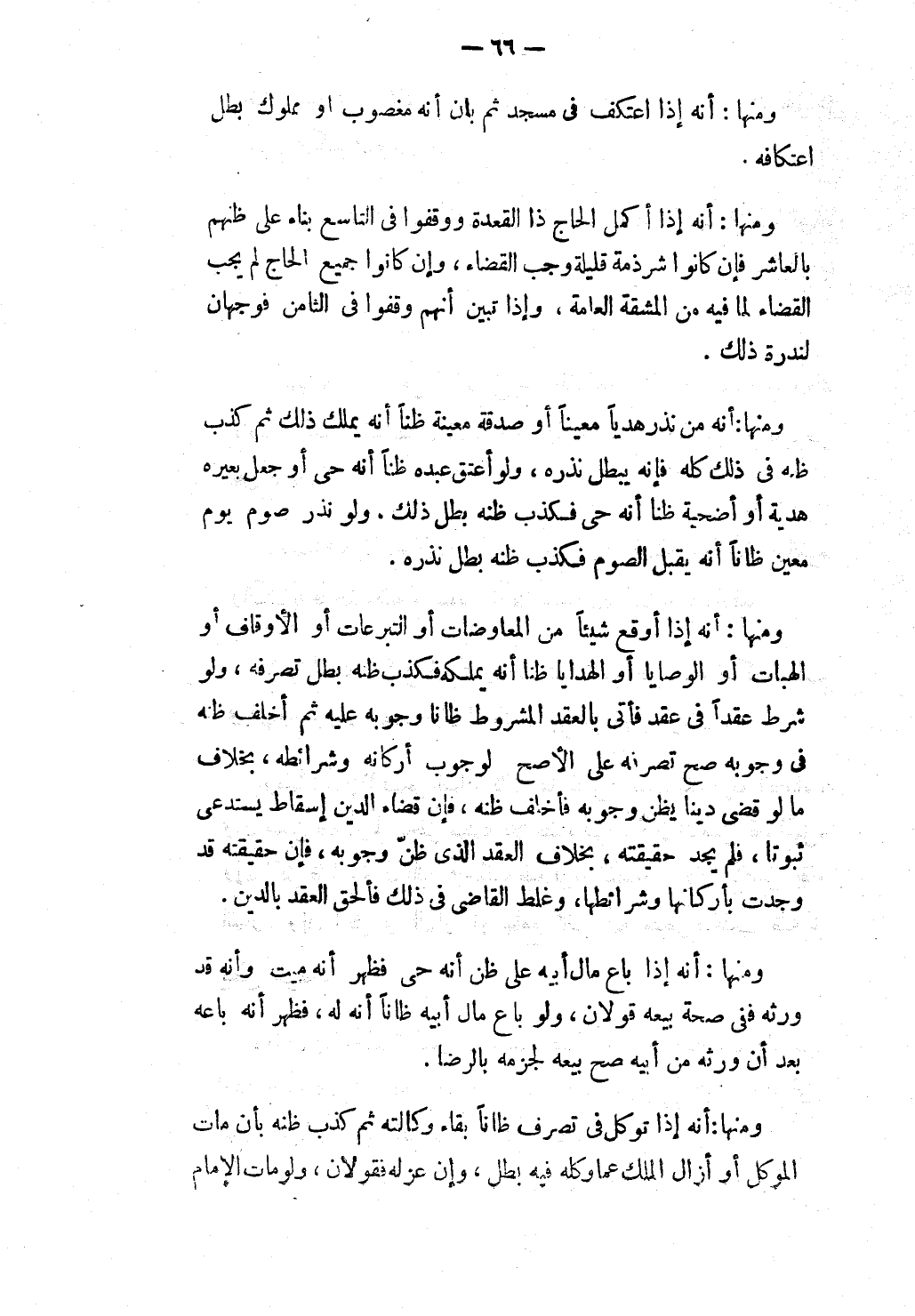 وَمِنْهَا: أَنَّهُ مَنْ نَذَرَ هَدْيًا مُعَيَّنًا أَوْ صَدَقَةً مُعَيَّنَةً ظَنًّا أَنَّهُ يَمْلِكُ ذَلِكَ ثُمَّ كَذَبَ ظَنُّهُ فِي ذَلِكَ كُلِّهِ فَإِنَّهُ يَبْطُلُ نَذْرُهُ، وَلَوْ أَعْتَقَ عَبْدَهُ ظَنًّا أَنَّهُ حَيٌّ أَوْ جَعَلَ بَعِيرَهُ هَدِيَّةً أَوْ أُضْحِيَّةً ظَنًّا أَنَّهُ حَيٌّ فَكَذَبَ ظَنُّهُ بَطَلَ ذَلِكَ، وَلَوْ نَذَرَ صَوْمَ يَوْمٍ مُعَيَّنٍ ظَانًّا أَنَّهُ يُقْبَلُ الصَّوْمُ فَكَذَبَ ظَنُّهُ بَطَلَ نَذْرُهُ.