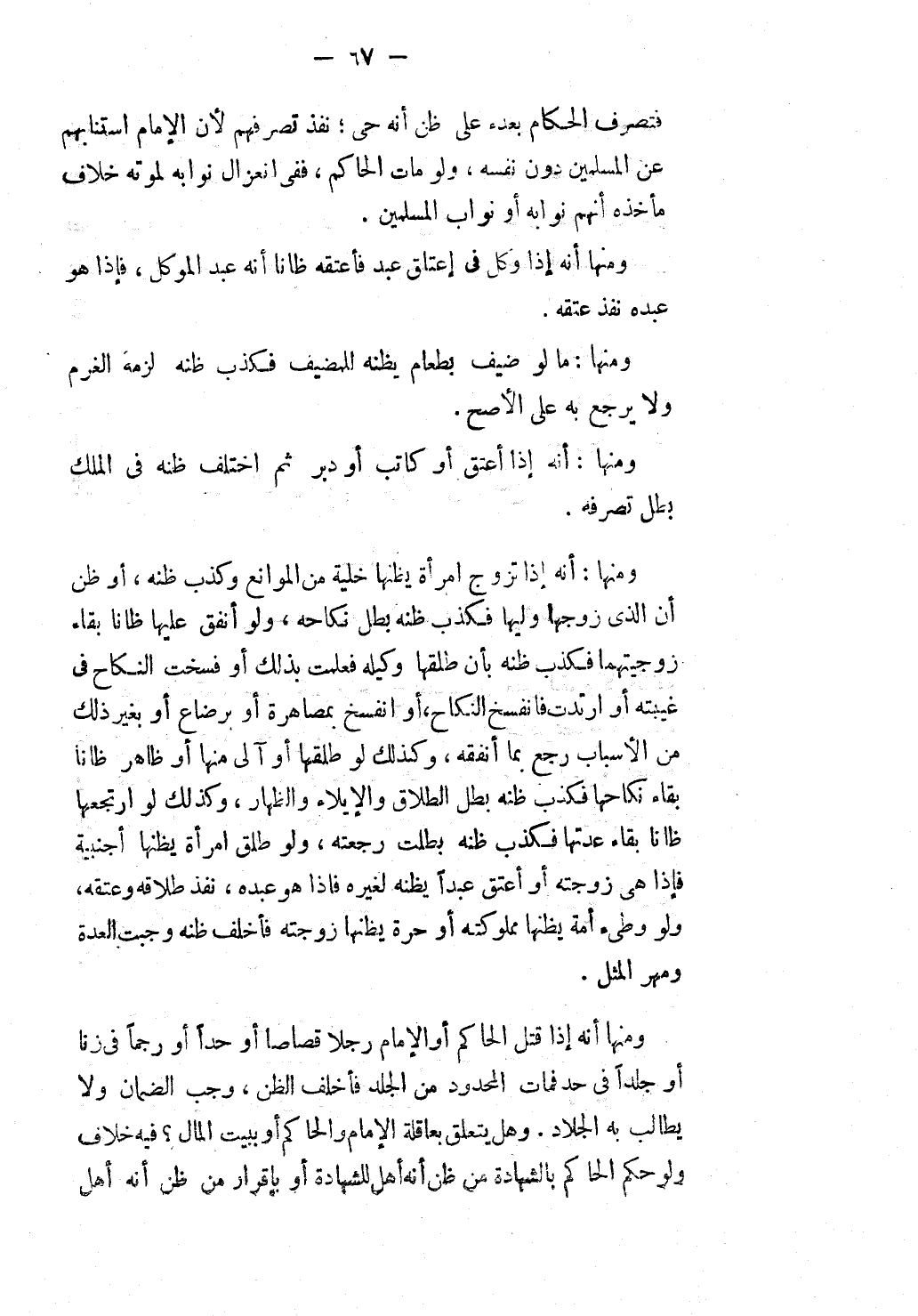 وَمِنْهَا: أَنَّهُ إذَا أَعْتَقَ أَوْ كَاتَبَ أَوْ دَبَّرَ ثُمَّ اخْتَلَفَ ظَنُّهُ فِي الْمِلْكِ بَطَلَ تَصَرُّفُهُ.