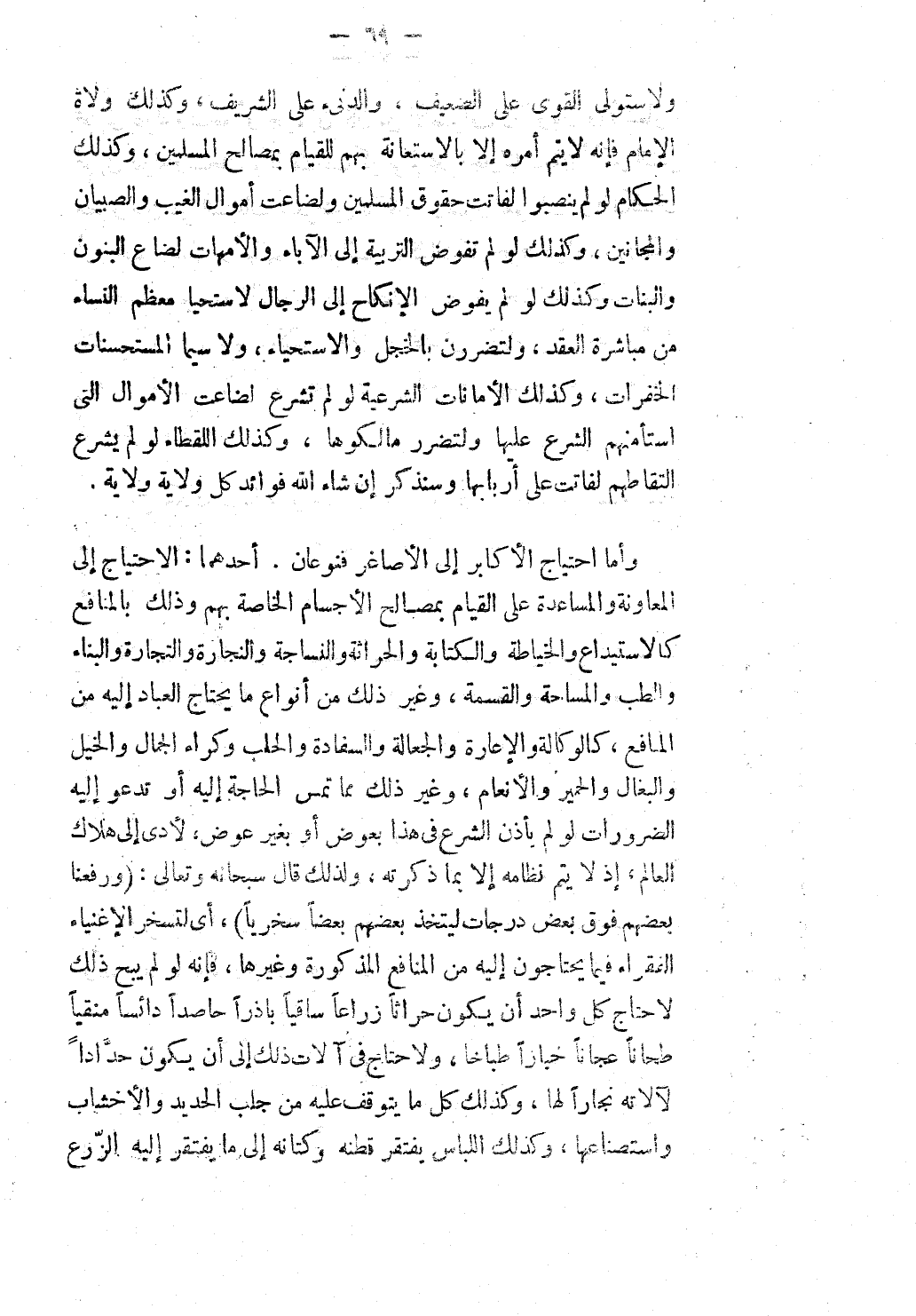 وَلَاسْتَوْلَى الْقَوِيُّ عَلَى الضَّعِيفِ، وَالدَّنِيءُ عَلَى الشَّرِيفِ، وَكَذَلِكَ وُلَاةُ الْإِمَامِ فَإِنَّهُ لَا يَتِمُّ إلَّا بِالِاسْتِعَانَةِ بِهِمْ لِلْقِيَامِ بِمَصَالِحِ الْمُسْلِمِينَ، وَكَذَلِكَ الْحُكَّامُ لَوْ لَمْ يُنَصَّبُوا لَفَاتَتْ حُقُوقُ الْمُسْلِمِينَ وَلَضَاعَتْ أَمْوَالُ الْغُيَّبِ وَالصِّبْيَانِ وَالْمَجَانِينِ، وَكَذَلِكَ لَوْ لَمْ تُفَوَّضْ التَّرْبِيَةُ إلَى الْآبَاءِ وَالْأُمَّهَاتِ لَضَاعَ الْبَنُونَ وَالْبَنَاتُ.