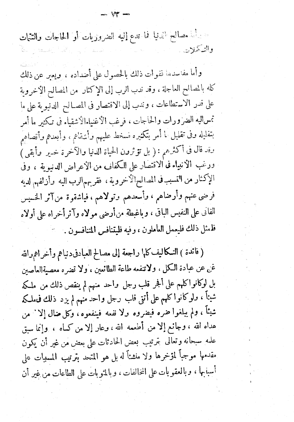 (فَائِدَةٌ) التَّكَالِيفُ كُلُّهَا رَاجِعَةٌ إلَى مَصَالِحِ الْعِبَادِ فِي دُنْيَاهُمْ وَأُخْرَاهُمْ وَاَللَّهُ غَنِيٌّ عَنْ عِبَادَةِ الْكُلِّ، وَلَا تَنْفَعُهُ طَاعَةُ الطَّائِعِينَ، وَلَا تَضُرُّهُ مَعْصِيَةُ الْعَاصِينَ بَلْ لَوْ كَانُوا كُلُّهُمْ عَلَى أَفْجَرِ قَلْبِ رَجُلٍ وَاحِدٍ مِنْهُمْ لَمْ يَنْقُصْ ذَلِكَ مِنْ مُلْكِهِ شَيْئًا، وَلَوْ كَانُوا كُلُّهُمْ عَلَى أَتْقَى قَلْبِ رَجُلٍ وَاحِدٍ مِنْهُمْ لَمْ يَزِدْ ذَلِكَ فِي مُلْكِهِ شَيْئًا، وَلَمْ يَبْلُغُوا ضُرَّهُ فَيَضُرُّوهُ وَلَا نَفْعَهُ فَيَنْفَعُوهُ، وَكُلٌّ ضَالٌّ إلَّا مَنْ هَدَاهُ اللَّهُ، وَجَائِعٌ إلَّا مَنْ أَطْعَمَهُ اللَّهُ، وَعَارٍ إلَّا مَنْ كَسَاهُ، وَإِنَّمَا سَبَقَ عِلْمُهُ - سُبْحَانَهُ وَتَعَالَى - بِتَرْتِيبِ بَعْضِ الْحَادِثَاتِ عَلَى بَعْضٍ مِنْ غَيْرِ أَنْ يَكُونَ مُقَدَّمُهَا مُوجِبًا لِمُؤَخَّرِهَا وَلَا مُنْشِئًا لَهُ بَلْ هُوَ الْمُتَّحِدُ بِتَرْتِيبِ الْمُسَبِّبَاتِ عَلَى أَسْبَابِهَا، وَبِالْعُقُوبَاتِ عَلَى الْمُخَالَفَاتِ، وَبِالْمَثُوبَاتِ عَلَى الطَّاعَاتِ مِنْ غَيْر أَنْ