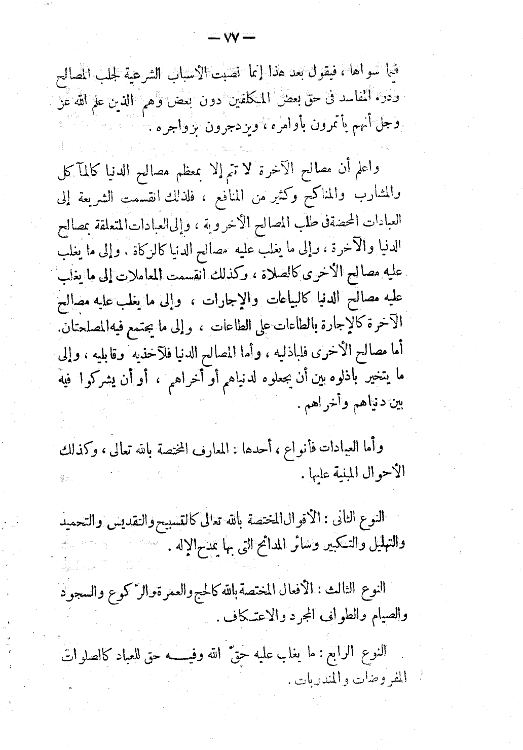 وَاعْلَمْ أَنَّ مَصَالِحَ الْآخِرَةِ لَا تَتِمُّ إلَّا بِمُعْظَمِ مَصَالِحِ الدُّنْيَا كَالْمَآكِلِ وَالْمَشَارِبِ وَالْمَنَاكِحِ وَكَثِيرٍ مِنْ الْمَنَافِعِ، فَلِذَلِكَ انْقَسَمَتْ الشَّرِيعَةُ إلَى الْعِبَادَاتِ الْمَحْضَةِ فِي طَلَبِ الْمَصَالِحِ الْأُخْرَوِيَّةِ، وَإِلَى الْعِبَادَاتِ الْمُتَعَلِّقَةِ بِمَصَالِحِ الدُّنْيَا وَالْآخِرَةِ، وَإِلَى مَا يَغْلِبُ عَلَيْهِ مَصَالِحُ الدُّنْيَا كَالزَّكَاةِ، وَإِلَى مَا يَغْلِبُ عَلَيْهِ مَصَالِحُ الْأُخْرَى كَالصَّلَاةِ، وَكَذَلِكَ انْقَسَمَتْ الْمُعَامَلَاتُ إلَى مَا يَغْلِبُ عَلَيْهِ