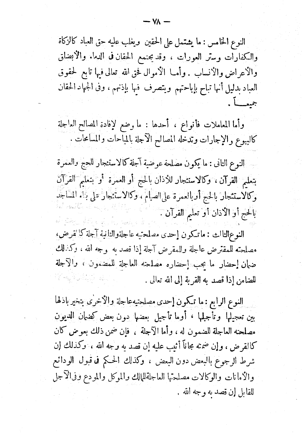 النَّوْعُ الْخَامِسُ: مَا يَشْتَمِلُ عَلَى الْحَقَّيْنِ وَيَغْلِبُ عَلَيْهِ حَقُّ الْعِبَادِ كَالزَّكَاةِ وَالْكَفَّارَاتِ وَسَتْرِ الْعَوْرَاتِ، وَقَدْ يَجْتَمِعُ الْحَقَّانِ فِي الدِّمَاءِ، وَالْأَبْضَاعِ وَالْأَعْرَاضِ وَالْأَنْسَابِ.