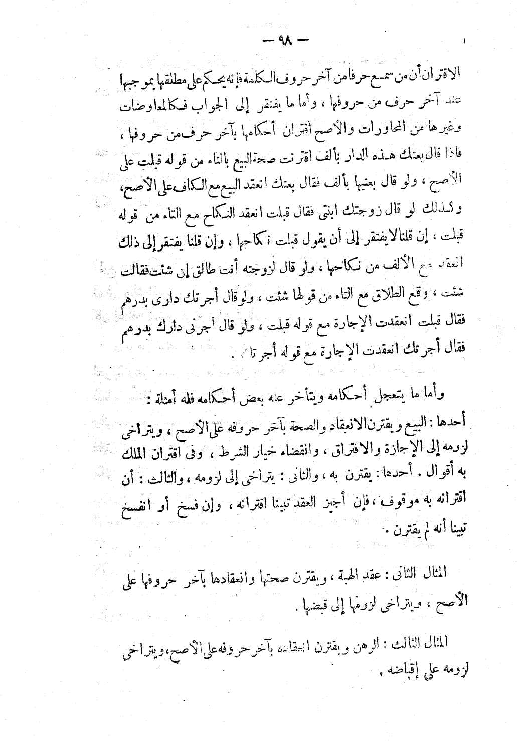 الْمِثَالُ الثَّالِثُ: الرَّهْنُ وَيَقْتَرِنُ انْعِقَادُهُ بِآخِرِ حُرُوفِهِ عَلَى الْأَصَحِّ، وَيَتَرَاخَى لُزُومُهُ عَلَى إقْبَاضِهِ.