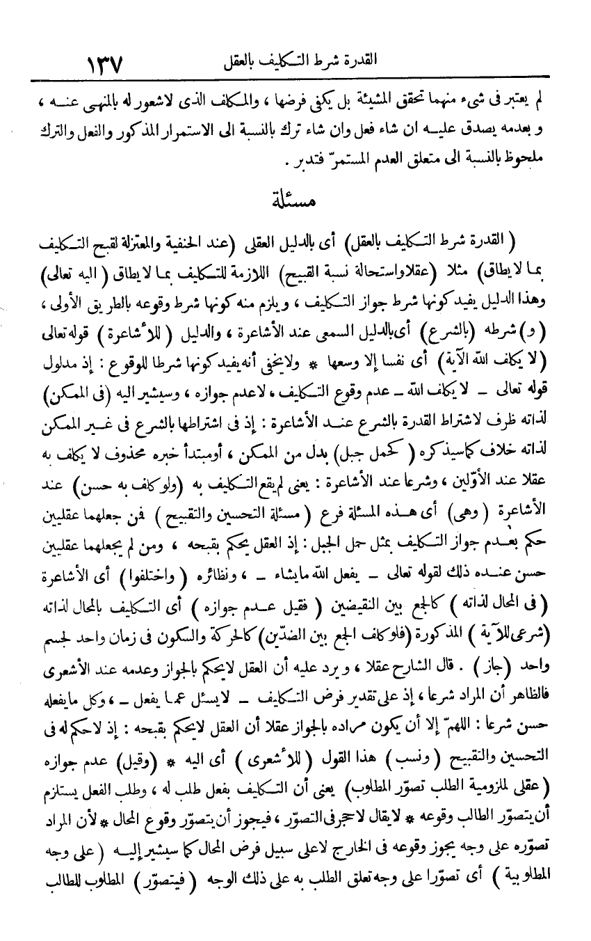 (الْقُدْرَة شَرط التَّكْلِيف بِالْعقلِ) أَي بِالدَّلِيلِ الْعقلِيّ (عِنْد الْحَنَفِيَّة والمعتزلة لقبح التَّكْلِيف بِمَا لَا يُطَاق) مثلا (عقلا واستحالة نِسْبَة الْقَبِيح) اللَّازِمَة للتكليف بِمَا لَا يُطَاق (إِلَيْهِ تَعَالَى) وَهَذَا الدَّلِيل يُفِيد كَونهَا شَرط جَوَاز التَّكْلِيف، وَيلْزم مِنْهُ كَونهَا شَرط وُقُوعه بِالطَّرِيقِ الأولي، (و) شَرطه (بِالشَّرْعِ) أَي بِالدَّلِيلِ السمعي عِنْد الأشاعرة، وَالدَّلِيل (للأشاعرة) قَوْله تَعَالَى {لَا يُكَلف الله} الْآيَة) أَي نفسا إِلَّا وسعهَا وَلَا يخفى أَنه يُفِيد كَونهَا شرطا للوقوع: إِذْ مَدْلُول قَوْله تَعَالَى - {لَا يُكَلف الله} - عدم وُقُوع التَّكْلِيف، لَا عدم جَوَازه، وسيشير إِلَيْهِ (فِي الْمُمكن) لذاته ظرف لاشْتِرَاط الْقُدْرَة بِالشَّرْعِ عِنْد الأشاعرة: إِذْ فِي اشْتِرَاطهَا بِالشَّرْعِ فِي غير الْمُمكن لذاته خلاف كَمَا سَيذكرُهُ (كحمل جبل) بدل من الْمُمكن، أَو مُبْتَدأ خَبره مَحْذُوف لَا يُكَلف بِهِ عقلا عِنْد الْأَوَّلين، وَشرعا عِنْد الأشاعرة: يَعْنِي لم يَقع التَّكْلِيف بِهِ (وَلَو كلف بِهِ حسن) عِنْد الأشاعرة (وَهِي) أَي هَذِه المسئلة فرع (مسئلة التحسين والتقبيح) فَمن جَعلهمَا عقليين حكم بِعَدَمِ جَوَاز التَّكْلِيف بِمثل حمل الْجَبَل: إِذْ الْعقل يحكم بقبحه، وَمن لم يجعلهما عقليين حسن عِنْده ذَلِك لقَوْله تَعَالَى - {يفعل الله مَا يَشَاء} -، ونظائره (وَاخْتلفُوا) أَي الأشاعرة (فِي الْمحَال لذاته) كالجمع بَين النقيضين (فَقيل عدم جَوَازه) أَي التَّكْلِيف بالمحال لذاته (شَرْعِي لِلْآيَةِ) الْمَذْكُورَة (فَلَو كلف الْجمع بَين الضدين) كالحركة والسكون فِي زمَان وَاحِد لجسم وَاحِد (جَازَ). قَالَ الشَّارِح عقلا، وَيرد عَلَيْهِ أَن الْعقل لَا يحكم بِالْجَوَازِ وَعَدَمه عِنْد الْأَشْعَرِيّ فَالظَّاهِر أَن المُرَاد شرعا، إِذْ على تَقْدِير فرض التَّكْلِيف - {لَا يسئل عَمَّا يفعل} -، وكل مَا يَفْعَله حسن شرعا: اللَّهُمَّ إِلَّا أَن يكون مُرَاده بِالْجَوَازِ عقلا أَن الْعقل لَا يحكم بقبحه: إِذْ لَا حكم لَهُ فِي التحسين والتقبيح (وَنسب) هَذَا القَوْل (للأشعري) أَي إِلَيْهِ (وَقيل) عدم جَوَازه (عَقْلِي لملزومية الطّلب تصور الْمَطْلُوب) يَعْنِي أَن التَّكْلِيف بِفعل طلب لَهُ، وَطلب الْفِعْل يسْتَلْزم أَن يتَصَوَّر الطَّالِب وُقُوعه لَا يُقَال لَا حجر فِي التَّصَوُّر، فَيجوز أَن يتَصَوَّر وُقُوع الْمحَال لِأَن المُرَاد تصَوره، على وَجه يجوز وُقُوعه فِي الْخَارِج لَا على سَبِيل فرض الْمحَال كَمَا سيشير إِلَيْهِ (على وَجه المطلوبية) أَي تصورا على وَجه تعلق الطّلب بِهِ على ذَلِك الْوَجْه (فيتصور) الْمَطْلُوب للطَّالِب