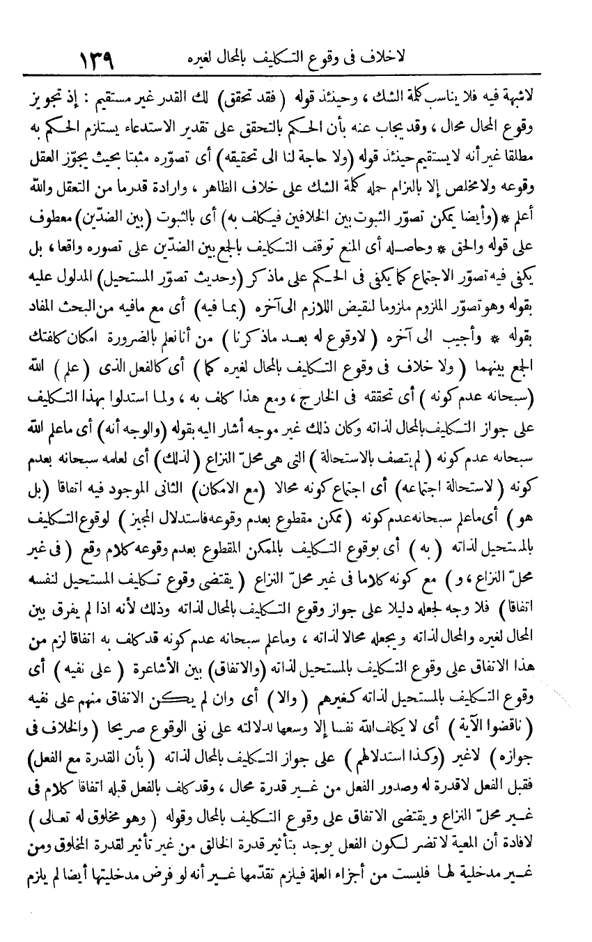 لَا شُبْهَة فِيهِ فَلَا يُنَاسب كلمة الشَّك، وَحِينَئِذٍ قَوْله (فقد تحقق) لَك الْقدر غير مُسْتَقِيم: إِذْ تَجْوِيز وُقُوع الْمحَال محَال، وَقد يُجَاب عَنهُ بِأَن الحكم بالتحقق على تَقْدِير الاستدعاء يسْتَلْزم الحكم بِهِ مُطلقًا غير أَنه لَا يَسْتَقِيم حِينَئِذٍ قَوْله (وَلَا حَاجَة لنا إِلَى تَحْقِيقه) أَي تصَوره مثبتا بِحَيْثُ يجوز الْعقل وُقُوعه وَلَا مخلص إِلَّا بِالْتِزَام حمله كلمة الشَّك على خلاف الظَّاهِر، وَإِرَادَة قدر مَا من التعقل وَالله أعلم (وَأَيْضًا يُمكن تصور الثُّبُوت بَين الخلافين فيكلف بِهِ) أَي بالثبوت (بَين الضدين) مَعْطُوف على قَوْله وَالْحق وَحَاصِله أَي الْمَنْع توقف التَّكْلِيف بِالْجمعِ بَين الضدين على تصَوره وَاقعا، بل يَكْفِي فِيهِ تصور الِاجْتِمَاع كَمَا يَكْفِي فِي الحكم على مَا ذكر (وَحَدِيث تصور المستحيل) الْمَدْلُول عَلَيْهِ بقوله وَهُوَ تصور الْمَلْزُوم ملزوما لنقيض اللَّازِم إِلَى آخِره (بِمَا فِيهِ) أَي مَعَ مَا فِيهِ من الْبَحْث المفاد بقوله وَأجِيب إِلَى آخِره (لَا وُقُوع لَهُ بعد مَا ذكرنَا) من أَنا نعلم بِالضَّرُورَةِ إِمْكَان كلفتك الْجمع بَينهمَا (وَلَا خلاف فِي وُقُوع التَّكْلِيف بالمحال لغيره كَمَا) أَي كالفعل الَّذِي (علم) الله (سُبْحَانَهُ عدم كَونه) أَي تحَققه فِي الْخَارِج، وَمَعَ هَذَا كلف بِهِ، وَلما استدلوا بِهَذَا التَّكْلِيف على جَوَاز التَّكْلِيف بالمحال لذاته وَكَانَ ذَلِك غير موجه أَشَارَ إِلَيْهِ بقوله (وَالْوَجْه أَنه) أَي مَا علم الله سُبْحَانَهُ عدم كَونه (لم يَتَّصِف بالاستحالة) الَّتِي هِيَ مَحل النزاع (لذَلِك) أَي لعلمه سُبْحَانَهُ بِعَدَمِ كَونه (لِاسْتِحَالَة اجتماعه) أَي اجْتِمَاع كَونه محالا (مَعَ الْإِمْكَان) الثَّانِي الْمَوْجُود فِيهِ اتِّفَاقًا (بل هُوَ) أَي مَا علم سُبْحَانَهُ عدم كَونه (مُمكن مَقْطُوع بِعَدَمِ وُقُوعه فاستدل الْمُجِيز) لوُقُوع التَّكْلِيف بالمستحيل لذاته (بِهِ) أَي بِوُقُوع التَّكْلِيف بالممكن الْمَقْطُوع بِعَدَمِ وُقُوعه كَلَام وَقع (فِي غير مَحل النزاع، و) مَعَ كَونه كلَاما فِي غير مَحل النزاع (يَقْتَضِي وُقُوع تَكْلِيف المستحيل لنَفسِهِ اتِّفَاقًا) فَلَا وَجه لجعله دَلِيلا على جَوَاز وُقُوع التَّكْلِيف بالمحال لذاته وَذَلِكَ لِأَنَّهُ إِذا لم يفرق بَين الْمحَال لغيره والمحال لذاته ويجعله محالا لذاته، وَمَا علم سُبْحَانَهُ عدم كَونه قد كلف بِهِ اتِّفَاقًا لزم من هَذَا الِاتِّفَاق على وُقُوع التَّكْلِيف بالمستحيل لذاته (والاتفاق) بَين الأشاعرة (على نَفْيه) أَي وُقُوع التَّكْلِيف بالمستحيل لذاته كغيرهم (وَإِلَّا) أَي وَإِن لم يكن الِاتِّفَاق مِنْهُم على نَفْيه (ناقضوا الْآيَة) أَي لَا يُكَلف الله نفسا إِلَّا وسعهَا لدلالته على نفي الْوُقُوع صَرِيحًا (وَالْخلاف فِي جَوَازه) لَا غير (وَكَذَا استدلالهم) على جَوَاز التَّكْلِيف بالمحال لذاته (بِأَن الْقُدْرَة مَعَ الْفِعْل) فَقبل الْفِعْل لَا قدرَة لَهُ وصدور الْفِعْل من غير قدرَة محَال، وَقد كلف بِالْفِعْلِ قبله اتِّفَاقًا كَلَام فِي غير مَحل النزاع وَيَقْتَضِي الِاتِّفَاق على وُقُوع التَّكْلِيف بالمحال وَقَوله (وَهُوَ مَخْلُوق لَهُ تَعَالَى) لإِفَادَة أَن الْمَعِيَّة لَا تضر لكَون الْفِعْل يُوجد بتأثير قدرَة الْخَالِق من غير تَأْثِير لقدرة الْمَخْلُوق وَمن غير مدخلية لَهَا فَلَيْسَتْ من أَجزَاء الْعلَّة فليزم تقدمها غير أَنه لَو فرض مدخليتها أَيْضا لم يلْزم