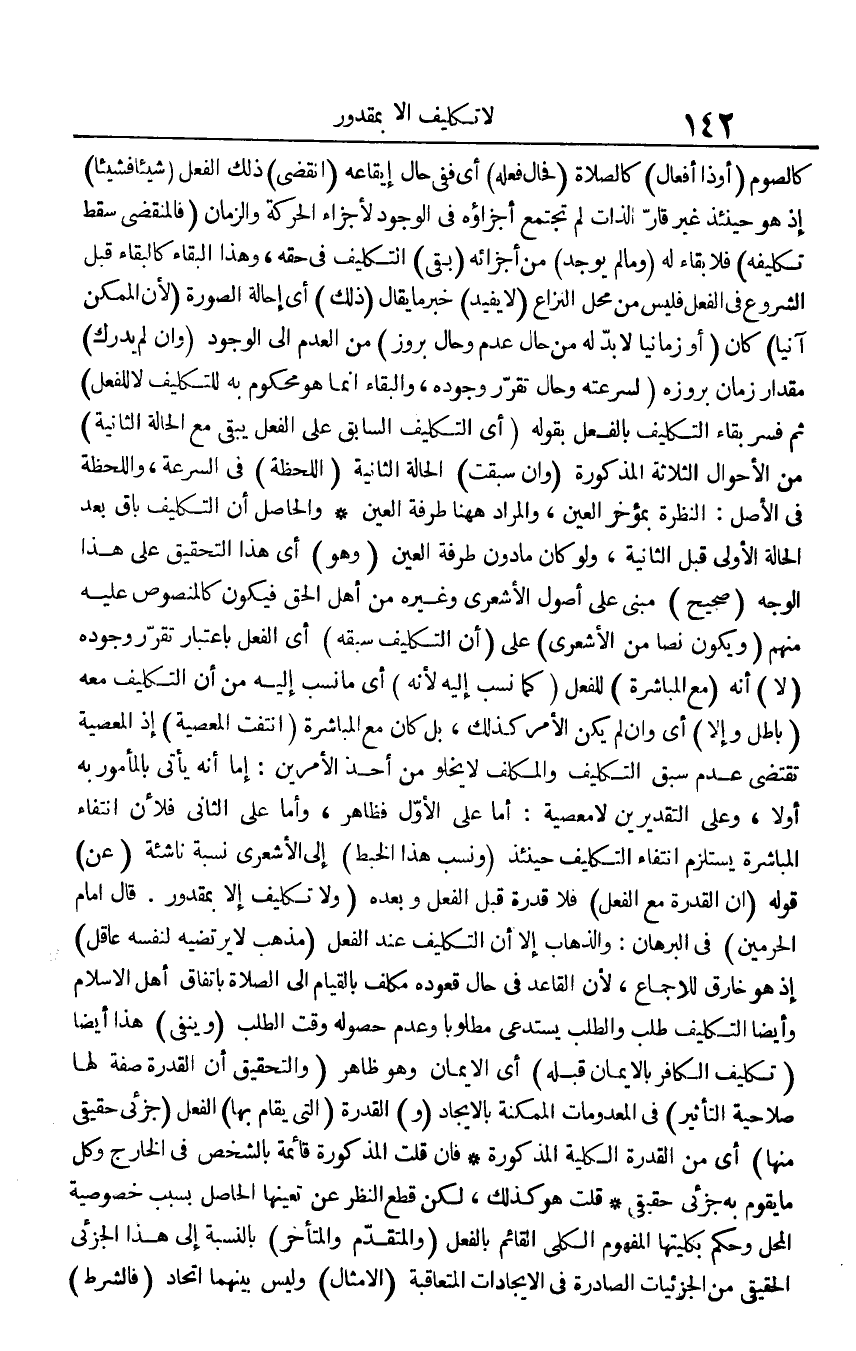 كَالصَّوْمِ (أَو ذَا أَفعَال) كَالصَّلَاةِ (فحال فعله) أَي فَفِي حَال إِيقَاعه (انْقَضى) ذَلِك الْفِعْل شَيْئا فَشَيْئًا) إِذْ هُوَ حِينَئِذٍ غير قار الذَّات لم تَجْتَمِع أجزاؤه فِي الْوُجُود لأجزاء الْحَرَكَة وَالزَّمَان (فالمنقضي سقط تَكْلِيفه) فَلَا بَقَاء لَهُ (وَمَا لم يُوجد) من أَجْزَائِهِ (بَقِي) التَّكْلِيف فِي حَقه، وَهَذَا الْبَقَاء كالبقاء قبل الشُّرُوع فِي الْفِعْل فَلَيْسَ من مَحل النزاع (لَا يُفِيد) خبر مَا يُقَال (ذَلِك) أَي إِحَالَة الصُّورَة (لِأَن الْمُمكن آنيا) كَانَ (أَو زمانيا) لَا بُد لَهُ من حَال عدم وَحَال بروز) من الْعَدَم إِلَى الْوُجُود (وَإِن لم يدْرك) مِقْدَار زمَان بروزه (لسرعته وَحَال تقرر وجوده، والبقاء إِنَّمَا هُوَ مَحْكُوم بِهِ للتكليف لَا للْفِعْل) ثمَّ فسر بَقَاء التَّكْلِيف بِالْفِعْلِ بقوله (أَي التَّكْلِيف السَّابِق على الْفِعْل يبْقى مَعَ الْحَالة الثَّانِيَة) من الْأَحْوَال الثَّلَاثَة الْمَذْكُورَة (وَإِن سبقت) الْحَالة الثَّانِيَة (اللحظة) فِي السرعة، واللحظة فِي الأَصْل: النظرة بمؤخر الْعين، وَالْمرَاد هَهُنَا طرفَة الْعين وَالْحَاصِل أَن التَّكْلِيف بَاقٍ بعد الْحَالة الأولى قبل الثَّانِيَة، وَلَو كَانَ مَا دون طرفَة الْعين (وَهُوَ) أَي هَذَا التَّحْقِيق على هَذَا الْوَجْه (صَحِيح) مَبْنِيّ على أصُول الْأَشْعَرِيّ وَغَيره من أهل الْحق فَيكون كالمنصوص عَلَيْهِ مِنْهُم (وَيكون نصا من الْأَشْعَرِيّ) على (أَن التَّكْلِيف سبقه) أَي الْفِعْل بِاعْتِبَار تقرر وجوده (لَا) أَنه (مَعَ الْمُبَاشرَة) للْفِعْل (كَمَا نسب إِلَيْهِ لِأَنَّهُ) أَي مَا نسب إِلَيْهِ من أَن التَّكْلِيف مَعَه (بَاطِل وَإِلَّا) أَي وَإِن لم يكن الْأَمر كَذَلِك، بل كَانَ مَعَ الْمُبَاشرَة (انْتَفَت الْمعْصِيَة) إِذْ الْمعْصِيَة تَقْتَضِي عدم سبق التَّكْلِيف والمكلف لَا يَخْلُو من أحد الْأَمريْنِ: إِمَّا أَنه يَأْتِي بالمأمور بِهِ أَو لَا، وعَلى التَّقْدِيرَيْنِ لَا مَعْصِيّة: أما على الأول فَظَاهر، وَأما على الثَّانِي فَلِأَن انْتِفَاء الْمُبَاشرَة يسْتَلْزم انْتِفَاء التَّكْلِيف حِينَئِذٍ (وَنسب هَذَا الْخبط) إِلَى الْأَشْعَرِيّ نِسْبَة ناشئة (عَن) قَوْله (أَن الْقُدْرَة مَعَ الْفِعْل) فَلَا قدرَة قبل الْفِعْل وَبعده (وَلَا تَكْلِيف إِلَّا بمقدور. قَالَ إِمَام الْحَرَمَيْنِ) فِي الْبُرْهَان: والذهاب إِلَّا أَن التَّكْلِيف عِنْد الْفِعْل (مَذْهَب لَا يرتضيه لنَفسِهِ عَاقل) إِذْ هُوَ خارق للاجماع، لِأَن الْقَاعِد فِي الْحَال قعوده مُكَلّف بِالْقيامِ إِلَى الصَّلَاة بِاتِّفَاق أهل الْإِسْلَام وَأَيْضًا التَّكْلِيف طلب والطلب يَسْتَدْعِي مَطْلُوبا وَعدم حُصُوله وَقت الطّلب (وينفي) هَذَا أَيْضا (تَكْلِيف الْكَافِر بِالْإِيمَان قبله) أَي الْإِيمَان وَهُوَ ظَاهر (وَالتَّحْقِيق أَن الْقُدْرَة صفة لَهَا صَلَاحِية التَّأْثِير) فِي المعدومات الممكنة بالإيجاد (و) الْقُدْرَة (الَّتِي يُقَام بهَا) الْفِعْل (جزئي حَقِيقِيّ مِنْهَا) أَي من الْقُدْرَة الْكُلية الْمَذْكُورَة فَإِن قلت الْمَذْكُورَة قَائِمَة بالشخص فِي الْخَارِج وكل مَا يقوم بِهِ جزئي حَقِيقِيّ قلت هُوَ كَذَلِك، لَكِن قطع النّظر عَن تعينها الْحَاصِل بِسَبَب خُصُوصِيَّة الْمحل وَحكم بكليتها الْمَفْهُوم الْكُلِّي الْقَائِم بِالْفِعْلِ (والمتقدم والمتأخر) بِالنِّسْبَةِ إِلَى هَذَا الجزئي الْحَقِيقِيّ من الجزئيات الصادرة فِي الإيجادات المتعاقبة (الْأَمْثَال) وَلَيْسَ بَينهمَا اتِّحَاد (فَالشَّرْط)