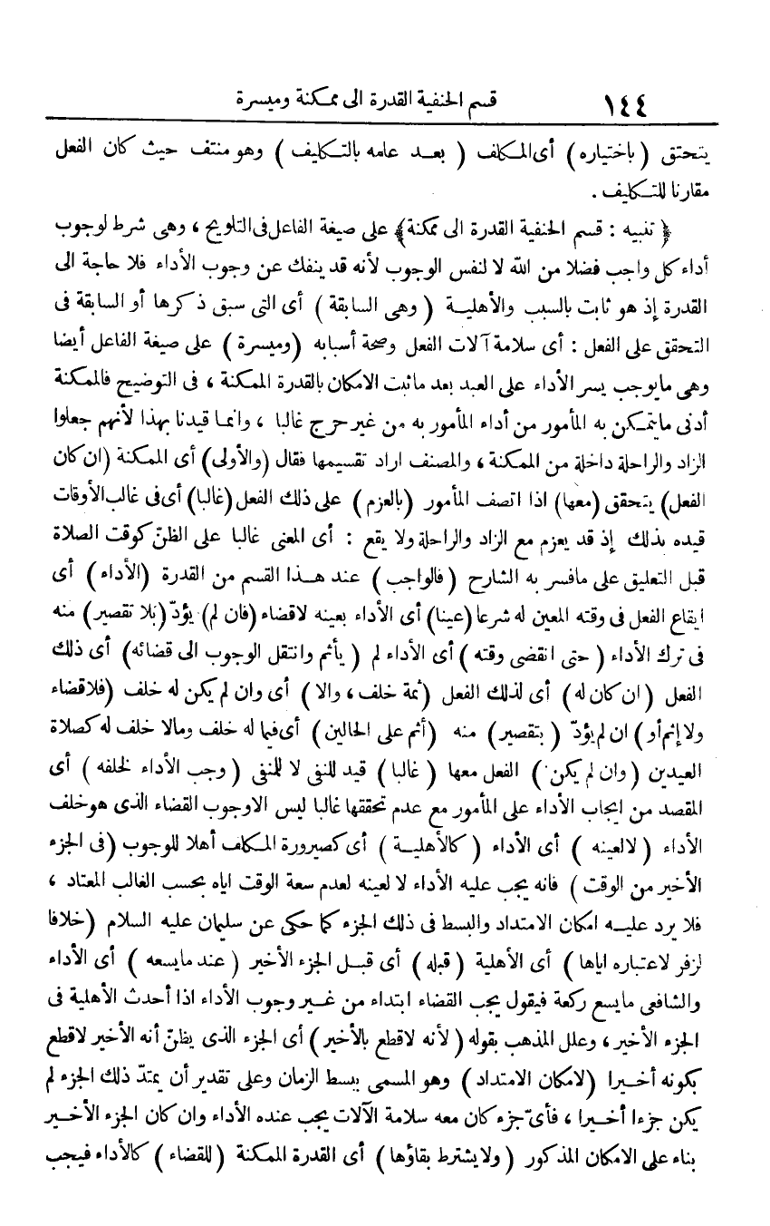 (تَنْبِيه: قسم الْحَنَفِيَّة الْقُدْرَة إِلَى مُمكنَة) على صِيغَة الْفَاعِل فِي التَّلْوِيح، وَهُوَ شَرط لوُجُوب أَدَاء كل وَاجِب فضلا من الله لَا لنَفس الْوُجُوب لِأَنَّهُ قد يَنْفَكّ عَن وجوب الْأَدَاء فَلَا حَاجَة إِلَى الْقُدْرَة إِذْ هُوَ ثَابت بِالسَّبَبِ والأهلية (وَهِي السَّابِقَة) أَي الَّتِي سبق ذكرهَا أَو السَّابِقَة فِي التحقق على الْفِعْل: أَي سَلامَة آلَات الْفِعْل وَصِحَّة أَسبَابه (وميسرة) على صِيغَة الْفَاعِل أَيْضا وَهِي مَا يُوجب يسر الْأَدَاء على العَبْد بعد مَا ثَبت الْإِمْكَان بِالْقُدْرَةِ الممكنة، فِي التَّوْضِيح فالممكنة أدنى مَا يتَمَكَّن بِهِ الْمَأْمُور من أَدَاء الْمَأْمُور بِهِ من غير حرج غَالِبا، وَإِنَّمَا قيدنَا بِهَذَا لأَنهم جعلُوا الزَّاد وَالرَّاحِلَة دَاخِلَة من الممكنة، وَالْمُصَنّف أَرَادَ تقسيمها فَقَالَ (وَالْأولَى) أَي الممكنة (إِن كَانَ الْفِعْل) يتَحَقَّق (مَعهَا) إِذا اتّصف الْمَأْمُور (بالعزم) على ذَلِك الْفِعْل (غَالِبا) أَي فِي غَالب الْأَوْقَات قَيده بذلك إِذْ قد يعزم مَعَ الزَّاد وَالرَّاحِلَة وَلَا يَقع: أَي الْمَعْنى غَالِبا على الظَّن كوقت الصَّلَاة قبل التَّعْلِيق على مَا فسر بِهِ الشَّارِح (فَالْوَاجِب) عِنْد هَذَا الْقسم من الْقُدْرَة (الْأَدَاء) أَي إِيقَاع الْفِعْل فِي وقته الْمعِين لَهُ شرعا (عينا) أَي الْأَدَاء بِعَيْنِه لَا قَضَاء (فَإِن لم) يؤد (بِلَا تَقْصِير) مِنْهُ فِي ترك الْأَدَاء (حَتَّى انْقَضى وقته) أَي الْأَدَاء لم (يَأْثَم وانتقل الْوُجُوب إِلَى قَضَائِهِ) أَي ذَلِك الْفِعْل (إِن كَانَ لَهُ) أَي لذَلِك الْفِعْل (ثمَّة خلف، وَإِلَّا) أَي وَإِن لم يكن لَهُ خلف (فَلَا قَضَاء وَلَا إِثْم أَو) إِن لم يؤد (بتقصير) مِنْهُ (أَثم على الْحَالين) أَي فِيمَا لَهُ خلف وَمَا لَا خلف لَهُ كَصَلَاة الْعِيدَيْنِ (وَإِن لم يكن) الْفِعْل مَعهَا (غَالِبا) قيد للنَّفْي لَا للمنفي (وَجب الْأَدَاء لخلفه) أَي الْمَقْصد من إِيجَاب الْأَدَاء على الْمَأْمُور مَعَ عدم تحققها غَالِبا لَيْسَ إِلَّا وجوب الْقَضَاء الَّذِي هُوَ خلف الْأَدَاء (لَا لعَينه) أَي الْأَدَاء (كالأهلية) أَي كصيرورة الْمُكَلف أَهلا للْوُجُوب (فِي الْجُزْء الْأَخير من الْوَقْت) فَإِنَّهُ يجب عَلَيْهِ الْأَدَاء لَا لعَينه لعدم سَعَة الْوَقْت إِيَّاه بِحَسب الْغَالِب الْمُعْتَاد، فَلَا يرد عَلَيْهِ إِمْكَان الامتداد والبسط فِي ذَلِك الْجُزْء كَمَا حكى عَن سُلَيْمَان عَلَيْهِ السَّلَام (خلافًا لزفَر لاعتباره إِيَّاهَا) أَي الْأَهْلِيَّة (قبله) أَي قبل الْجُزْء الْأَخير (عِنْدَمَا يَسعهُ) أَي الْأَدَاء وَالشَّافِعِيّ مَا يسع رَكْعَة فَيَقُول يجب الْقَضَاء ابْتِدَاء من غير وجوب الْأَدَاء إِذا أحدث الْأَهْلِيَّة فِي الْجُزْء الْأَخير، وَعلل الْمَذْهَب بقوله (لِأَنَّهُ لَا قطع بالأخير) أَي الْجُزْء الَّذِي يظنّ أَنه الْأَخير لَا قطع بِكَوْنِهِ أخيرا (لَا مَكَان الامتداد) وَهُوَ الْمُسَمّى يبسط الزَّمَان وعَلى تَقْدِير أَن يَمْتَد ذَلِك الْجُزْء لم يكن جُزْءا أخيرا، فَأَي جُزْء كَانَ مَعَه سَلامَة الْآلَات يجب عِنْده الْأَدَاء وَإِن كَانَ الْجُزْء الْأَخير بِنَاء على الْإِمْكَان الْمَذْكُور (وَلَا يشْتَرط بَقَاؤُهَا) أَي الْقُدْرَة الممكنة (للْقَضَاء) كالأداء فَيجب