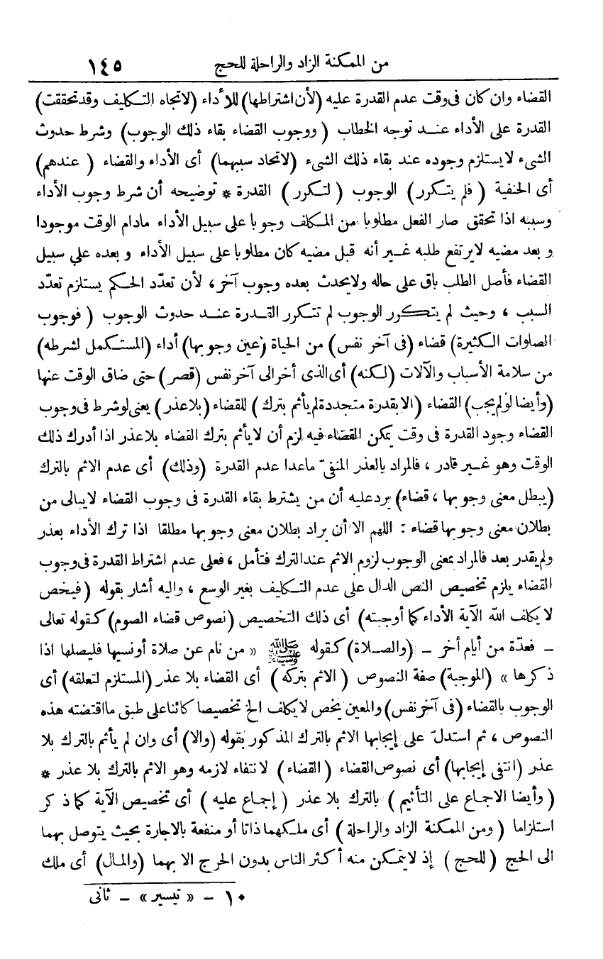 الْقَضَاء وَإِن كَانَ فِي وَقت عدم الْقُدْرَة عَلَيْهِ (لِأَن اشْتِرَاطهَا) للْأَدَاء (لاتجاه التَّكْلِيف وَقد تحققت) الْقُدْرَة على الْأَدَاء عِنْد توجه الْخطاب (وَوُجُوب الْقَضَاء بَقَاء ذَلِك الْوُجُوب) وَشرط حُدُوث الشَّيْء لَا يسْتَلْزم وجوده عِنْد بَقَاء ذَلِك الشَّيْء (لِاتِّحَاد سَببهَا) أَي الْأَدَاء وَالْقَضَاء (عِنْدهم) أَي الْحَنَفِيَّة (فَلم يتَكَرَّر) الْوُجُوب (لتكرر) الْقُدْرَة توضيحة أَن شَرط وجوب الْأَدَاء وَسَببه إِذا تحقق صَار الْفِعْل مَطْلُوبا من الْمُكَلف وجوبا على سَبِيل الْأَدَاء مَا دَامَ الْوَقْت مَوْجُودا وَبعد مضيه لَا يرْتَفع طلبه غير أَنه قبل مضيه كَانَ مَطْلُوبا على سَبِيل الْأَدَاء وَبعده على سَبِيل الْقَضَاء فَأصل الطّلب بَاقٍ على حَاله وَلَا يحدث بعده وجوب آخر، لِأَن تعدد الحكم يسْتَلْزم تعدد السَّبَب، وَحَيْثُ لم يتَكَرَّر الْوُجُوب لم تَتَكَرَّر الْقُدْرَة عِنْد حُدُوث الْوُجُوب (فوجوب الصَّلَوَات الْكَثِيرَة) قَضَاء (فِي آخر نفس) من الْحَيَاة (عين وُجُوبهَا) أَدَاء (المستكمل لشرطه) من سَلامَة الْأَسْبَاب والآلات (لكنه) أَي الَّذِي أخر إِلَى آخر نفس (قصر) حَتَّى ضَاقَ الْوَقْت عَنْهَا (وَأَيْضًا لَو لم يجب) الْقَضَاء (إِلَّا بقدرة متجددة لم يَأْثَم بترك) للْقَضَاء (بِلَا عذر) يَعْنِي لَو شَرط فِي وجوب الْقَضَاء وجود الْقُدْرَة فِي وَقت يُمكن الْقَضَاء فِيهِ لزم أَن لَا يَأْثَم بترك الْقَضَاء بِلَا عذر إِذا أدْرك ذَلِك الْوَقْت وَهُوَ غير قَادر، فَالْمُرَاد بالعذر الْمَنْفِيّ مَا عدا عدم الْقُدْرَة (وَذَلِكَ) أَي عدم الْإِثْم بِالتّرْكِ (يبطل معنى وُجُوبهَا، قَضَاء) يرد عَلَيْهِ أَن من يشْتَرط بَقَاء الْقُدْرَة فِي وجوب الْقَضَاء لَا يُبَالِي من بطلَان معنى وُجُوبهَا قَضَاء: اللَّهُمَّ أَلا أَن يُرَاد بطلَان معنى وُجُوبهَا مُطلقًا إِذا ترك الْأَدَاء بِعُذْر وَلم يقدر بعد فَالْمُرَاد بِمَعْنى الْوُجُوب لُزُوم الْإِثْم عِنْد التّرْك فَتَأمل، فعلى عدم اشْتِرَاط الْقُدْرَة فِي وجوب الْقَضَاء يلْزم تَخْصِيص النَّص الدَّال على عدم التَّكْلِيف بِغَيْر الوسع، وَإِلَيْهِ أَشَارَ بقوله (فيخص لَا بكلف الله الْآيَة الْأَدَاء كَمَا أوجبته) أَي ذَلِك التَّخْصِيص (نُصُوص قَضَاء الصَّوْم) كَقَوْلِه تَعَالَى - {فَعدَّة من أَيَّام أخر} - (وَالصَّلَاة) كَقَوْلِه صلى الله عَلَيْهِ وَسلم " من نَام عَن صَلَاة أَو نَسِيَهَا فليصلها إِذا ذكرهَا " (الْمُوجبَة) صفة النُّصُوص (الْإِثْم بِتَرْكِهِ) أَي الْقَضَاء بِلَا عذر (المستلزم لتَعَلُّقه) أَي الْوُجُوب بِالْقضَاءِ (فِي آخر نفس) والمعين يخص لَا يُكَلف الخ تَخْصِيصًا كَائِنا على طبق مَا اقتضته هَذِه النُّصُوص، ثمَّ اسْتدلَّ على إِيجَابهَا الْإِثْم بِالتّرْكِ الْمَذْكُور بقوله (وَإِلَّا) أَي وَإِن لم يَأْثَم بِالتّرْكِ بِلَا عذر (انْتَفَى إِيجَابهَا) أَي نُصُوص الْقَضَاء (الْقَضَاء) لانْتِفَاء لَازِمَة وَهُوَ الْإِثْم بِالتّرْكِ بِلَا عذر (وَأَيْضًا الْإِجْمَاع على التأثيم) بِالتّرْكِ بِلَا عذر (إِجْمَاع عَلَيْهِ) أَي تَخْصِيص الْآيَة كَمَا ذكر استلزاما (وَمن الممكنة الزَّاد وَالرَّاحِلَة) أَي ملكهمَا ذاتا أَو مَنْفَعَة بِالْإِجَارَة بِحَيْثُ يتَوَصَّل بهما إِلَى الْحَج (لِلْحَجِّ) إِذْ لَا يتَمَكَّن مِنْهُ أَكثر النَّاس بِدُونِ الْحَرج إِلَّا بهما (وَالْمَال) أَي ملك
