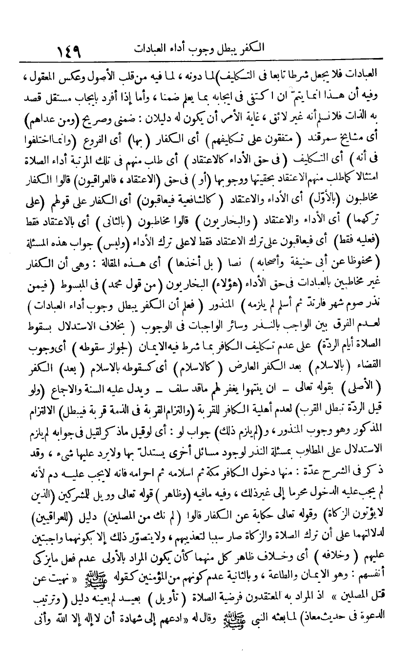 الْعِبَادَات فَلَا يَجْعَل شرطا تَابعا فِي التَّكْلِيف) لما دونه، لما فِيهِ من قلب الْأُصُول وَعكس الْمَعْقُول، وَفِيه أَن هَذَا إِنَّمَا يتم إِن اكْتفى فِي إِيجَابه بِمَا يعلم ضمنا، وَأما إِذا أفرد بِإِيجَاب مُسْتَقل قصد بِهِ الذَّات فَلَا نسلم أَنه غير لَائِق، غَايَة الْأَمر أَن يكون لَهُ دليلان: ضمني وصريح (وَمن عداهم) أَي مَشَايِخ سَمَرْقَنْد (متفقون على تكليفهم) أَي الْكفَّار (بهَا) أَي الْفُرُوع (وَإِنَّمَا اخْتلفُوا فِي أَنه) أَي التَّكْلِيف (فِي حق الْأَدَاء كاعتقاد) أَي طلب مِنْهُم فِي تِلْكَ الْمرتبَة أَدَاء الصَّلَاة امتثالا كَمَا طلب مِنْهُم الِاعْتِقَاد بحقيقتها ووجوبها (أَو) فِي حق (الِاعْتِقَاد، فالعراقيون) قَالُوا الْكفَّار مخاطبون (بِالْأولِ) أَي الْأَدَاء والاعتقاد (كالشافعية فيعاقبون) أَي الْكفَّار على قَوْلهم (على تَركهمَا) أَي الْأَدَاء والاعتقاد (والبخاريون) قَالُوا مخاطبون (بِالثَّانِي) أَي بالاعتقاد فَقَط (فَعَلَيهِ فَقَط) أَي فيعاقبون على ترك الِاعْتِقَاد فَقَط لَا على ترك الْأَدَاء (وَلَيْسَ) جَوَاب هَذِه المسئلة (مَحْفُوظًا عَن أبي حنيفَة وَأَصْحَابه) نصا (بل أَخذهَا) أَي هَذِه الْمقَالة: وَهِي أَن الْكفَّار غير مخاطبين بالعبادات فِي حق الْأَدَاء (هَؤُلَاءِ) البخاريون (من قَول مُحَمَّد) فِي الْمَبْسُوط (فِيمَن نذر صَوْم شهر فَارْتَد ثمَّ أسلم لم يلْزمه) الْمَنْذُور (فَعلم أَن الْكفْر يبطل وجوب أَدَاء الْعِبَادَات) لعدم الْفرق بَين الْوَاجِب بِالنذرِ وَسَائِر الْوَاجِبَات فِي الْوُجُوب (بِخِلَاف الِاسْتِدْلَال بِسُقُوط الصَّلَاة أَيَّام الرِّدَّة) على عدم تَكْلِيف الْكَافِر بِمَا شَرط فِيهِ الْإِيمَان (لجَوَاز سُقُوطه) أَي وجوب الْقَضَاء (بِالْإِسْلَامِ) بعد الْكفْر الْعَارِض (كالإسلام) أَي كسقوطه بِالْإِسْلَامِ (بعد) الْكفْر (الْأَصْلِيّ) بقوله تَعَالَى - {إِن ينْتَهوا يغْفر لَهُم مَا قد سلف} - وَيدل عَلَيْهِ السّنة وَالْإِجْمَاع (وَلَو قيل الرِّدَّة تبطل الْقرب) لعدم أَهْلِيَّة الْكَافِر للقربة (والتزام الْقرْبَة فِي الذِّمَّة قربَة فَيبْطل) الِالْتِزَام الْمَذْكُور وَهُوَ وجوب الْمَنْذُور، و (لم يلْزم ذَلِك) جَوَاب لَو: أَي لَو قيل مَا ذكر لقيل فِي جَوَابه لم يلْزم الِاسْتِدْلَال على الْمَطْلُوب بمسئلة النّذر لوُجُود مسَائِل أُخْرَى يسْتَدلّ بهَا وَلَا يرد عَلَيْهَا شَيْء، وَقد ذكر فِي الشَّرْح عدَّة: مِنْهَا دُخُول الْكَافِر مَكَّة ثمَّ إِسْلَامه ثمَّ إِحْرَامه فَإِنَّهُ لَا يجب عَلَيْهِ دم لِأَنَّهُ لم يجب عَلَيْهِ الدُّخُول محرما إِلَى غير ذَلِك، وَفِيه مَا فِيهِ (وَظَاهر) قَوْله تَعَالَى وويل للْمُشْرِكين (الَّذين لَا يُؤْتونَ الزَّكَاة) وَقَوله تَعَالَى حِكَايَة عَن الْكفَّار قَالُوا (لم نك من الْمُصَلِّين) دَلِيل (للعراقيين) لدلالتهما على أَن ترك الصَّلَاة وَالزَّكَاة صَار سَببا لتعذيبهم، وَلَا يتَصَوَّر ذَلِك إِلَّا بكونهما واجبتين عَلَيْهِم (وخلافه) أَي وَخلاف ظَاهر كل مِنْهُمَا كَأَن يكون المُرَاد بِالْأولَى عدم فعل مَا يُزكي أنفسهم: وَهُوَ الْإِيمَان وَالطَّاعَة، وبالثانية عدم كَونهم من الْمُؤمنِينَ كَقَوْلِه صلى الله عَلَيْهِ وَسلم " نهيت عَن قتل الْمُصَلِّين " إِذْ المُرَاد بِهِ المعتقدون فَرضِيَّة الصَّلَاة (تَأْوِيل) بعيد لم يُعينهُ دَلِيل (وترتيب الدعْوَة فِي حَدِيث معَاذ) لما بَعثه النَّبِي صلى الله عَلَيْهِ وَسلم وَقَالَ لَهُ " ادعهم إِلَى شَهَادَة أَن لَا إِلَه إِلَّا الله وَأَنِّي