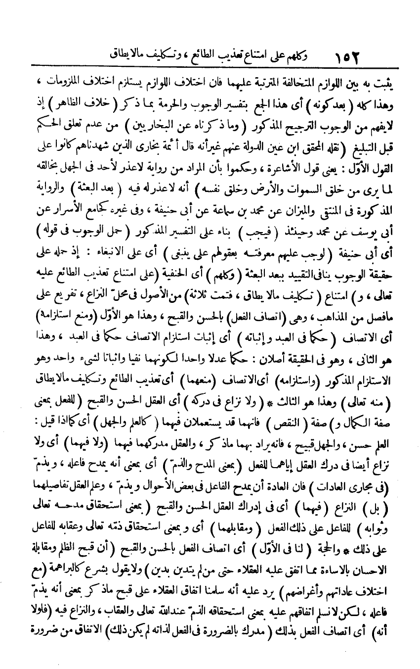 يثبت بِهِ بَين اللوازم المتخالفة المترتبة عَلَيْهِمَا فَإِن اخْتِلَاف اللوازم يسْتَلْزم اخْتِلَاف الملزومات، وَهَذَا كُله (بعد كَونه) أَي هَذَا الْجمع بتفسير الْوُجُوب وَالْحُرْمَة بِمَا ذكر (خلاف الظَّاهِر) إِذْ لَا يفهم من الْوُجُوب التَّرْجِيح الْمَذْكُور (وَمَا ذَكرْنَاهُ عَن البخاريين) من عدم تعلق الحكم قبل التَّبْلِيغ (نَقله الْمُحَقق ابْن عين الدولة عَنْهُم غير أَنه قَالَ أَئِمَّة بُخَارى الَّذين شهدناهم كَانُوا على القَوْل الأول: يَعْنِي قَول الأشاعرة، وحكموا بِأَن المُرَاد من رِوَايَة لَا عذر لأحد فِي الْجَهْل بخالقه لما يرى من خلق السَّمَوَات وَالْأَرْض وَخلق نَفسه) أَنه لَا عذر لَهُ فِيهِ (بعد الْبعْثَة) وَالرِّوَايَة الْمَذْكُورَة فِي الْمُنْتَقى وَالْمِيزَان عَن مُحَمَّد بن سَمَّاعَة عَن أبي حنيفَة، وَفِي غَيره كجامع الْأَسْرَار عَن أبي يُوسُف عَن مُحَمَّد وَحِينَئِذٍ (فَيجب) بِنَاء على التَّفْسِير الْمَذْكُور (حمل الْوُجُوب فِي قَوْله) أَي أبي حنيفَة (لوَجَبَ عَلَيْهِم مَعْرفَته بقَوْلهمْ على يَنْبَغِي) أَي على الانبغاء: إِذْ حمله على حَقِيقَة الْوُجُوب يُنَافِي التَّقْيِيد ببعد الْبعْثَة (وَكلهمْ) أَي الْحَنَفِيَّة (على امْتنَاع تَعْذِيب الطائع عَلَيْهِ تَعَالَى، و) امْتنَاع (تَكْلِيف مَا لَا يُطَاق، فتمت ثَلَاثَة) من الْأُصُول فِي مَحل النزاع، تَفْرِيع على مَا فصل من الْمذَاهب، وَهِي (أَنْصَاف الْفِعْل) بالْحسنِ والقبح، وَهَذَا هُوَ الأول (وَمنع استلزامه) أَي الاتصاف (حكما فِي العَبْد وإثباته) أَي إِثْبَات استلزام الاتصاف حكما فِي العَبْد، وَهَذَا هُوَ الثَّانِي، وَهُوَ فِي الْحَقِيقَة أصلان: حكما عدلا وَاحِدًا لِكَوْنِهِمَا نفيا وإثباتا لشَيْء وَاحِد وَهُوَ الاستلزام الْمَذْكُور (واستلزامه) أَي الاتصاف (منعهما) أَي تَعْذِيب الطائع وتكليف مَا لَا يُطَاق (مِنْهُ تَعَالَى) وَهَذَا هُوَ الثَّالِث (وَلَا نزاع فِي دركه) أَي الْعقل الْحسن والقبح (للْفِعْل بِمَعْنى صفة الْكَمَال و) صفة (النَّقْص) فَإِنَّهُمَا قد يستعملان فيهمَا (كَالْعلمِ وَالْجهل) أَي كَمَا إِذا قيل: الْعلم حسن، وَالْجهل قَبِيح، فَإِنَّهُ يُرَاد بهما مَا ذكر، وَالْعقل مدركهما فيهمَا (وَلَا فيهمَا) أَي وَلَا نزاع أَيْضا فِي دَرك الْعقل إيَّاهُمَا للْفِعْل (بِمَعْنى الْمَدْح والذم) أَي بِمَعْنى أَنه يمدح فَاعله، ويذم (فِي مجاري الْعَادَات) فَإِن الْعَادة أَن يمدح الْفَاعِل فِي بعض الْأَحْوَال ويذم، وَعلم الْعقل تفاصيلهما (بل) النزاع (فيهمَا) أَي فِي إِدْرَاك الْعقل الْحسن والقبح (بِمَعْنى اسْتِحْقَاق مدحه تَعَالَى وثوابه) للْفَاعِل على ذَلِك الْفِعْل (ومقابلهما) أَي وَبِمَعْنى اسْتِحْقَاق ذمه تَعَالَى وعقابه للْفَاعِل على ذَلِك وَالْحجّة (لنا فِي الأول) أَي اتصاف الْفِعْل بالْحسنِ والقبح (أَن قبح الظُّلم ومقابلة الْإِحْسَان بالإساءة مِمَّا اتّفق عَلَيْهِ الْعُقَلَاء حَتَّى من لم يتدين بدين) وَلَا يَقُول بشرع كالبراهمة (مَعَ اخْتِلَاف عاداتهم وأغراضهم) يرد عَلَيْهِ أَنه سلمنَا اتِّفَاق الْعُقَلَاء على قبح مَا ذكر بِمَعْنى أَنه يذم فَاعله، لَكِن لَا نسلم اتِّفَاقهم عَلَيْهِ بِمَعْنى اسْتِحْقَاقه الذَّم عِنْد الله تَعَالَى وَالْعِقَاب، والنزاع فِيهِ (فلولا أَنه) أَي اتصاف الْفِعْل بذلك (مدرك بِالضَّرُورَةِ فِي الْفِعْل لذاته لم يكن ذَلِك) الِاتِّفَاق من ضَرُورَة