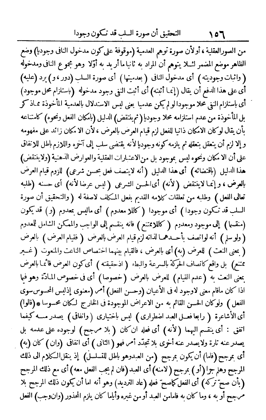 من الصُّور العقلة، أَو لِأَن صُورَة توهم العدمية (مَوْقُوفَة على كَون مَدْخُول النَّافِي وجوديا) وضع الظَّاهِر مَوضِع الْمُضمر لِئَلَّا يتَوَهَّم أَن المُرَاد بِهِ ثَانِيًا مَا أُرِيد بِهِ أَولا وَهُوَ مجوع النَّافِي ومدخوله (وَإِثْبَات وجوديته) أَي مَدْخُول النَّافِي (بعدميتها) أَي صُورَة السَّلب (دور، و) يرد (عَلَيْهِ) أَي على هَذَا الدّفع أَن يُقَال (إِنَّمَا أثْبته) أَي أثبت النَّفْي وجود مدخوله (باستلزام مَحل مَوْجُود) أَي باستلزام النَّفْي محلا مَوْجُودا لَو لم يكن عدميا يَعْنِي لَيْسَ الِاسْتِدْلَال بالعدمية الْمَأْخُوذَة مِمَّا ذكر بل الْمَأْخُوذَة من عدم استلزامه محلا وجوديا (ثمَّ ينْتَقض) الدَّلِيل (بِإِمْكَان الْفِعْل وَنَحْوه) كامتناعه بِأَن يُقَال لَو كَانَ الْإِمْكَان ذاتيا للْفِعْل لزم قيام الْعرض بِالْعرضِ، لِأَن الْإِمْكَان زَائِد على مَفْهُومه وَإِلَّا لزم أَن يتعقل بتعقله ثمَّ يلْزمه كَونه وجوديا لِأَنَّهُ يَقْتَضِي سلب إِلَى آخِره وَاللَّازِم بَاطِل للاتفاق على أَن الْإِمْكَان وَنَحْوه لَيْسَ بموجود بل من الاعتبارات الْعَقْلِيَّة والعوارض الذهنية (وَلَا ينْتَقض) هَذَا الدَّلِيل (باقتضائه) أَي هَذَا الدَّلِيل (أَنه لَا يَتَّصِف فعل بِحسن شَرْعِي) للُزُوم قيام الْعرض بِالْعرضِ، وَإِنَّمَا لَا ينْتَقض (لِأَنَّهُ) أَي الْحسن الشَّرْعِيّ (لَيْسَ عرضا لِأَنَّهُ) أَي حسنه (طلبه تَعَالَى الْفِعْل) وَطَلَبه من تعلقات كَلَامه الْقَدِيم بِفعل الْمُكَلف لَا صفة لَهُ (وَالتَّحْقِيق أَن صُورَة السَّلب قد تكون وجودا) أَي مَوْجُودا (كاللامعدوم) أَي مَا لَيْسَ بمعدوم (و) قد يكون (منقسما) إِلَى مَوْجُود ومعدوم (كاللاممتنع) فَإِنَّهُ يَنْقَسِم إِلَى الْوَاجِب والممكن الشَّامِل للمعدوم (وَلَو سلم) أَنه لَو اتّصف بِأَحَدِهِمَا لذاته لزم قيام الْعرض بِالْعرضِ (فقيام الْعرض) بِالْعرضِ (بِمَعْنى النَّعْت) للعرض (بِهِ) أَي بِالْعرضِ، فالقيام بَينهمَا اخْتِصَاص الناعت والمنعوت (غير مُمْتَنع) بل وَاقع كاتصاف الْحَرَكَة بالسرعة والبطء (إِذْ حَقِيقَته) أَي كَون الْعرض قَائِما بِالْعرضِ بِمَعْنى النَّعْت بِهِ (عدم الْقيام) للعرض بِالْعرضِ (خُصُوصا) أَي فِي خُصُوص الْمَادَّة وَهُوَ فِيمَا إِذا كَانَ مَا قَامَ معنى لَا وجود لَهُ فِي الْأَعْيَان (وَحسن الْفِعْل) أَمر (معنوي إِذْ لَيْسَ المحسوس سوى الْفِعْل) وَلَو كَانَ الْحسن الْقَائِم بِهِ من الْأَعْرَاض الْمَوْجُودَة فِي الْخَارِج لَكَانَ محسوسا (قَالُوا) أَي الأشاعرة (رَابِعا فعل العَبْد اضطراري) لَيْسَ باختياري (واتفاقي) يصدر مِنْهُ كَيْفَمَا اتّفق: أَي يَنْقَسِم إِلَيْهِمَا (لِأَنَّهُ) أَي فعله إِن كَانَ (بِلَا مُرَجّح) لوُجُوده على عَدمه بل يصدر عَنهُ تَارَة وَلَا يصدر عَنهُ أُخْرَى بِلَا تجدّد أَمر فَهُوَ (الثَّانِي) أَي اتفاقي (وَإِن) كَانَ (بِهِ) أَي بمرجح (فإمَّا) أَن يكون بمرجح (من العَبْد وَهُوَ بَاطِل للتسلسل) إِذْ ينْقل الْكَلَام إِلَى ذَلِك الْمُرَجح وهلم جرا (أَو) بمرجح (لَا مِنْهُ) أَي العَبْد (فَإِن لم يجب الْفِعْل مَعَه) أَي مَعَ ذَلِك الْمُرَجح (بِأَن صَحَّ تَركه) أَي الْفِعْل كَمَا صَحَّ فعله (عَاد الترديد) وَهُوَ أَنه إِمَّا أَن يكون ذَلِك الْمُرَجح بِلَا مُرَجّح أَو بِهِ، وَمَا كَانَ بِهِ فإمَّا من العَبْد أَو من غَيره وأياما كَانَ يلْزم الْمَحْذُور (وَإِن وَجب) الْفِعْل
