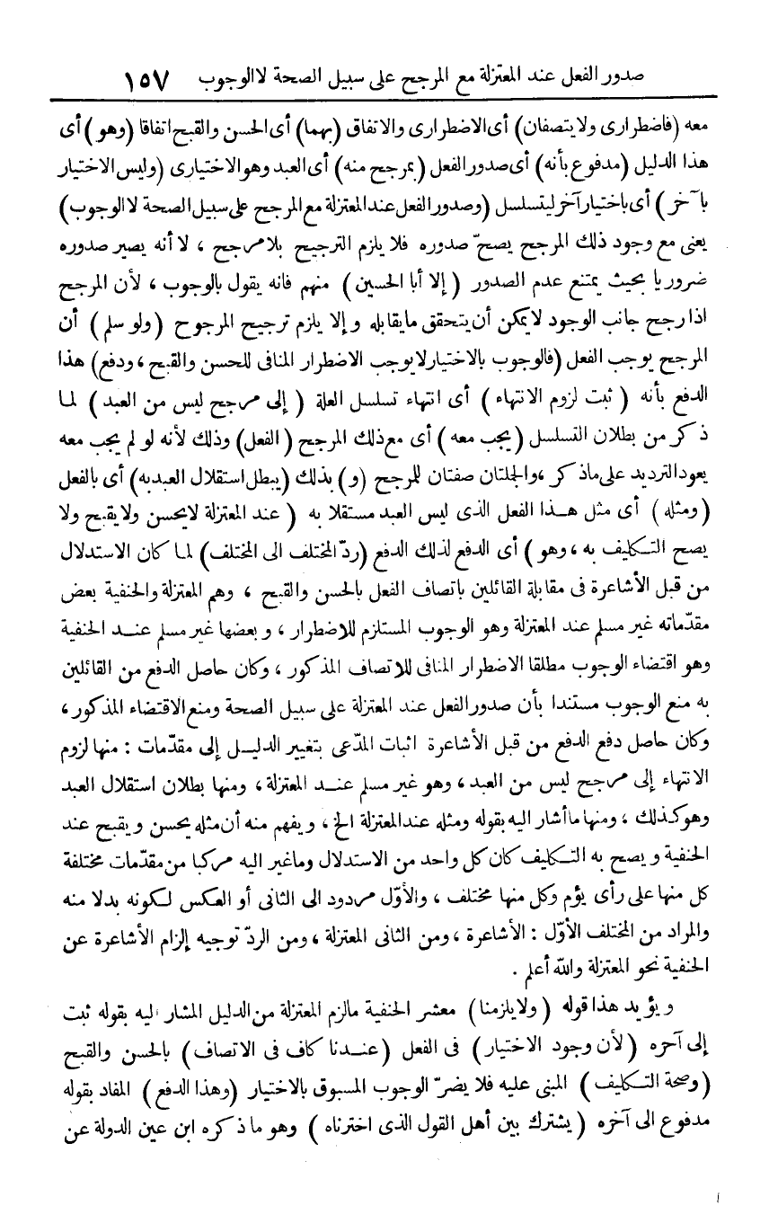 مَعَه (فاضطراري وَلَا يتصفان) أَي الاضطراري والاتفاق (بهما) أَي الْحسن والقبح اتِّفَاقًا (وَهُوَ) أَي هَذَا الدَّلِيل (مَدْفُوع بِأَنَّهُ) أَي صُدُور الْفِعْل (بمرجح مِنْهُ) أَي العَبْد وَهُوَ الِاخْتِيَارِيّ (وَلَيْسَ الِاخْتِيَار بآخر) أَي بِاخْتِيَار آخر ليتسلسل (وصدور الْفِعْل عِنْد الْمُعْتَزلَة مَعَ الْمُرَجح على سَبِيل الصِّحَّة لَا الْوُجُوب) يَعْنِي مَعَ وجود ذَلِك الْمُرَجح يَصح صدوره فَلَا يلْزم التَّرْجِيح بِلَا مُرَجّح، لَا أَنه يصير صدوره ضَرُورِيًّا بِحَيْثُ يمْتَنع عدم الصُّدُور (إِلَّا أَبَا الْحُسَيْن) مِنْهُم فَإِنَّهُ يَقُول بِالْوُجُوب، لِأَن الْمُرَجح إِذا رجح جَانب الْوُجُود لَا يُمكن أَن يتَحَقَّق مَا يُقَابله وَإِلَّا يلْزم تَرْجِيح الْمَرْجُوح (وَلَو سلم) أَن الْمُرَجح يُوجب الْفِعْل (فالوجوب بِالِاخْتِيَارِ لَا يُوجب الِاضْطِرَار الْمنَافِي لِلْحسنِ والقبح، وَدفع) هَذَا الدّفع بِأَنَّهُ (ثَبت لُزُوم الِانْتِهَاء) أَي انْتِهَاء تسلسل الْعلَّة (إِلَى مُرَجّح لَيْسَ من العَبْد) لما ذكر من بطلَان التسلسل (يجب مَعَه) أَي مَعَ ذَلِك الْمُرَجح (الْفِعْل) وَذَلِكَ لِأَنَّهُ لَو لم يجب مَعَه يعود الترديد على مَا ذكر، واجملتان صفتان للمرجح (و) بذلك (يبطل اسْتِقْلَال العبدية) أَي بِالْفِعْلِ (وَمثله) أَي مثل هَذَا الْفِعْل الَّذِي لَيْسَ العَبْد مُسْتقِلّا بِهِ (عِنْد الْمُعْتَزلَة لَا يحسن وَلَا يقبح وَلَا يَصح التَّكْلِيف بِهِ، وَهُوَ) أَي الدّفع لذَلِك الدّفع (رد الْمُخْتَلف الى الْمُخْتَلف) لما كَانَ الِاسْتِدْلَال من قبل الأشاعرة فِي مُقَابلَة الْقَائِلين باتصاف الْفِعْل بالْحسنِ والقبح، وهم الْمُعْتَزلَة وَالْحَنَفِيَّة بعض مقدماته غير مُسلم عِنْد الْمُعْتَزلَة وَهُوَ الْوُجُوب المستلزم للاضطرار، وَبَعضهَا غير مُسلم عِنْد الْحَنَفِيَّة وَهُوَ اقْتِضَاء الْوُجُوب مُطلقًا الِاضْطِرَار الْمنَافِي للاتصاف الْمَذْكُور، وَكَانَ حَاصِل الدّفع من الْقَائِلين بِهِ منع الْوُجُوب مُسْتَندا بِأَن صُدُور الْفِعْل عِنْد الْمُعْتَزلَة على سَبِيل الصِّحَّة وَمنع الِاقْتِضَاء الْمَذْكُور، وَكَانَ حَاصِل دفع الدّفع من قبل الأشاعرة إِثْبَات الْمُدَّعِي بتغيير الدَّلِيل إِلَى مُقَدمَات: مِنْهَا لُزُوم الِانْتِهَاء إِلَى مُرَجّح لَيْسَ من العَبْد، وَهُوَ غير مُسلم عِنْد الْمُعْتَزلَة، وَمِنْهَا بطلَان اسْتِقْلَال العَبْد وَهُوَ كَذَلِك، وَمِنْهَا مَا أَشَارَ إِلَيْهِ بقوله وَمثله عِنْد الْمُعْتَزلَة الخ، وَيفهم مِنْهُ أَن مثله يحسن ويقبح عِنْد الْحَنَفِيَّة وَيصِح بِهِ التَّكْلِيف كَانَ كل وَاحِد من الِاسْتِدْلَال وَمَا غير إِلَيْهِ مركبا من مُقَدمَات مُخْتَلفَة كل مِنْهَا على رَأْي يؤم وكل مِنْهَا مُخْتَلف، وَالْأول مَرْدُود إِلَى الثَّانِي أَو الْعَكْس لكَونه بَدَلا مِنْهُ وَالْمرَاد من الْمُخْتَلف الأول: الأشاعرة، وَمن الثَّانِي الْمُعْتَزلَة، وَمن الرَّد تَوْجِيه إِلْزَام الأشاعرة عَن الْحَنَفِيَّة نَحْو الْمُعْتَزلَة وَالله أعلم.