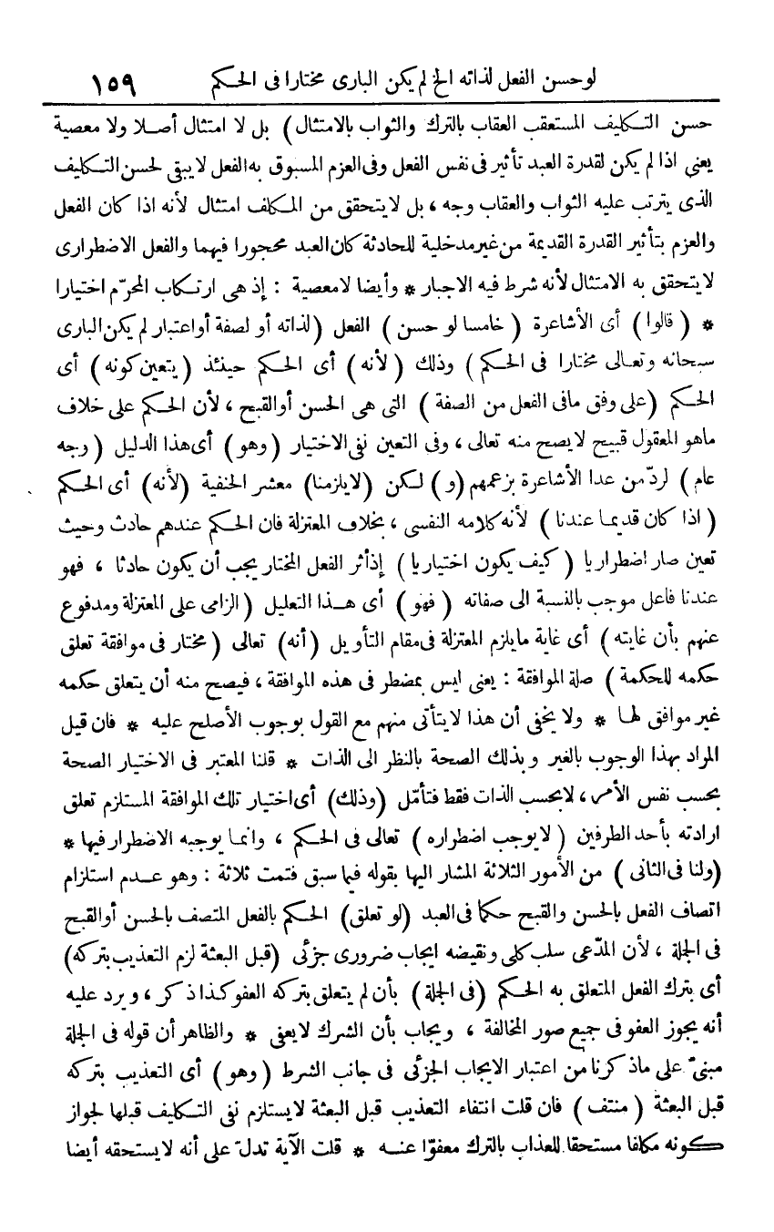 حسن التَّكْلِيف المستعقب الْعقَاب بِالتّرْكِ وَالثَّوَاب بالامتثال) بل لَا امْتِثَال أصلا وَلَا مَعْصِيّة يَعْنِي إِذا لم يكن لقدرة العَبْد تَأْثِير فِي نفس الْفِعْل وَفِي الْعَزْم الْمَسْبُوق بِهِ الْفِعْل لَا يبْقى لحسن التَّكْلِيف الَّذِي يَتَرَتَّب عَلَيْهِ الثَّوَاب وَالْعِقَاب وَجه، بل لَا يتَحَقَّق من الْمُكَلف امْتِثَال لِأَنَّهُ إِذا كَانَ الْفِعْل والعزم بتأثير الْقُدْرَة الْقَدِيمَة من غير مدخلية للحادثة كَانَ العَبْد مَحْجُورا فيهمَا وَالْفِعْل الاضطراري لَا يتَحَقَّق بِهِ الِامْتِثَال لِأَنَّهُ شَرط فِيهِ الْإِجْبَار وَأَيْضًا لَا مَعْصِيّة: إِذْ هِيَ ارْتِكَاب الْمحرم اخْتِيَارا (قَالُوا) أَي الأشاعرة (خَامِسًا لَو حسن) الْفِعْل (لذاته أَو لصفة أَو اعْتِبَار لم يكن الْبَارِي سُبْحَانَهُ وَتَعَالَى مُخْتَارًا فِي الحكم) وَذَلِكَ (لِأَنَّهُ) أَي الحكم حِينَئِذٍ (يتَعَيَّن كَونه) أَي الحكم (على وفْق مَا فِي الْفِعْل من الصّفة) الَّتِي هِيَ الْحسن أَو الْقبْح، لِأَن الحكم على خلاف مَا هُوَ الْمَعْقُول قَبِيح لَا يَصح مِنْهُ تَعَالَى، وَفِي التعين نفي الِاخْتِيَار (وَهُوَ) أَي هَذَا الدَّلِيل (وَجه عَام) لرد من عدا الأشاعرة بزعمهم (و) لَكِن (لَا يلْزمنَا) معشر الْحَنَفِيَّة (لِأَنَّهُ) أَي الحكم (إِذا كَانَ قَدِيما عندنَا) لِأَنَّهُ كَلَامه النَّفْسِيّ، بِخِلَاف الْمُعْتَزلَة فَإِن الحكم عِنْدهم حَادث وَحَيْثُ تعين صَار اضطراريا (كَيفَ يكون اختياريا) إِذْ أثر الْفِعْل الْمُخْتَار يجب أَن يكون حَادِثا، فَهُوَ عندنَا فَاعل مُوجب بِالنِّسْبَةِ إِلَى صِفَاته (فَهُوَ) أَي هَذَا التَّعْلِيل (إلزامي على الْمُعْتَزلَة ومدفوع عَنْهُم بِأَن غَايَته) أَي غَايَة مَا يلْزم الْمُعْتَزلَة فِي مقَام التَّأْوِيل (أَنه) تَعَالَى (مُخْتَار فِي مُوَافقَة تعلق حكمه للحكمة) صلَة الْمُوَافقَة: يَعْنِي لَيْسَ بمضطر فِي هَذِه الْمُوَافقَة، فَيصح مِنْهُ أَن يتَعَلَّق حكمه غير مُوَافق لَهَا وَلَا يخفى أَن هَذَا لَا يَتَأَتَّى مِنْهُم مَعَ القَوْل بِوُجُوب الْأَصْلَح عَلَيْهِ فَإِن قيل المُرَاد بِهَذَا الْوُجُوب بِالْغَيْر وَبِذَلِك الصِّحَّة بِالنّظرِ إِلَى الذَّات قُلْنَا الْمُعْتَبر فِي الِاخْتِيَار الصِّحَّة بِحَسب نفس الْأَمر، لَا بِحَسب الذَّات فَقَط فَتَأمل (وَذَلِكَ) أَي اخْتِيَار تِلْكَ الْمُوَافقَة المستلزم تعلق إِرَادَته بِأحد الطَّرفَيْنِ (لَا يُوجب اضطراره) تَعَالَى فِي الحكم، وَإِنَّمَا يُوجِبهُ الِاضْطِرَار فِيهَا (وَلنَا فِي الثَّانِي) من الْأُمُور الثَّلَاثَة الْمشَار إِلَيْهَا بقوله فِيمَا سبق فتمت ثَلَاثَة: وَهُوَ عدم استلزام اتصاف الْفِعْل بالْحسنِ والقبح حكما فِي العَبْد (لَو تعلق) الحكم بِالْفِعْلِ المتصف بالْحسنِ أَو الْقبْح فِي الْجُمْلَة، لِأَن الْمُدَّعِي سلب كلي ونقيضه إِيجَاب ضَرُورِيّ جزئي (قبل الْبعْثَة لزم التعذيب بِتَرْكِهِ) أَي بترك الْفِعْل الْمُتَعَلّق بِهِ الحكم (فِي الْجُمْلَة) بِأَن لم يتَعَلَّق بِتَرْكِهِ الْعَفو كَذَا ذكر، وَيرد عَلَيْهِ أَنه يجوز الْعَفو فِي جَمِيع صور الْمُخَالفَة، وَيُجَاب بِأَن الشّرك لَا يُعْفَى وَالظَّاهِر أَن قَوْله فِي الْجُمْلَة مَبْنِيّ على مَا ذكرنَا من اعْتِبَار الْإِيجَاب الجزئي فِي جَانب الشَّرْط (وَهُوَ) أَي التعذيب بِتَرْكِهِ قبل الْبعْثَة (مُنْتَفٍ) فَإِن قلت انْتِفَاء التعذيب قبل الْبعْثَة لَا يسْتَلْزم نفي التَّكْلِيف قبلهَا لجَوَاز كَونه مُكَلّفا مُسْتَحقّا للعذاب بِالتّرْكِ معفوا عَنهُ قلت الْآيَة تدل على أَنه لَا يسْتَحقّهُ أَيْضا