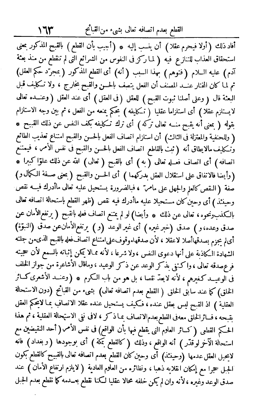 أَفَادَ ذَلِك (أَولا فَيحرم عقلا) أَن ينْسب إِلَيْهِ (أُجِيب بِأَن الْقطع) بالقبح الْمَذْكُور بِمَعْنى اسْتِحْقَاق الْعَذَاب للتنازع فِيهِ (لما ركز فِي النُّفُوس من الشَّرَائِع الَّتِي لم تَنْقَطِع مُنْذُ بعثة آدم) عَلَيْهِ السَّلَام (فَتوهم) بِهَذَا السَّبَب (أَنه) أَي الْقطع الْمَذْكُور (بِمُجَرَّد حكم الْعقل) ثمَّ لما كَانَ الْمُخْتَار عِنْد المُصَنّف أَن الْفِعْل يَتَّصِف بالْحسنِ والقبح بِخَارِج، وَلَا تَكْلِيف قبل الْبعْثَة قَالَ (وعَلى أصلنَا ثُبُوت الْقبْح) لِلْعَقْلِ (فِي الْعقل) أَي عِنْد الْعقل (وَعِنْده تَعَالَى لَا يسْتَلْزم عقلا) أَي استلزاما عقليا (تَكْلِيفه) بِحكم يمنعهُ من الْفِعْل، ثمَّ بَين وَجه الاستلزام بقوله (بِمَعْنى أَنه يقبح مِنْهُ تَعَالَى تَركه) أَي ترك تَكْلِيفه بكف النَّفس عَن ذَلِك الْقَبِيح (وللحنفية والمعتزلة فِي الثَّالِث) أَن استلزام اتصاف الْفِعْل بالْحسنِ والقبح امْتنَاع تَعْذِيب الطائع وتكليف مَا لَا يُطَاق أَنه (ثَبت بالقاطع اتصاف الْفِعْل بالْحسنِ والقبح فِي نفس الْأَمر، فَيمْتَنع اتصافه) أَي اتصاف فعله تَعَالَى (بِهِ) أَي بالقبيح (تَعَالَى) الله عَن ذَلِك علوا كَبِيرا (وَأَيْضًا فالاتفاق على اسْتِقْلَال الْعقل بدركهما) أَي الْحسن والقبح (بِمَعْنى صفة الْكَمَال و) صفة (النَّقْص كَالْعلمِ وَالْجهل على مَا مر، فبالضرورة يَسْتَحِيل عَلَيْهِ تَعَالَى مَا أدْرك فِيهِ نقص وَحِينَئِذٍ) أَي وَحين كَانَ مستحيلا عَلَيْهِ مَا أدْرك فِيهِ نقص (ظهر الْقطع باستحالة اتصافه تَعَالَى بِالْكَذِبِ وَنَحْوه، تَعَالَى عَن ذَلِك وَأَيْضًا) لَو لم يمْتَنع اتصاف فعله بالقبح (يرْتَفع الْأمان عَن صدق وعده، و) صدق (خبر غَيره) أَي غير الْوَعْد (و) يرْتَفع الْأمان عَن صدق (النُّبُوَّة) أَي لم يجْزم بصدقها أصلا لَا عقلا، لِأَن صدقهَا مَوْقُوف على امْتنَاع اتصاف فعله بالقبح الَّذِي من جملَته الشَّهَادَة الكاذبة على أَنَّهَا دَعْوَى النَّفس، وَلَا شرعا، لِأَنَّهُ مِمَّا لَا يُمكن إثْبَاته بِالسَّمْعِ لِأَن حجيته فرع صدقه تَعَالَى، وَاكْتفى بِذكر الْوَعْد عَن ذكر الْوَعيد، وَمَا قَالَ الأشاعرة من جَوَاز الْخلف فِي الْوَعيد كغيرهم، لِأَنَّهُ لَا يعد نقصا، بل هُوَ من بَاب الْكَرم (وَعند الْأَشْعَرِيّ كَسَائِر الْخلق) كَمَا عِنْد سَابق الْخلق (الْقطع بِعَدَمِ اتصافه تَعَالَى) بِشَيْء من القبائح (دون الاستحالة الْعَقْلِيَّة) إِذْ الْقبْح لَيْسَ بعقل عِنْده، فَكيف يَسْتَحِيل عِنْده عقلا الاتصاف بِمَا لَا يحكم الْعقل بقبحه، فسائر الْخلق مَعَه فِي الْقطع بِعَدَمِ الاتصاف بِمَا ذكر، لَا فِي نفي الاستحالة الْعَقْلِيَّة، ثمَّ هَذَا الحكم القطعى (كَسَائِر الْعُلُوم الَّتِي يقطع فِيهَا بِأَن الْوَاقِع) فِي نفس الْأَمر (أحد النقيضين مَعَ اسْتِحَالَة الآخر لَو قدر) أَنه الْوَاقِع، وَذَلِكَ (كالقطع بِمَكَّة) أَي بوجودها (وبغداد) فَإِنَّهُ لَا يحِيل الْعقل عدمهَا (وَحِينَئِذٍ) أَي وَحين كَانَ الْقطع بِعَدَمِ اتصافه تَعَالَى بالقبيح كالقطع بِكَوْن الْجَبَل حجرا مَعَ إِمْكَان انقلابه ذَهَبا، ونظائره من الْعُلُوم العادية (لَا يلْزم ارْتِفَاع الْأمان) عِنْد صدق الْوَعْد وَغَيره، لِأَنَّهُ وَإِن لم يكن خَلفه محالا عقليا لَكنا نقطع بِعَدَمِهِ كَمَا نقطع بِعَدَمِ الْجَبَل