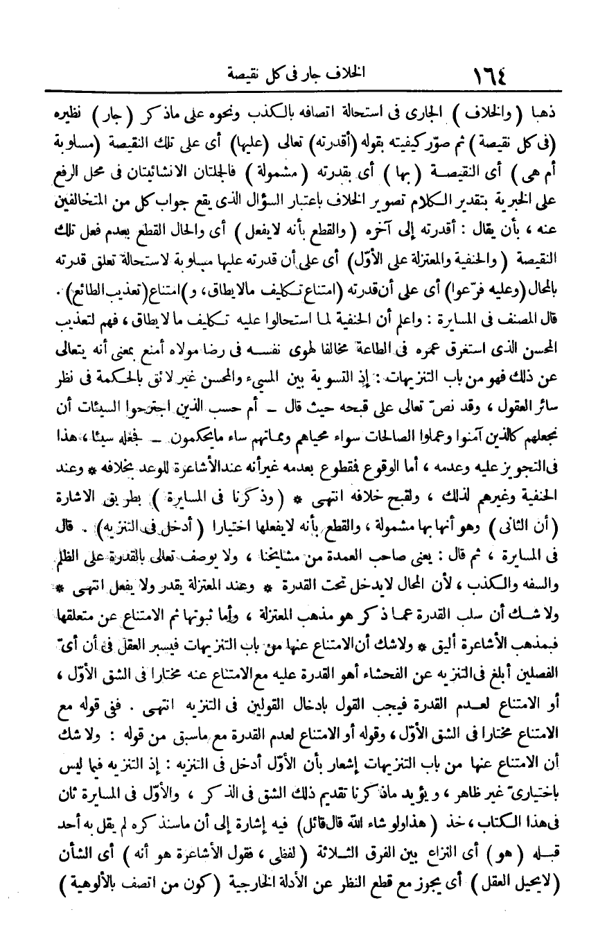 ذَهَبا (وَالْخلاف) الْجَارِي فِي اسْتِحَالَة اتصافه بِالْكَذِبِ وَنَحْوه على مَا ذكر (جَار) نَظِيره (فِي كل نقيصة) ثمَّ صور كيفيته بقوله (أقدرته) تَعَالَى (عَلَيْهَا) أَي على تِلْكَ النقيصة (مسلوبة أم هِيَ) أَي النقيصة (بهَا) أَي بقدرته (مشمولة) فالجملتان الإنشائيتان فِي مَحل الرّفْع على الخبرية بِتَقْدِير الْكَلَام تَصْوِير الْخلاف بِاعْتِبَار السُّؤَال الَّذِي يَقع جَوَاب كل من المتخالفين عَنهُ، بِأَن يُقَال: أقدرته إِلَى آخِره (وَالْقطع بِأَنَّهُ لَا يفعل) أَي وَالْحَال الْقطع بِعَدَمِ فعل تِلْكَ النقيصة (وَالْحَنَفِيَّة والمعتزلة على الأول) أَي على أَن قدرته عَلَيْهَا مسلوبة لِاسْتِحَالَة تعلق قدرته بالمحال (وَعَلِيهِ فرعوا) أَي على أَن قدرته (امْتنَاع تَكْلِيف مَا لَا يُطَاق، و) امْتنَاع (تَعْذِيب الطائع). قَالَ المُصَنّف فِي المسايرة: وَاعْلَم أَن الْحَنَفِيَّة لما استحالوا عَلَيْهِ تَكْلِيف مَا لَا يُطَاق، فهم لتعذيب المحسن الَّذِي استغرق عمره فِي الطَّاعَة مُخَالفا لهوى نَفسه فِي رضَا مَوْلَاهُ أمنع بِمَعْنى أَنه يتعالى عَن ذَلِك فَهُوَ من بَاب التنزيهات: إِذْ التَّسْوِيَة بَين الْمُسِيء والمحسن غير لَائِق بالحكمة فِي نظر سَائِر الْعُقُول، وَقد نَص تَعَالَى على قبحه حَيْثُ قَالَ - {أم حسب الَّذين اجترحوا السَّيِّئَات أَن نجعلهم كَالَّذِين آمنُوا وَعمِلُوا الصَّالِحَات سَوَاء محياهم ومماتهم سَاءَ مَا يحكمون} - فَجعله سَيِّئًا، هَذَا فِي التجويز عَلَيْهِ وَعَدَمه، أما الْوُقُوع فمقطوع بِعَدَمِهِ غير أَنه عِنْد الأشاعرة للوعد بِخِلَافِهِ وَعند الْحَنَفِيَّة وَغَيرهم لذَلِك، ولقبح خِلَافه انْتهى (وَذكرنَا فِي المسايرة) بطرِيق الْإِشَارَة (أَن الثَّانِي) وَهُوَ أَنَّهَا بهَا مشمولة، وَالْقطع بِأَنَّهُ لَا يَفْعَلهَا اخْتِيَارا (أَدخل فِي التَّنْزِيه). قَالَ فِي المسايرة، ثمَّ قَالَ: يَعْنِي صَاحب الْعُمْدَة من مَشَايِخنَا، وَلَا يُوصف تَعَالَى بِالْقُدْرَةِ على الظُّلم والسفه وَالْكذب، لِأَن الْمحَال لَا يدْخل تَحت الْقُدْرَة وَعند الْمُعْتَزلَة يقدر وَلَا يفعل انْتهى وَلَا شكّ أَن سلب الْقُدْرَة عَمَّا ذكر هُوَ مَذْهَب الْمُعْتَزلَة، وَأما ثُبُوتهَا ثمَّ الِامْتِنَاع عَن متعلقها فمذهب الأشاعرة أليق وَلَا شكّ أَن الِامْتِنَاع عَنْهَا من بَاب التنزيهات فيسبر الْعقل فِي أَن أَي الْفَصْلَيْنِ أبلغ فِي التَّنْزِيه عَن الْفَحْشَاء أهوَ الْقُدْرَة عَلَيْهِ مَعَ الِامْتِنَاع عَنهُ مُخْتَارًا فِي الشق الأول، أَو الِامْتِنَاع لعدم الْقُدْرَة فَيجب القَوْل بِإِدْخَال الْقَوْلَيْنِ فِي التَّنْزِيه انْتهى. فَفِي قَوْله مَعَ الِامْتِنَاع مُخْتَارًا فِي الشق الأول، وَقَوله أَو الِامْتِنَاع لعدم الْقُدْرَة مَعَ مَا سبق من قَوْله: وَلَا شكّ أَن الِامْتِنَاع عَنْهَا من بَاب التنزيهات إِشْعَار بِأَن الأول أَدخل فِي التَّنْزِيه: إِذْ التَّنْزِيه فِيمَا لَيْسَ باختياري غير ظَاهر، وَيُؤَيّد مَا ذكرنَا تَقْدِيم ذَلِك الشق فِي الذّكر، وَالْأول فِي المسايرة ثَان فِي هَذَا الْكتاب، خُذ (هَذَا وَلَو شَاءَ الله قَالَ قَائِل) فِيهِ إِشَارَة إِلَى أَن مَا سَنذكرُهُ لم يقل بِهِ أحد قبله (هُوَ) أَي النزاع بَين الْفرق الثَّلَاثَة (لَفْظِي، فَقَوْل الأشاعرة هُوَ أَنه) أَي الشَّأْن (لَا يحِيل الْعقل) أَي يجوز مَعَ قطع النّظر عَن الْأَدِلَّة الخارجية (كَون من اتّصف بالألوهية)