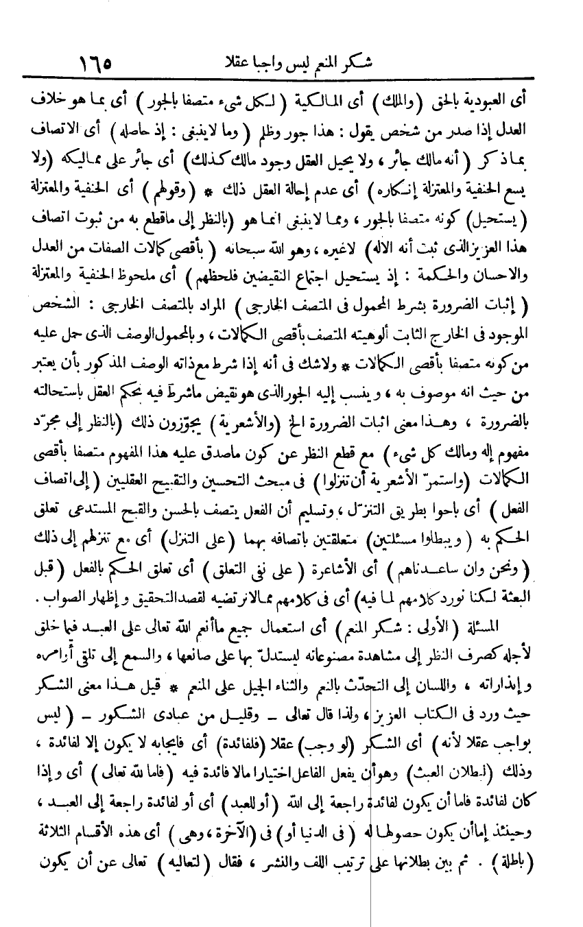 المسئلة (الأولى: شكر الْمُنعم) أَي اسْتِعْمَال جَمِيع مَا أنعم الله تَعَالَى على العَبْد فِيمَا خلق لأَجله كصرف النّظر إِلَى مُشَاهدَة مصنوعاته ليستدل بهَا على صانعها، والسمع إِلَى تلقي أوامره وإنذاراته، وَاللِّسَان إِلَى التحدث بِالنعَم وَالثنَاء الْجَمِيل على الْمُنعم قيل هَذَا معنى الشُّكْر حَيْثُ ورد فِي الْكتاب الْعَزِيز، وَلذَا قَالَ تَعَالَى - {وَقَلِيل من عبَادي الشكُور} - (لَيْسَ بِوَاجِب عقلا لِأَنَّهُ) أَي الشُّكْر (لَو وَجب) عقلا (فلفائدة) أَي فإيجابه لَا يكون إِلَّا لفائدة. وَذَلِكَ (لبُطْلَان الْعَبَث) وَهُوَ أَن يفعل الْفَاعِل اخْتِيَارا مَا لَا فَائِدَة فِيهِ (فإمَّا لله تَعَالَى) أَي وَإِذا كَانَ لفائدة فإمَّا أَن يكون لفائدة رَاجِعَة إِلَى الله (أَو للْعَبد) أَي أَو لفائدة رَاجِعَة إِلَى العَبْد، وَحِينَئِذٍ إِمَّا أَن يكون حُصُولهَا لَهُ (فِي الدُّنْيَا أَو) فِي (الْآخِرَة، وَهِي) أَي هَذِه الْأَقْسَام الثَّلَاثَة (بَاطِلَة). ثمَّ بَين بُطْلَانهَا على تَرْتِيب اللف والنشر، فَقَالَ (لتعاليه) تَعَالَى عَن أَن يكون