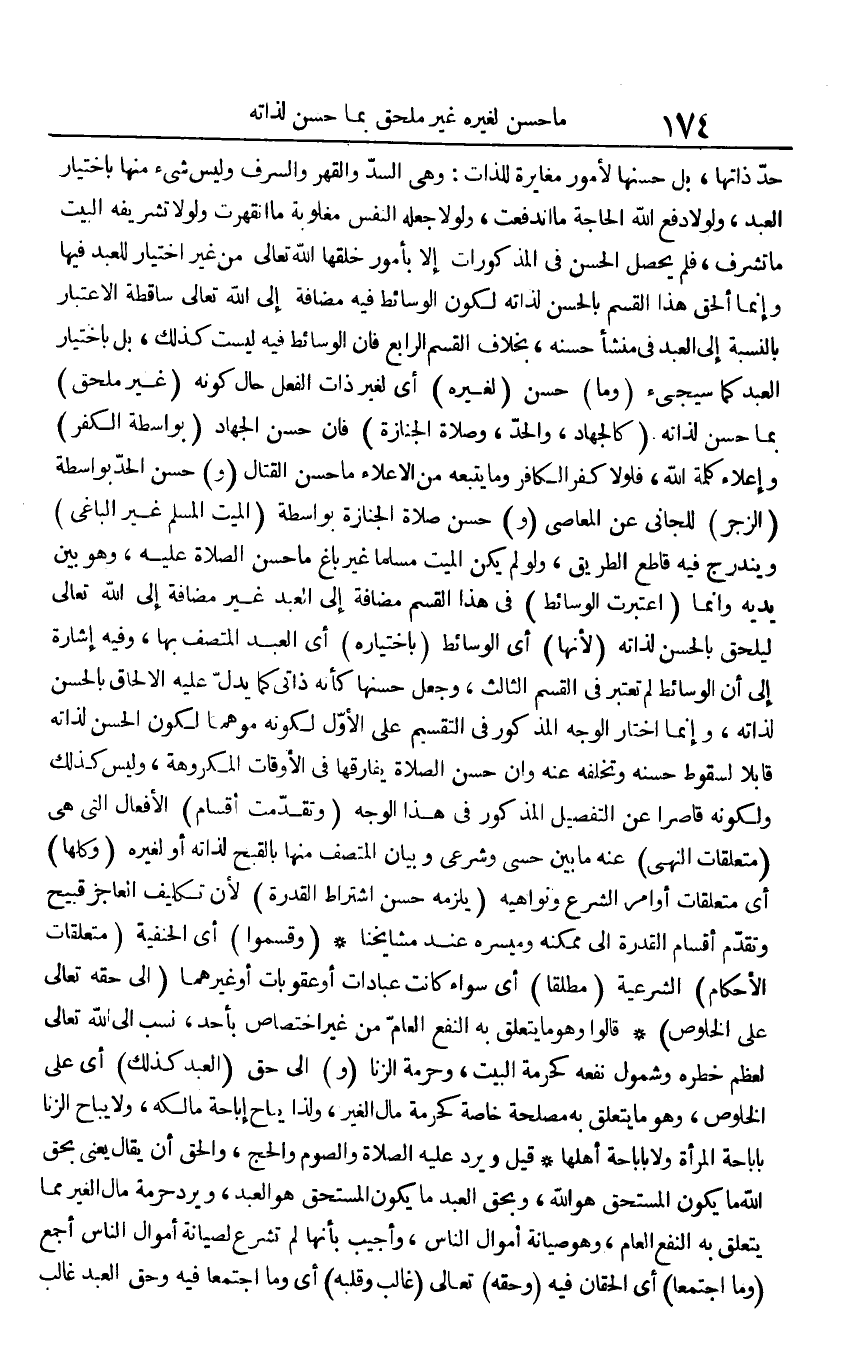 حد ذَاتهَا، بل حسنها لأمور مُغَايرَة للذات: وَهِي السد والقهر والسرف وَلَيْسَ شَيْء مِنْهَا بِاخْتِيَار العَبْد، وَلَوْلَا دفع الله الْحَاجة مَا اندفعت، وَلَوْلَا جعله النَّفس مغلوبة مَا انقهرت وَلَوْلَا تشريفه الْبَيْت مَا تشرف، فَلم يحصل الْحسن فِي الْمَذْكُورَات، إِلَّا بِأُمُور خلقهَا الله تَعَالَى من غير اخْتِيَار للْعَبد فِيهَا وَإِنَّمَا ألحق هَذَا الْقسم بالْحسنِ لذاته لكَون الوسائط فِيهِ مُضَافَة إِلَى الله تَعَالَى سَاقِطَة الِاعْتِبَار بِالنِّسْبَةِ إِلَى العَبْد فِي منشأ حسنه، بِخِلَاف الْقسم الرَّابِع فَإِن الوسائط فه لَيست كَذَلِك، بل بِاخْتِيَار العَبْد كَمَا سَيَجِيءُ (وَمَا) حسن (لغيره) أَي لغير ذَات الْفِعْل حَال كَونه (غير مُلْحق) بِمَا حسن لذاته (كالجهاد، وَالْحَد، وَصَلَاة الْجِنَازَة) فَإِن حسن الْجِهَاد (بِوَاسِطَة الْكفْر) وإعلاء كلمة الله، فلولا كفر الْكَافِر وَمَا يتبعهُ من الإعلاء مَا حسن الْقِتَال (و) حسن الْحَد بِوَاسِطَة (الزّجر) للجاني عَن الْمعاصِي (و) حسن صَلَاة الْجِنَازَة بِوَاسِطَة (الْمَيِّت الْمُسلم غير الْبَاغِي) ويندرج فِيهِ قَاطع الطَّرِيق، وَلَو لم يكن الْمَيِّت مُسلما غير بَاغ مَا حسن الصَّلَاة عَلَيْهِ، وَهُوَ بَين يَدَيْهِ وَإِنَّمَا (اعْتبرت الوسائط) فِي هَذَا الْقسم مُضَافَة إِلَى العَبْد غير مُضَافَة إِلَى الله تَعَالَى ليلحق بالْحسنِ لذاته (لِأَنَّهَا) أَي الوسائط (بِاخْتِيَارِهِ) أَي العَبْد المتصف بهَا، وَفِيه إِشَارَة إِلَى أَن الوسائط لم تعْتَبر فِي الْقسم الثَّالِث، وَجعل حسنها كَأَنَّهُ ذاتي كَمَا يدل عَلَيْهِ الْإِلْحَاق بالْحسنِ لذاته، وَإِنَّمَا اخْتَار الْوَجْه الْمَذْكُور فِي التَّقْسِيم على الأول لكَونه موهما لكَون الْحسن لذاته قَابلا لسُقُوط حسنه وتخلفه عَنهُ وَإِن حسن الصَّلَاة يفارقها فِي الْأَوْقَات الْمَكْرُوهَة، وَلَيْسَ كَذَلِك ولكونه قاصرا على التَّفْصِيل الْمَذْكُور فِي هَذَا الْوَجْه (وَتَقَدَّمت أَقسَام) الْأَفْعَال الَّتِي هِيَ (متعلقات النَّهْي) عَنهُ مَا بَين حسي وشرعي وَبَيَان المتصف مِنْهَا بالقبح لذاته أَو لغيره (وَكلهَا) أَي متعلقات أوَامِر الشَّرْع ونواهيه (يلْزمه حسن اشْتِرَاط الْقُدْرَة) لِأَن تَكْلِيف الْعَاجِز قَبِيح وَتقدم أَقسَام الْقُدْرَة إِلَى مُمكنَة وميسره عِنْد مَشَايِخنَا (وقسموا) أَي الْحَنَفِيَّة (متعلقات الْأَحْكَام) الشَّرْعِيَّة (مُطلقًا) أَي سَوَاء كَانَت عبادات أَو عقوبات أَو غَيرهمَا (إِلَى حَقه تَعَالَى على الخلوص) قَالُوا وَهُوَ مَا يتَعَلَّق بِهِ النَّفْع الْعَام من غير اخْتِصَاص بِأحد، نسب إِلَى الله تَعَالَى لعظم خطره وشمول نَفعه كَحُرْمَةِ الْبَيْت، وَحُرْمَة الزِّنَا (و) إِلَى حق (العَبْد كَذَلِك) أَي على الخلوص، وَهُوَ مَا يتَعَلَّق بِهِ مصلحَة خَاصَّة كَحُرْمَةِ مَال الْغَيْر، وَلذَا يُبَاح إِبَاحَة مَالِكه، وَلَا يُبَاح الزِّنَا بِإِبَاحَة الْمَرْأَة وَلَا بِإِبَاحَة أَهلهَا قيل وَيرد عَلَيْهِ الصَّلَاة وَالصَّوْم وَالْحج، وَالْحق أَن يُقَال يَعْنِي بِحَق الله مَا يكون الْمُسْتَحق هُوَ الله، وبحق العَبْد مَا يكون الْمُسْتَحق هُوَ العَبْد، وَيرد حُرْمَة مَال الْغَيْر مِمَّا يتَعَلَّق بِهِ النَّفْع الْعَام، وَهُوَ صِيَانة أَمْوَال النَّاس، وَأجِيب بِأَنَّهَا لم تشرع لصيانة أَمْوَال النَّاس أجمع (وَمَا اجْتمعَا) أَي الحقان فِيهِ (وَحقه) تَعَالَى (غَالب وَقَلبه) أَي وَمَا اجْتمعَا فِيهِ وَحقّ العَبْد غَالب