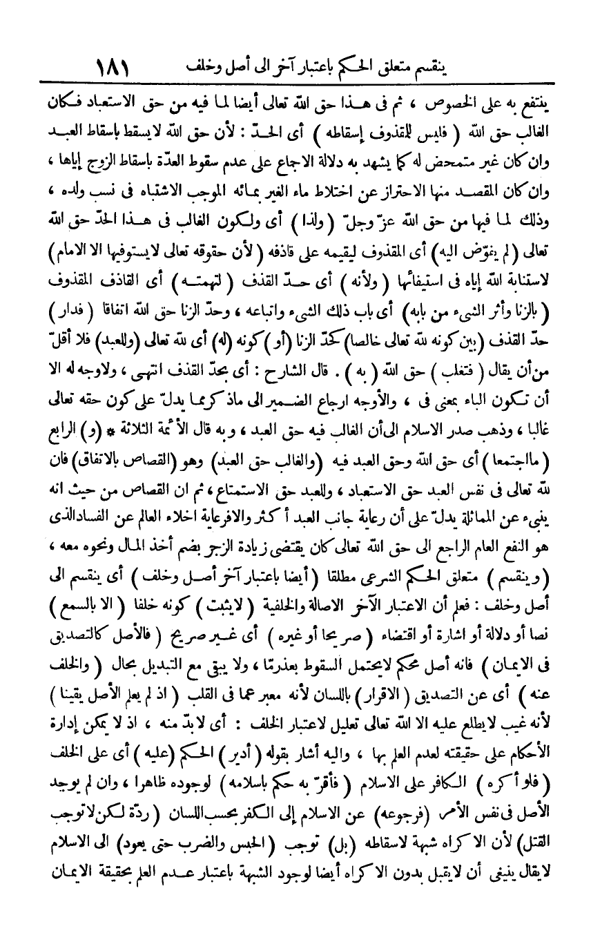 ينْتَفع بِهِ على الْخُصُوص، ثمَّ فِي هَذَا حق الله تَعَالَى أَيْضا لما فِيهِ من حق الاستعباد فَكَانَ الْغَالِب حق الله (فَلَيْسَ للمقذوف إِسْقَاطه) أَي الحدّ: لِأَن حق الله لَا يسْقط بِإِسْقَاط العَبْد وَإِن كَانَ غير متمحض لَهُ كَمَا يشْهد بِهِ دلَالَة الْإِجْمَاع على عدم سُقُوط العدّة بِإِسْقَاط الزَّوْج إِيَّاهَا، وَإِن كَانَ الْمَقْصد مِنْهَا الِاحْتِرَاز عَن اخْتِلَاط مَاء الْغَيْر بمائه الْمُوجب الِاشْتِبَاه فِي نسب وَلَده، وَذَلِكَ لما فِيهَا من حق الله عزّ وجلّ (وَلذَا) أَي وَلكَون الْغَالِب فِي هَذَا الحدّ حق الله تَعَالَى (وَلم يفوّض إِلَيْهِ) أَي الْمَقْذُوف ليقيمه على قَاذفه (لِأَن حُقُوقه تَعَالَى لَا يستوفيها إِلَّا الإِمَام) لاستنابة الله إِيَّاه فِي استيفائها (وَلِأَنَّهُ) أَي حدّ الْقَذْف (لتهمته) أَي الْقَاذِف الْمَقْذُوف (بِالزِّنَا وَأثر الشَّيْء من بَابه) أَي بَاب ذَلِك الشَّيْء واتباعه، وحدّ الزِّنَا حق الله اتِّفَاقًا (فدار) حدّ الْقَذْف (بَين كَونه لله تَعَالَى خَالِصا) كحدّ الزِّنَا (أَو) كَونه (لَهُ) أَي لله تَعَالَى (وَلِلْعَبْدِ) فَلَا أقلّ من أَن يُقَال (فتغلب) حق الله (بِهِ). قَالَ الشَّارِح: أَي بحدّ الْقَذْف انْتهى، وَلَا وَجه لَهُ إِلَّا أَن تكون الْبَاء بِمَعْنى فِي، وَالْأَوْجه إرجاع الضَّمِير إِلَى مَا ذكر مِمَّا يدلّ على كَون حَقه تَعَالَى غَالِبا، وَذهب صدر الْإِسْلَام إِلَى أَن الْغَالِب فِيهِ حق العَبْد، وَبِه قَالَ الْأَئِمَّة الثَّلَاثَة (و) الرَّابِع (مَا اجْتمعَا) أَي حق الله وَحقّ العَبْد فِيهِ (وَالْغَالِب حق العَبْد) وَهُوَ (الْقصاص بالِاتِّفَاقِ) فَإِن لله تَعَالَى فِي نفس العَبْد حق الاستعباد، وَلِلْعَبْدِ حق الِاسْتِمْتَاع، ثمَّ إِن الْقصاص من حَيْثُ أَنه يُنبئ عَن الْمُمَاثلَة يدلّ على أَن رِعَايَة جَانب العَبْد أَكثر والأفرعاية إخلاء الْعَالم عَن الْفساد الَّذِي هُوَ النَّفْع الْعَام الرَّاجِع إِلَى حق الله تَعَالَى كَانَ يَقْتَضِي زِيَادَة الزّجر بِضَم أَخذ المَال وَنَحْوه مَعَه، (وينقسم) مُتَعَلق الحكم الشَّرْعِيّ مُطلقًا (أَيْضا بِاعْتِبَار آخر أصل وَخلف) أَي يَنْقَسِم إِلَى أصل وَخلف: فَعلم أَن الِاعْتِبَار الآخر الْأَصَالَة والخلفية (لَا يثبت) كَونه خلفا (إِلَّا بِالسَّمْعِ) نصا أَو دلَالَة أَو إِشَارَة أَو اقْتِضَاء (صَرِيحًا أَو غَيره) أى غير صَرِيح (فَالْأَصْل كالتصديق فِي الْإِيمَان) فَإِنَّهُ أصل مُحكم لَا يحْتَمل السُّقُوط بِعُذْر مَا، وَلَا يبْقى مَعَ التبديل بِحَال (وَالْخلف عَنهُ) أَي عَن التَّصْدِيق (الْإِقْرَار) بِاللِّسَانِ لِأَنَّهُ معبر عَمَّا فِي الْقلب (إِذْ لم يعلم الأَصْل يَقِينا) لِأَنَّهُ غيب لَا يطلع عَلَيْهِ إِلَّا الله تَعَالَى تَعْلِيل لاعْتِبَار الْخلف: أَي لَا بدّ مِنْهُ، إِذْ لَا يُمكن إدارة الْأَحْكَام على حَقِيقَته لعدم الْعلم بهَا، وَإِلَيْهِ أَشَارَ بقوله (أدير) الحكم (عَلَيْهِ) أَي على الْخلف (فَلَو أكره) الْكَافِر على الْإِسْلَام (فأقرّ بِهِ حكم بِإِسْلَامِهِ) لوُجُوده ظَاهرا، وَإِن لم يُوجد الأَصْل فِي نفس الْأَمر (فرجوعه) عَن الْإِسْلَام إِلَى الْكفْر بِحَسب اللِّسَان (ردّة لَكِن لَا توجب الْقَتْل) لِأَن الْإِكْرَاه شُبْهَة لإسقاطه (بل) توجب (الْحَبْس وَالضَّرْب حَتَّى يعود) إِلَى الْإِسْلَام لَا يُقَال ينيغى أَن لَا يقبل بِدُونِ الْإِكْرَاه أَيْضا لوُجُود الشُّبْهَة بِاعْتِبَار عدم الْعلم بِحَقِيقَة الْأَيْمَان