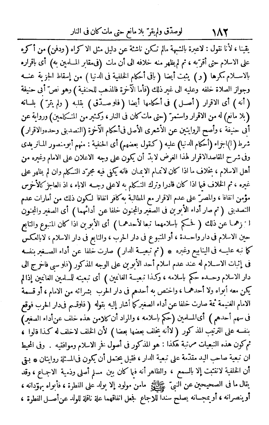 يَقِينا، لأَنا نقُول: لَا عِبْرَة بِالشُّبْهَةِ مَا لم تكن ناشئة عَن دَلِيل مثل الْإِكْرَاه (وَدفن) من أكره على الْإِسْلَام حَتَّى أقرّبه، ثمَّ لم يظْهر مِنْهُ خِلَافه إِلَى أَن مَاتَ (فِي مَقَابِر الْمُسلمين بِهِ) أَي بِإِقْرَارِهِ بِالْإِسْلَامِ مكْرها (و) يثبت أَيْضا (بَاقِي أَحْكَام الخلفية فِي الدُّنْيَا) من إِسْقَاط الْجِزْيَة عَنهُ وَجَوَاز الصَّلَاة خَلفه وَعَلِيهِ إِلَى غير ذَلِك (فَأَما الْآخِرَة فَالْمَذْهَب للحنفية) وَهُوَ نصّ أبي حنيفَة (أَنه) أَي الْإِقْرَار (أصل) فِي أَحْكَامهَا أَيْضا (فَلَو صدّق) بِقَلْبِه (وَلم يقرّ) بِلِسَانِهِ (بِلَا مَانع) لَهُ من الْإِقْرَار واستمرّ (حَتَّى مَاتَ كَانَ فِي النَّار، وَكثير من الْمُتَكَلِّمين) وَرِوَايَة عَن أبي حنيفَة، وَأَصَح الرِّوَايَتَيْنِ عَن الْأَشْعَرِيّ الأَصْل فِي أَحْكَام الْآخِرَة (التَّصْدِيق وَحده وَالْإِقْرَار) شَرط (ل) إِجْرَاء (أَحْكَام الدُّنْيَا) عَلَيْهِ (كَقَوْل بَعضهم) أَي الْحَنَفِيَّة: مِنْهُم أَبُو مَنْصُور الماتريدي وَفِي شرح الْمَقَاصِد الْإِقْرَار لهَذَا الْغَرَض لَا بدّ أَن يكون على وَجه الإعلان على الإِمَام وَغَيره من أهل الْإِسْلَام، بِخِلَاف مَا إِذا كَانَ لإتمام الْإِيمَان فَإِنَّهُ يَكْفِي فِيهِ مجرّد التَّكَلُّم وَإِن لم يظْهر على غَيره، ثمَّ الْخلاف فِيمَا إِذا كَانَ قَادِرًا وَترك التَّكَلُّم بِهِ لَا على وَجه الإباء، إِذْ الْعَاجِز كالأخرس مُؤمن اتِّفَاقًا، والمصرّ على عدم الْإِقْرَار مَعَ الْمُطَالبَة بِهِ كَافِر اتِّفَاقًا لكَون ذَلِك من أَمَارَات عدم التَّصْدِيق (ثمَّ صَار أَدَاء الْأَبَوَيْنِ فِي الصَّغِير وَالْمَجْنُون خلفا عَن أدائهما) أَي الصَّغِير وَالْمَجْنُون لعجزهما عَن ذَلِك (فَحكم بإسلامهما تبعا لأَحَدهمَا) أَي الْأَبَوَيْنِ إِذا كَانَ الْمَتْبُوع وَالتَّابِع حِين الْإِسْلَام فِي دَار وَاحِدَة، أَو الْمَتْبُوع فِي دَار الْحَرْب، وَالتَّابِع فِي دَار الْإِسْلَام، لَا بِالْعَكْسِ كَمَا نبه عَلَيْهِ فِي الْيَنَابِيع وَغَيره (ثمَّ تَبَعِيَّة الدَّار) صَارَت خلفا عَن أَدَاء الصَّغِير بِنَفسِهِ فِي إِثْبَات الْإِسْلَام لَهُ عِنْد عدم إِسْلَام أحد الْأَبَوَيْنِ على الْوَجْه الْمَذْكُور (فَلَو سبى فَأخْرج إِلَى دَار الْإِسْلَام وَحده حكم بِإِسْلَامِهِ، وَكَذَا تَبَعِيَّة الْغَانِمين) أَي تبعيته للْمُسلمين الْغَانِمين إِذا لم يكن مَعَه أَبَوَاهُ وَلَا أَحدهمَا، واختص بِهِ أحدهم فِي دَار الْحَرْب بِشِرَائِهِ من الإِمَام، أَو قسْمَة الإِمَام الْغَنِيمَة ثمَّة صَارَت خلفا عَن أَدَاء الصَّغِير كَمَا أَشَارَ إِلَيْهِ بقوله (فَلَو قسم فِي دَار الْحَرْب فَوَقع فِي سهم أحدهم) أَي الْمُسلمين (حكم بِإِسْلَامِهِ، وَالْمرَاد أَن كلا من هَذِه خلف عَن أَدَاء الصَّغِير) بِنَفسِهِ على التَّرْتِيب الْمَذْكُور (لَا أَنه يخلف بَعْضهَا بَعْضًا) لِأَن الْخلف لَا خلف لَهُ كَذَا قَالُوا، ثمَّ كَون هَذِه التبعيات مرتبَة هَكَذَا: هُوَ الْمَذْكُور فِي أصُول فَخر الْإِسْلَام وموافقيه. وَفِي الْمُحِيط أَن تَبَعِيَّة صَاحب الْيَد مقدّمة على تَبَعِيَّة الدَّار، فَقيل يحْتَمل أَن يكون فِي المسئلة رِوَايَتَانِ بَقِي أَن الخلفية لَا تتثبت إِلَّا بِالسَّمْعِ، وَالظَّاهِر إِنَّه فِيمَا كَانَ بَين مُسلم أُصَلِّي وذمية الْإِجْمَاع، وَقد يُقَال مَا فِي الصَّحِيحَيْنِ عَن النَّبِي صلى الله عَلَيْهِ وَسلم مَا من مَوْلُود إِلَّا يُولد على الْفطْرَة، فَأَبَوَاهُ يهوّدانه، أَو ينصرَانِهِ، أَو يُمَجِّسَانِهِ يصلح سندا للْإِجْمَاع فَجعل اتِّفَاقهمَا عِلّة ناقلة للْوَلَد عَن أصل الْفطْرَة،
