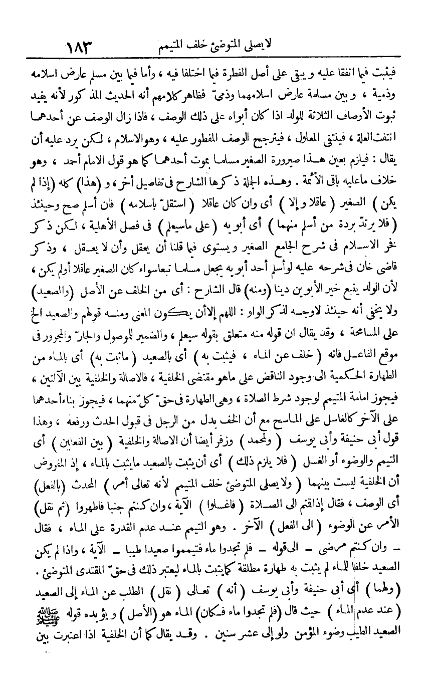 فَيثبت فِيمَا اتفقَا عَلَيْهِ وَيبقى على أصل الْفطْرَة فِيمَا اخْتلفَا فِيهِ، وَأما فِيمَا بَين مُسلم عَارض إِسْلَامه وذمية، وَبَين مسلمة عَارض إسلامهما وذميّ فَظَاهر كَلَامهم أَنه الحَدِيث الْمَذْكُور لِأَنَّهُ يُفِيد ثُبُوت الْأَوْصَاف الثَّلَاثَة للْوَلَد إِذا كَانَ أَبَوَاهُ على ذَلِك الْوَصْف، فَإِذا زَالَ الْوَصْف عَن أَحدهمَا انْتَفَت الْعلَّة، فينتفى الْمَعْلُول، فيترجح الْوَصْف المفطور عَلَيْهِ، وَهُوَ الْإِسْلَام، لَكِن يرد عَلَيْهِ أَن يُقَال: فليزم بِعَين هَذَا صيرورة الصَّغِير مُسلما بِمَوْت أَحدهمَا كَمَا هُوَ قَول الإِمَام أَحْمد، وَهُوَ خلاف مَا عَلَيْهِ بَاقِي الْأَئِمَّة. وَهَذِه الْجُمْلَة ذكرهَا الشَّارِح فِي تفاصيل أخر، و (هَذَا) كُله (إِذا لم يكن) الصَّغِير (عَاقِلا وَإِلَّا) أَي وَإِن كَانَ عَاقِلا (استقلّ بِإِسْلَامِهِ) فَإِن أسلم صَحَّ وَحِينَئِذٍ (فَلَا يرتدّ بردة من أسلم مِنْهُمَا) أَي أَبَوَيْهِ (على مَا سَيعْلَمُ) فِي فصل الْأَهْلِيَّة، لَكِن ذكر فَخر الْإِسْلَام فِي شرح الْجَامِع الصَّغِير وَيَسْتَوِي فِيمَا قُلْنَا أَن يعقل وَأَن لَا يعقل، وَذكر قَاضِي خَان فِي شَرحه عَلَيْهِ لَو أسلم أحد أَبَوَيْهِ يَجْعَل مُسلما تبعا سَوَاء كَانَ الصَّغِير عَاقِلا أَو لم يكن، لِأَن الْوَلَد يتبع خير الْأَبَوَيْنِ دينا (وَمِنْه) قَالَ الشَّارِح: أَي من الْخلف عَن الأَصْل (والصعيد) وَلَا يخفى أَنه حِينَئِذٍ لَا وَجه لذكر الْوَاو: اللَّهُمَّ إِلَّا أَن يكون الْمَعْنى وَمِنْه قَوْلهم والصعيد الخ على الْمُسَامحَة، وَقد يُقَال أَن قَوْله مِنْهُ مُتَعَلق بقوله سَيعْلَمُ، وَالضَّمِير للموصول والجارّ وَالْمَجْرُور فِي موقع الْفَاعِل فَإِنَّهُ (خلف عَن المَاء، فَيثبت بِهِ) أَي بالصعيد (مَا ثَبت بِهِ) أَي بِالْمَاءِ من الطَّهَارَة الْحكمِيَّة إِلَى وجود الناقض على مَا هُوَ مُقْتَضى الخلفية، فالأصالة والخلفية بَين الآلتين، فَيجوز إِمَامَة الْمُتَيَمم لوُجُود شَرط الصَّلَاة، وَهِي الطَّهَارَة فِي حق كلّ مِنْهُمَا، فَيجوز بِنَاء أَحدهمَا على الآخر كالغاسل على الماسح مَعَ أَن الْخُف بدل من الرجل فِي قبُول الْحَدث وَرَفعه، وَهَذَا قَول أبي حنيفَة وَأبي يُوسُف (ولمحمد) وَزفر أَيْضا أَن الْأَصَالَة والخلفية (بَين الْفِعْلَيْنِ) أَي التَّيَمُّم وَالْوُضُوء أَو الْغسْل (فَلَا يلْزم ذَلِك) أَي أَن يثبت بالصعيد مَا يثبت بِالْمَاءِ، إِذْ الْمَفْرُوض أَن الْخَلِيفَة لَيست بَينهمَا (وَلَا يُصَلِّي الْمُتَوَضِّئ خلف الْمُتَيَمم لِأَنَّهُ تَعَالَى أَمر) الْمُحدث (بِالْفِعْلِ) أَي الْوَصْف، فَقَالَ إِذا قُمْتُم إِلَى الصَّلَاة (فَاغْسِلُوا) الْآيَة، وَإِن كُنْتُم جنبا فاطهروا (ثمَّ نقل) الْأَمر عَن الْوضُوء (إِلَى الْفِعْل) الآخر. وَهُوَ التَّيَمُّم عِنْد عدم الْقُدْرَة على المَاء، فَقَالَ - {وَإِن كُنْتُم مرضى} - إِلَى قَوْله - {فَلم تَجدوا مَاء فَتَيَمَّمُوا صَعِيدا طيبا} - الْآيَة، وَإِذا لم يكن الصَّعِيد خلفا للْمَاء لم يثبت بِهِ طَهَارَة مُطلقَة كَمَا يثبت بِالْمَاءِ ليعتبر ذَلِك فِي حقّ المقتدى الْمُتَوَضِّئ (وَلَهُمَا) أَي أبي حنيفَة وَأبي يُوسُف (أَنه) تَعَالَى (نقل) الطّلب عَن المَاء إِلَى الصَّعِيد (عِنْد عدم المَاء) حَيْثُ قَالَ (فَلم تَجدوا مَاء فَكَانَ) المَاء هُوَ (الأَصْل) وَيُؤَيِّدهُ قَوْله صلى الله عَلَيْهِ وَسلم الصَّعِيد الطّيب وضوء الْمُؤمن وَلَو إِلَى عشر سِنِين. وَقد يُقَال كَمَا أَن الخلفية إِذا اعْتبرت بَين