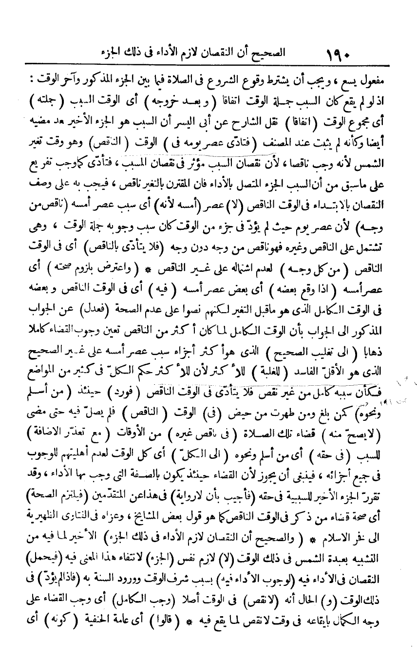 مفعول يسع، وَيجب أَن يشْتَرط وُقُوع الشُّرُوع فِي الصَّلَاة فِيمَا بَين الْجُزْء الْمَذْكُور وَآخر الْوَقْت: إِذْ لَو لم يَقع كَانَ السَّبَب جملَة الْوَقْت اتِّفَاقًا (وَبعد خُرُوجه) أَي الْوَقْت السَّبَب (جملَته) أَي مَجْمُوع الْوَقْت (اتِّفَاقًا) نقل الشَّارِح عَن أبي الْيُسْر أَن السَّبَب هُوَ الْجُزْء الْأَخير بعد مضيه أَيْضا وَكَأَنَّهُ لم يثبت عِنْد المُصَنّف (فتأدّى عصر يَوْمه فِي) الْوَقْت (النَّاقِص) وَهُوَ وَقت تغير الشَّمْس لِأَنَّهُ وَجب نَاقِصا، لِأَن نُقْصَان السَّبَب مُؤثر فِي نُقْصَان الْمُسَبّب، فتأدّى كَمَا وَجب تَفْرِيع على مَا سبق من أَن السَّبَب الْجُزْء الْمُتَّصِل بِالْأَدَاءِ فَإِن المقترن بالتغير نَاقص، فَيجب بِهِ على وصف النُّقْصَان بِالِابْتِدَاءِ فِي الْوَقْت النَّاقِص (لَا) عصر (أمسه لِأَنَّهُ) أَي سَبَب عصر أمسه (نَاقص من وَجه) لِأَن عصر يَوْم حَيْثُ لم يؤدّ فِي جُزْء من الْوَقْت كَانَ سَبَب وُجُوبه جملَة الْوَقْت، وَهِي تشْتَمل على النَّاقِص وَغَيره فَهُوَ نَاقص من وَجه دون وَجه (فَلَا يتَأَدَّى بالناقص) أى فِي الْوَقْت النَّاقِص (من كل وَجه) لعدم اشتماله على غير النَّاقِص (وَاعْترض بِلُزُوم صِحَّته) أَي عصر أمسه (إِذا وَقع بعضه) أَي بعض عصر أمسه (فِيهِ) أَي فِي الْوَقْت النَّاقِص وَبَعضه فِي الْوَقْت الْكَامِل الَّذِي هُوَ مَا قبل التَّغَيُّر لكِنهمْ نصوا على عدم الصِّحَّة (فَعدل) عَن الْجَواب الْمَذْكُور إِلَى الْجَواب بِأَن الْوَقْت الْكَامِل لما كَانَ أَكثر من النَّاقِص تعين وجوب الْقَضَاء كَامِلا ذَهَابًا (إِلَى تَغْلِيب الصَّحِيح) الَّذِي هُوَ أَكثر أَجزَاء سَبَب عصر أمسه على غير الصَّحِيح الَّذِي هُوَ الأقلّ الْفَاسِد (للغلبة) للْأَكْثَر لِأَن للْأَكْثَر حكم الكلّ فِي كثير من الْمَوَاضِع فَكَأَن سَببه كَامِل من غير نقص فَلَا يتأدّى فِي الْوَقْت النَّاقِص (فورد) حِينَئِذٍ (من أسلم وَنَحْوه) كمن بلغ وَمن طهرت من حيض (فِي) الْوَقْت (النَّاقِص) فَلم يصلّ فِيهِ حَتَّى مضى (لَا يصحّ مِنْهُ) قَضَاء تِلْكَ الصَّلَاة (فِي نَاقص غَيره) من الْأَوْقَات (مَعَ تعذّر الْإِضَافَة) للسبب (فِي حَقه) أَي من أسلم وَنَحْوه (إِلَى الكلّ) أَي كل الْوَقْت لعدم أهليتهم للْوُجُوب فِي جَمِيع أَجْزَائِهِ، فَيَنْبَغِي أَن يجوز لِأَن الْقَضَاء حِينَئِذٍ يكون بِالصّفةِ الَّتِي وَجب بهَا الْأَدَاء، وَقد تقرّر الْجُزْء الْأَخير للسَّبَبِيَّة فِي حَقه (فَأُجِيب بِأَن لَا رِوَايَة) فِي هَذَا عَن الْمُتَقَدِّمين (فيلتزم الصِّحَّة) أَي صِحَة قَضَاء من ذكر فِي الْوَقْت النَّاقِص كَمَا هُوَ قَول بعض الْمَشَايِخ، وَعَزاهُ فِي الْفَتَاوَى الظَّهِيرِيَّة إِلَى فَخر الْإِسْلَام (وَالصَّحِيح أَن النُّقْصَان لَازم الْأَدَاء فِي ذَلِك الْجُزْء) الْأَخير لما فِيهِ من التَّشْبِيه بعبدة الشَّمْس فِي ذَلِك الْوَقْت (لَا) لَازم نفس (الْجُزْء) لانْتِفَاء هَذَا الْمَعْنى فِيهِ (فَيحمل) النُّقْصَان فِي الْأَدَاء فِيهِ (لوُجُوب الْأَدَاء فِيهِ) بِسَبَب شرف الْوَقْت وورود السّنة بِهِ (فَإِذا لم يؤدّ) فِي ذَلِك الْوَقْت (و) الْحَال أَنه (لَا نقص) فِي الْوَقْت أصلا (وَجب الْكَامِل) أَي وَجب الْقَضَاء على وَجه الْكَمَال بإيقاعه فِي وَقت لَا نقص لما يَقع فِيهِ (قَالُوا) أَي عَامَّة الْحَنَفِيَّة (كَونه) أَي