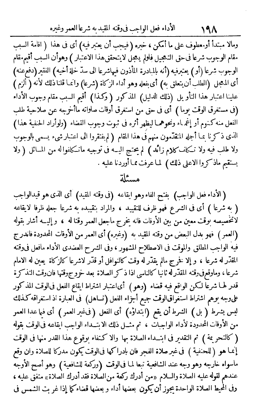 (الْأَدَاء فعل الْوَاجِب) بِفَتْح الْفَاء وَهُوَ إِيقَاعه (فِي وقته الْمُقَيد) أَي الَّذِي هُوَ قيد الْوَاجِب (بِهِ شرعا) أَي فِي الشَّرْع فَهُوَ ظرف للتَّقْيِيد، وَالْمرَاد بتقييده بِهِ شرعا جعله ظرفا لإيقاعه لَا تَخْصِيصه بِوَقْت معِين من بَين الْأَوْقَات فَإِنَّهُ يخرج مَا جعل الْعُمر وقتا لَهُ، وَإِلَيْهِ أَشَارَ بقوله (الْعُمر) فَهُوَ بدل الْبَعْض من وقته الْمُقَيد بِهِ (وَغَيره) أَي الْعُمر من الْأَوْقَات المحدودة فاندرج فِيهِ الْوَاجِب الْمُطلق والموقت فِي الِاصْطِلَاح الْمَشْهُور، وَفِي الشَّرْح العضدي الْأَدَاء مَا فعل فِي وقته الْمُقدر لَهُ شرعا، وَإِلَّا فَخرج مَا لم يقدر لَهُ وَقت كالنوافل أَو قدر لَا شرعا كَالزَّكَاةِ يعين لَهُ الإِمَام شرعا، وَمَا وَقع فِي وقته الْمُقدر لَهُ ثَانِيًا كالناسي إِذا ذكر الصَّلَاة بعد خُرُوج وَقتهَا فَإِن وَقت التَّذْكِرَة قدر لَهَا شرعا لَكِن الْوَاقِع فِيهِ قَضَاء (وَهُوَ) أَي اعْتِبَار اشْتِرَاط إِيقَاع الْفِعْل فِي الْوَقْت الْمَذْكُور على وَجه يُوهم اشْتِرَاط استغراق الْوَقْت جَمِيع أَجزَاء الْفِعْل (تساهل) فِي الْعبارَة إِذا استغراقه كَذَلِك لَيْسَ بِشَرْط (بل) الشَّرْط أَن يَقع (ابتداؤه) أَي الْفِعْل (فِي غير الْعُمر) أَي فِيمَا عدا الْعُمر من الْأَوْقَات المحدودة لأَدَاء الْوَاجِبَات، ثمَّ مثل ذَلِك الِابْتِدَاء الْوَاجِب إِيقَاعه فِي الْوَقْت بقوله (كالتحريمة) ثمَّ التَّقْدِير فِي ابْتِدَاء الصَّلَاة بهَا والاكتفاء بِوُقُوع هَذَا الْقدر مِنْهَا فِي الْوَقْت إِنَّمَا هُوَ (للحنفية) فِي غير صَلَاة الْفجْر فَإِن بإدراكها فِي الْوَقْت يكون مدْركا للصَّلَاة وَإِن وَقع مَا سواهُ خَارجه وَهُوَ وَجه عِنْد الشَّافِعِيَّة تبعا لما فِي الْوَقْت (وركعة للشَّافِعِيَّة) وَهُوَ أصح الْأَوْجه عِنْدهم لقَوْله صلى الله عَلَيْهِ وَسلم " من أدْرك رَكْعَة من الصَّلَاة فقد أدْرك الصَّلَاة " مُتَّفق عَلَيْهِ، وَفِي الْمُحِيط الصَّلَاة الْوَاحِدَة يجوز أَن يكون بَعْضهَا أَدَاء وَبَعضهَا قَضَاء كَمَا إِذا غربت الشَّمْس فِي